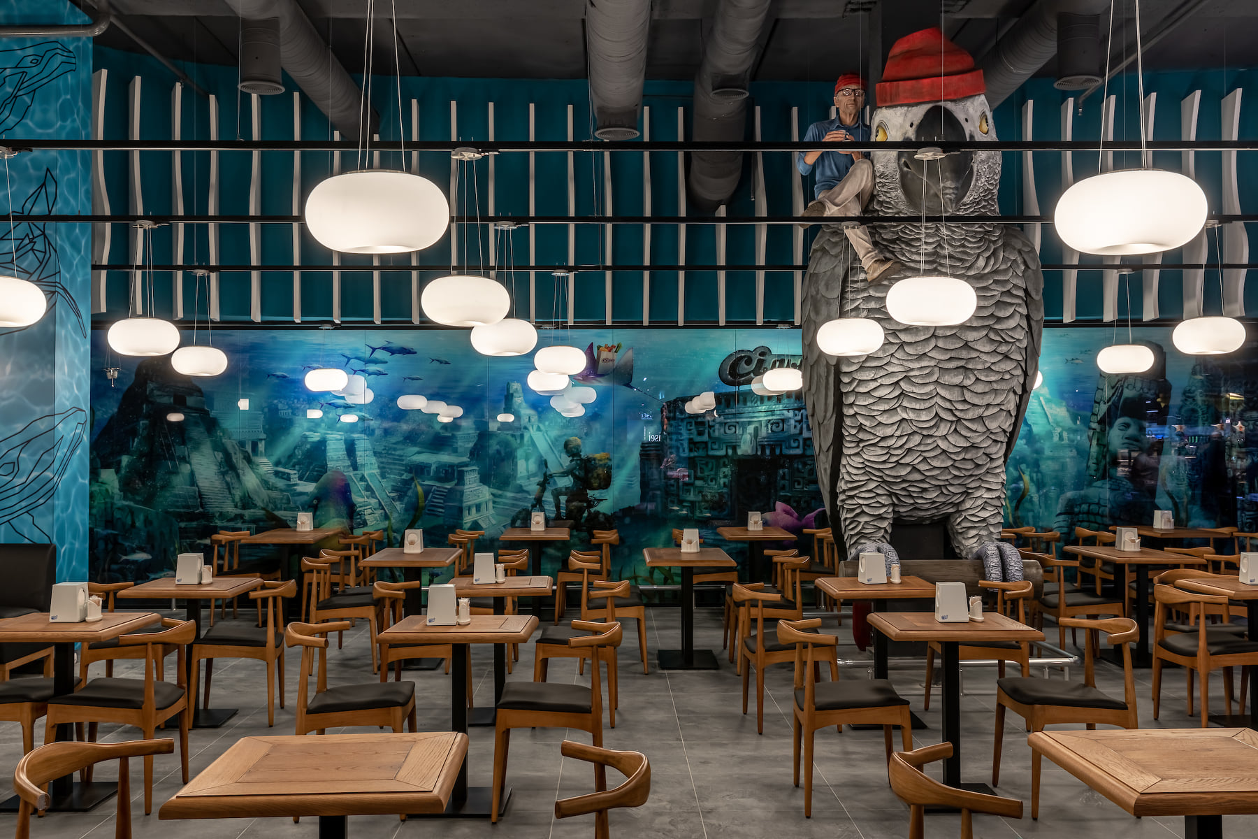 Концепция воспроизведена в морском стиле, а главные герои дизайн-истории – огромные киты.