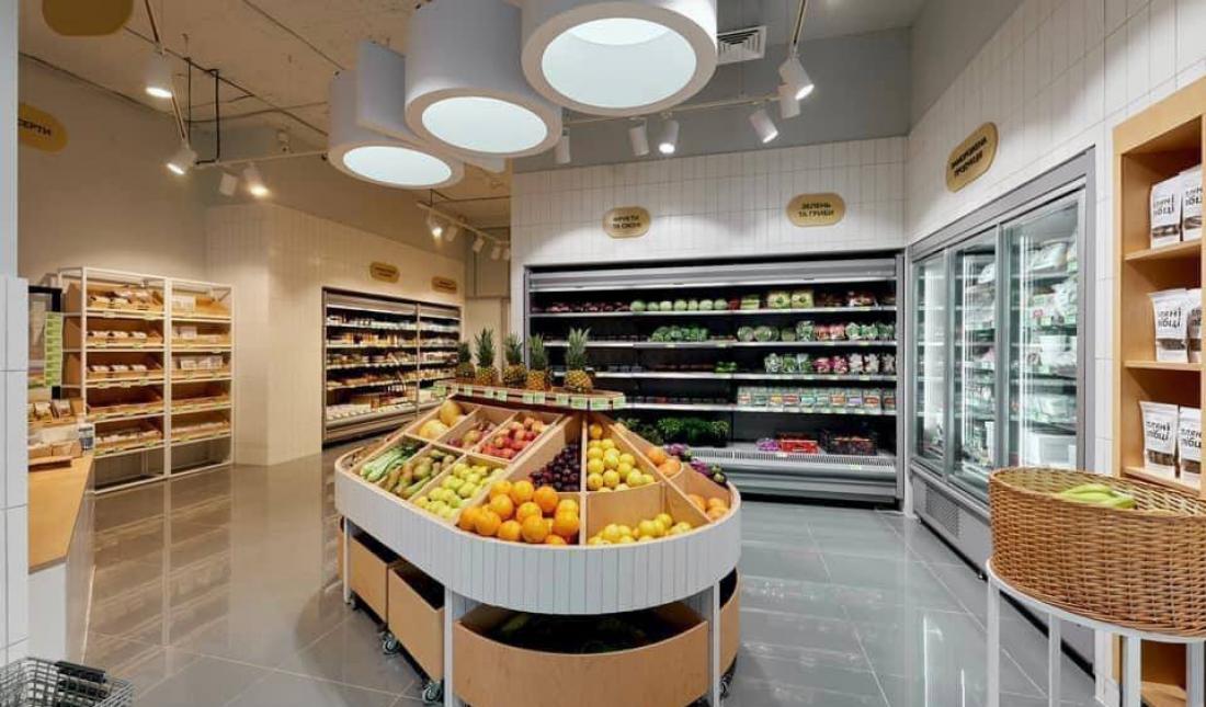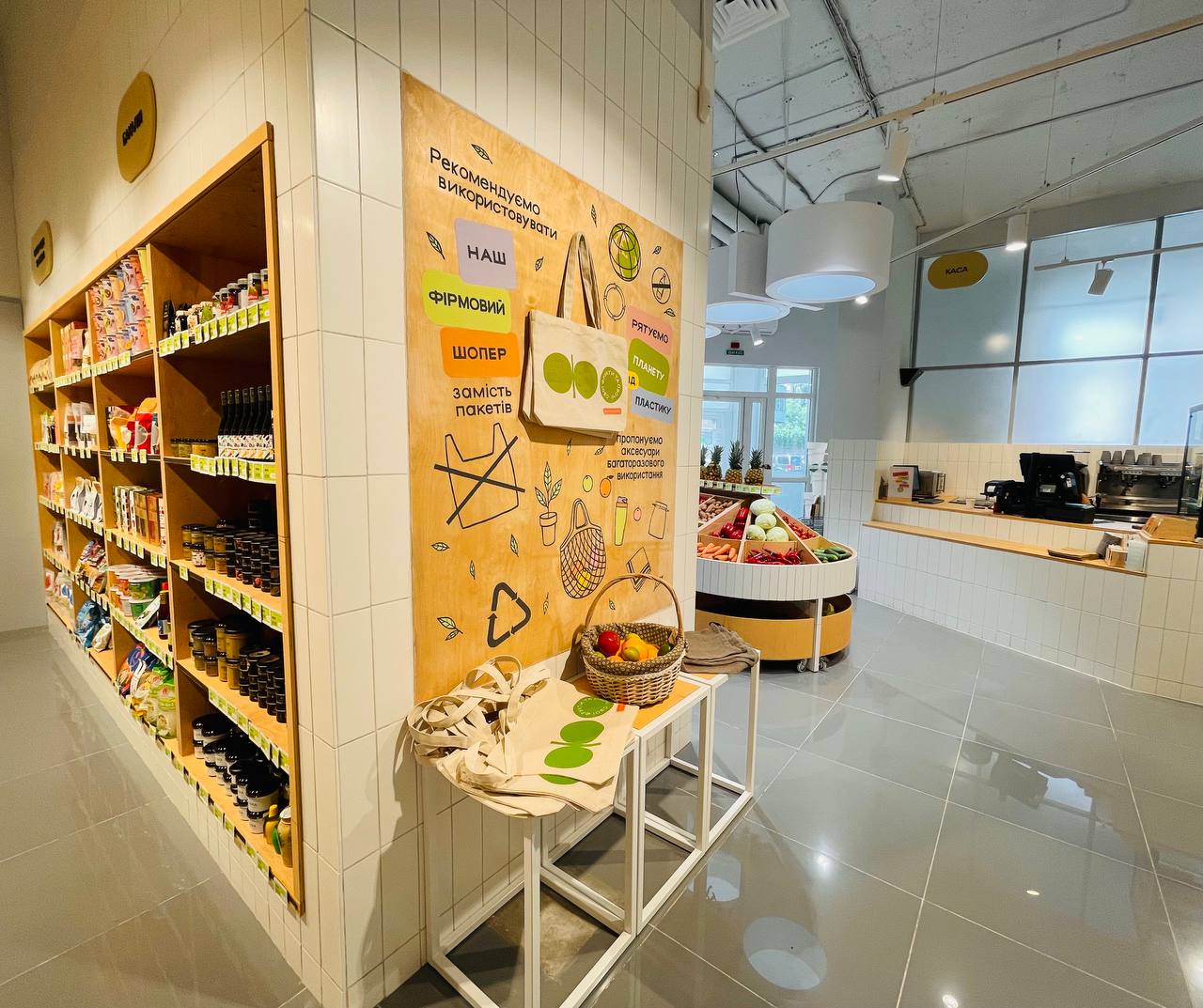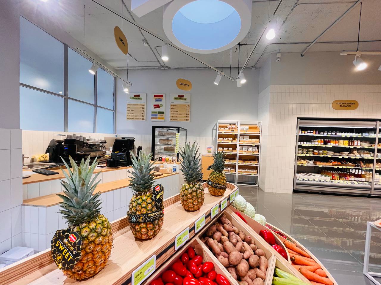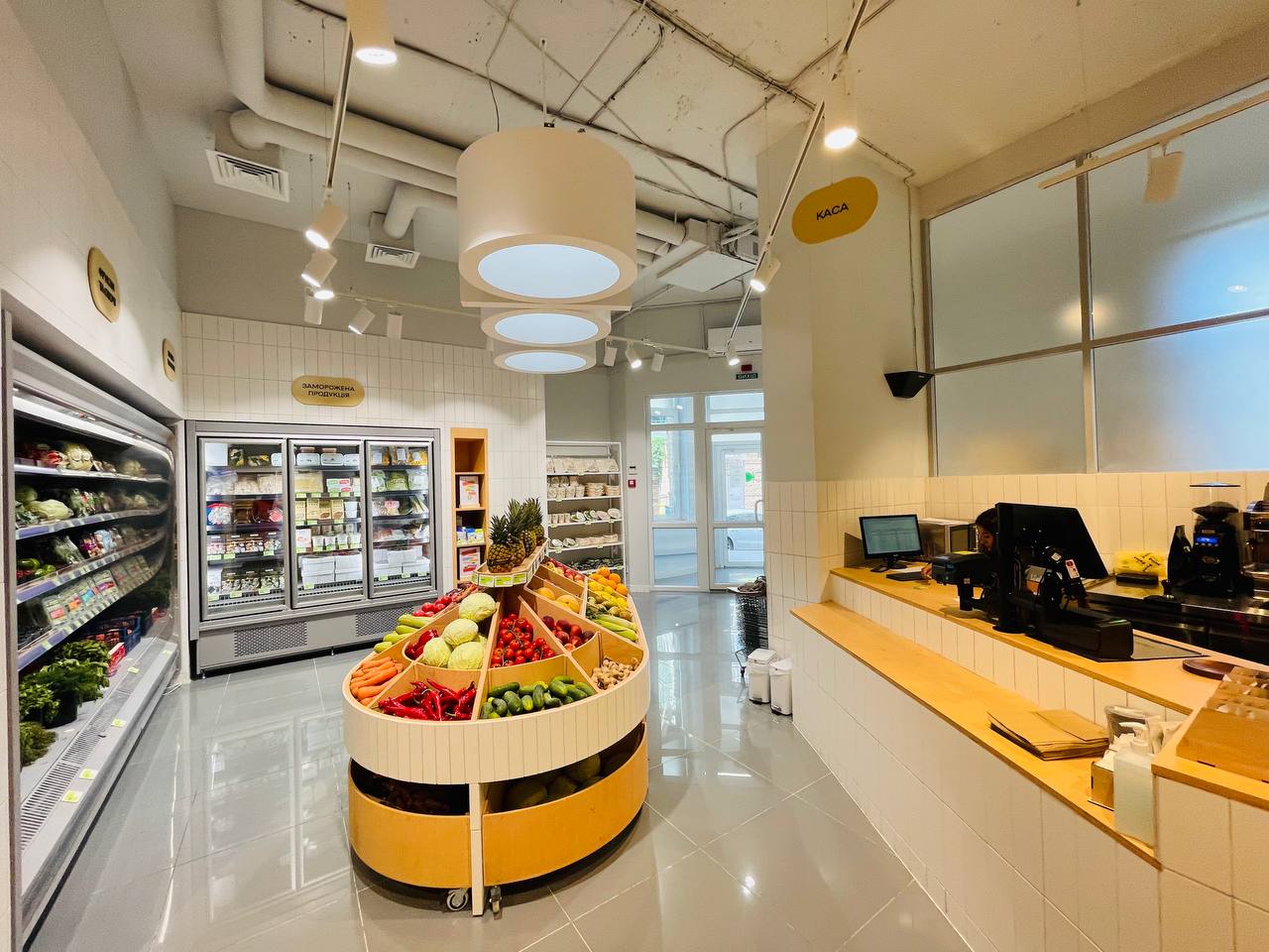 Дизайн-концепция ФО транслирует идею бренда здоровой еды с помощью светлого интерьера, с использованием натуральных материалов теплых оттенков. В магазине нет товара в ногах, торговый зал хорошо просматривается со всех сторон, нет урезанных проходов. "Мы хотели дать гостям ощущение "больше воздуха", следуя ведущему тренду в мировом ритейл дизайне", — рассказала Юлия Дзюба.