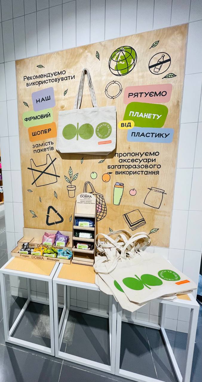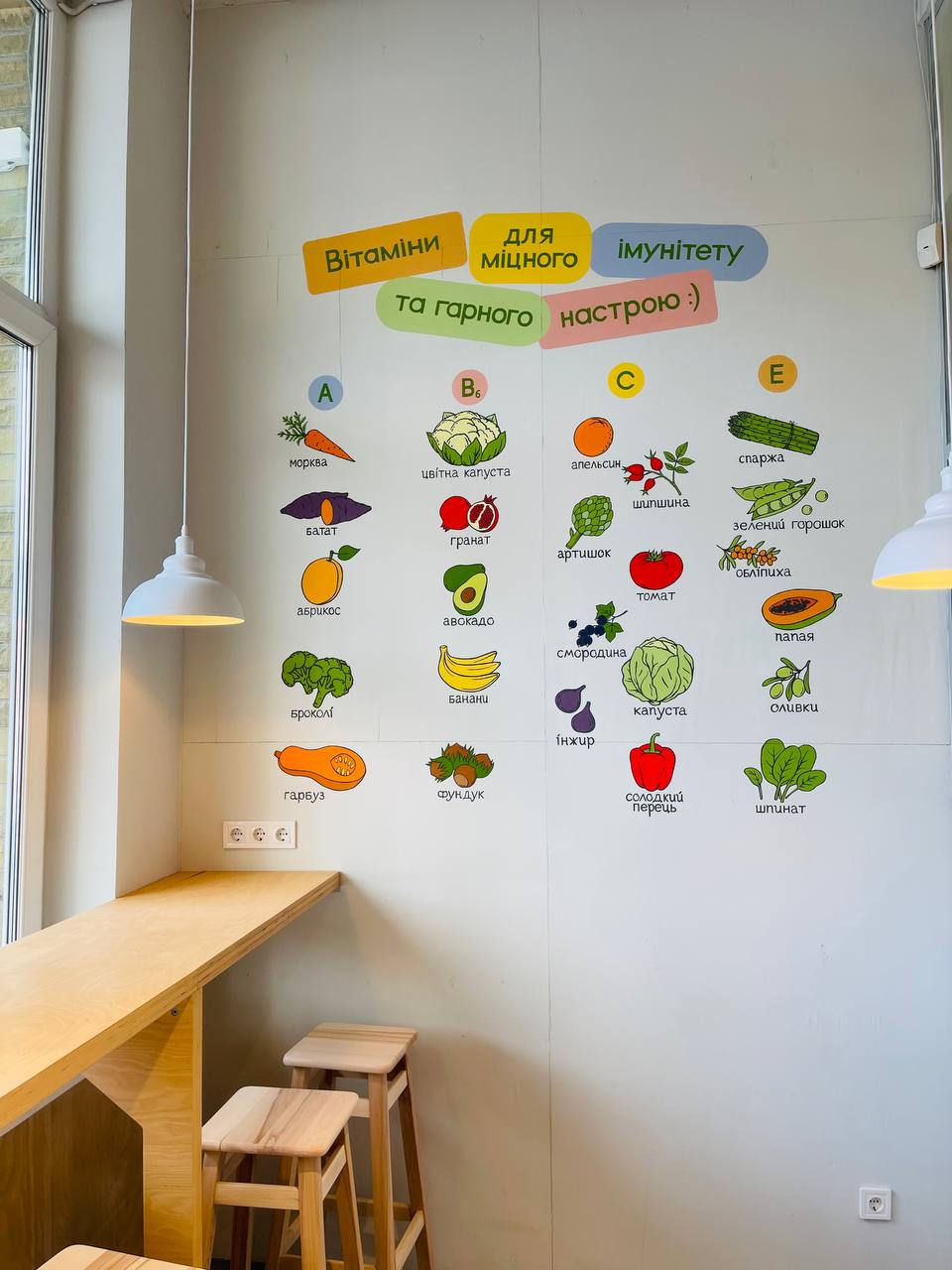 Еще одна особенность — сторителлинг — это специально разработанная авторская художественная роспись стен, с помощью которой бренд знакомит гостей с продуктом. Одна стена является промо зоной и “продает” фирменный шоппер и эко аксессуары. Вторая - поддерживает ключевую категорию фруктов и овощей и в веселой форме подсказывает, в каких овощах и фруктах содержатся витамины.