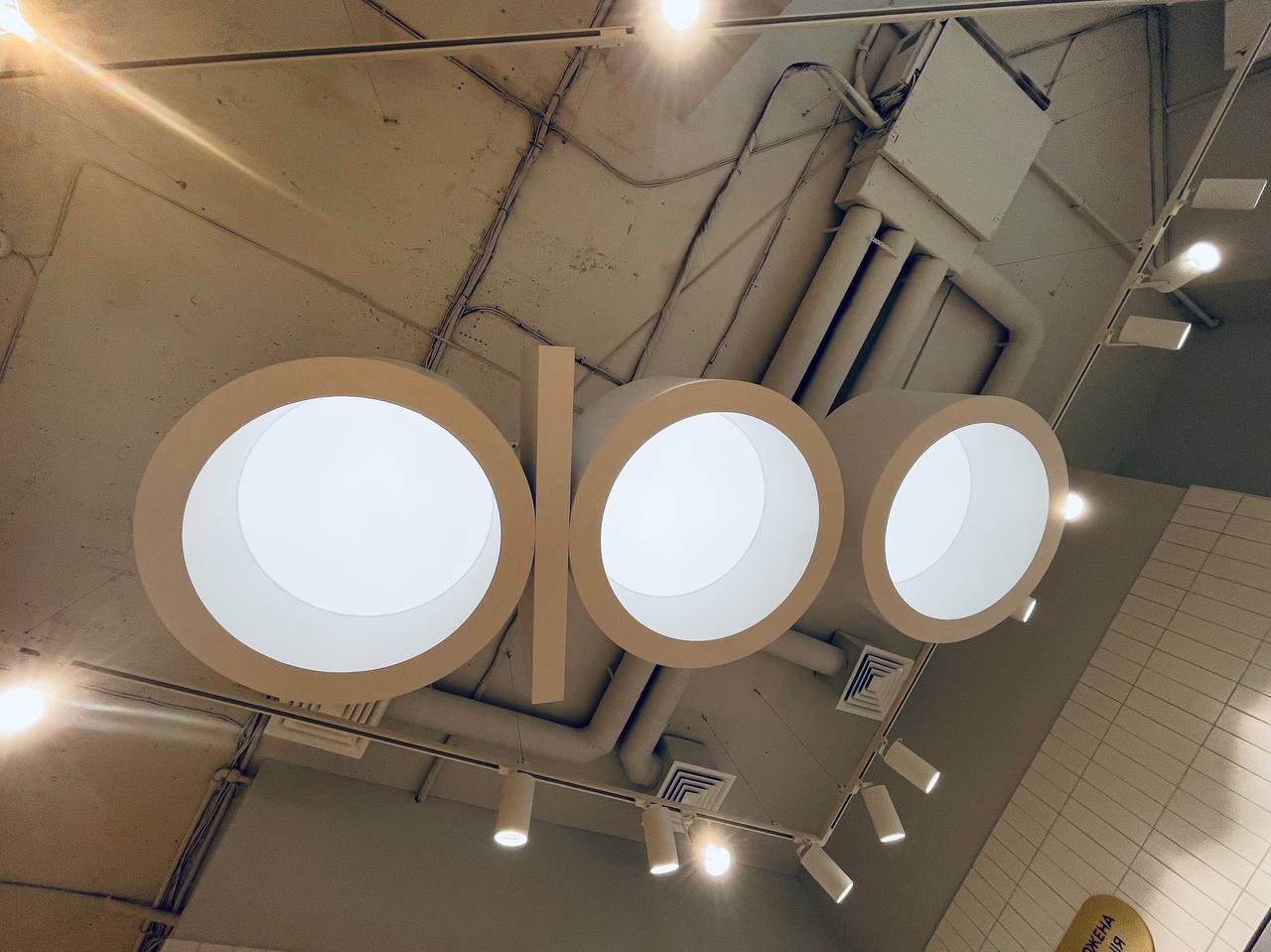 В интерьере использованы интересные приемы для оформления. Зона с фирменным островом с овощами и фруктами и расположенная над ним вывеска-люстра в форме логотипа ФО по задумке имеют единые формы — это креативный способ сделать интерьер и оборудование продолжением брендинга.