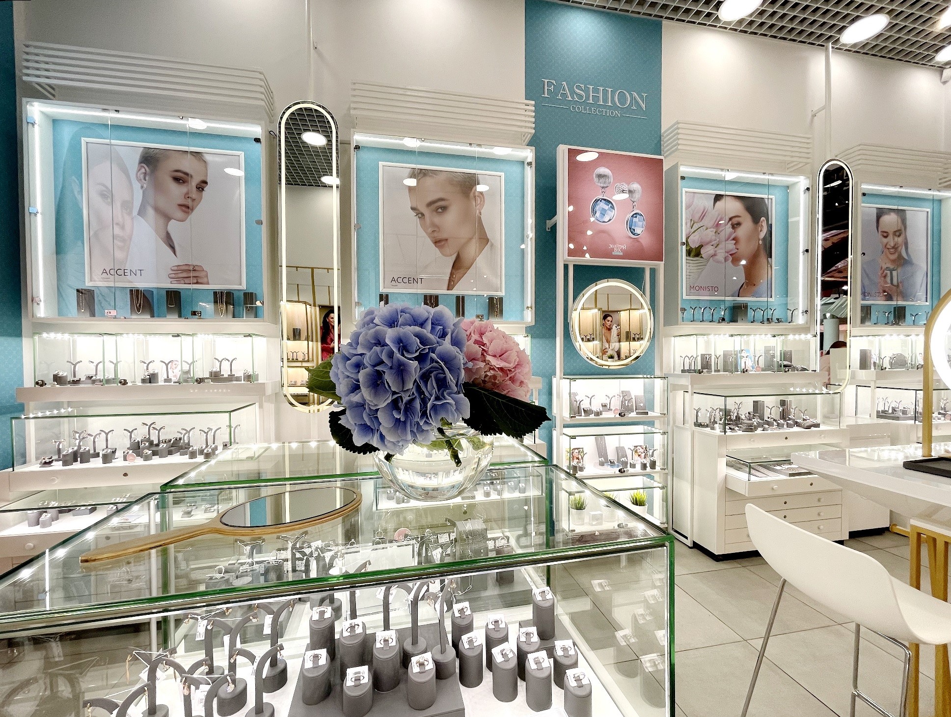 Специальное зонирование разделяет пространство магазина на две части: в одной представлены fashion-коллекции бренда, в другой - классические золотые украшения с бриллиантами, сапфирами, гранатами, изумрудами и другими драгоценными камнями.