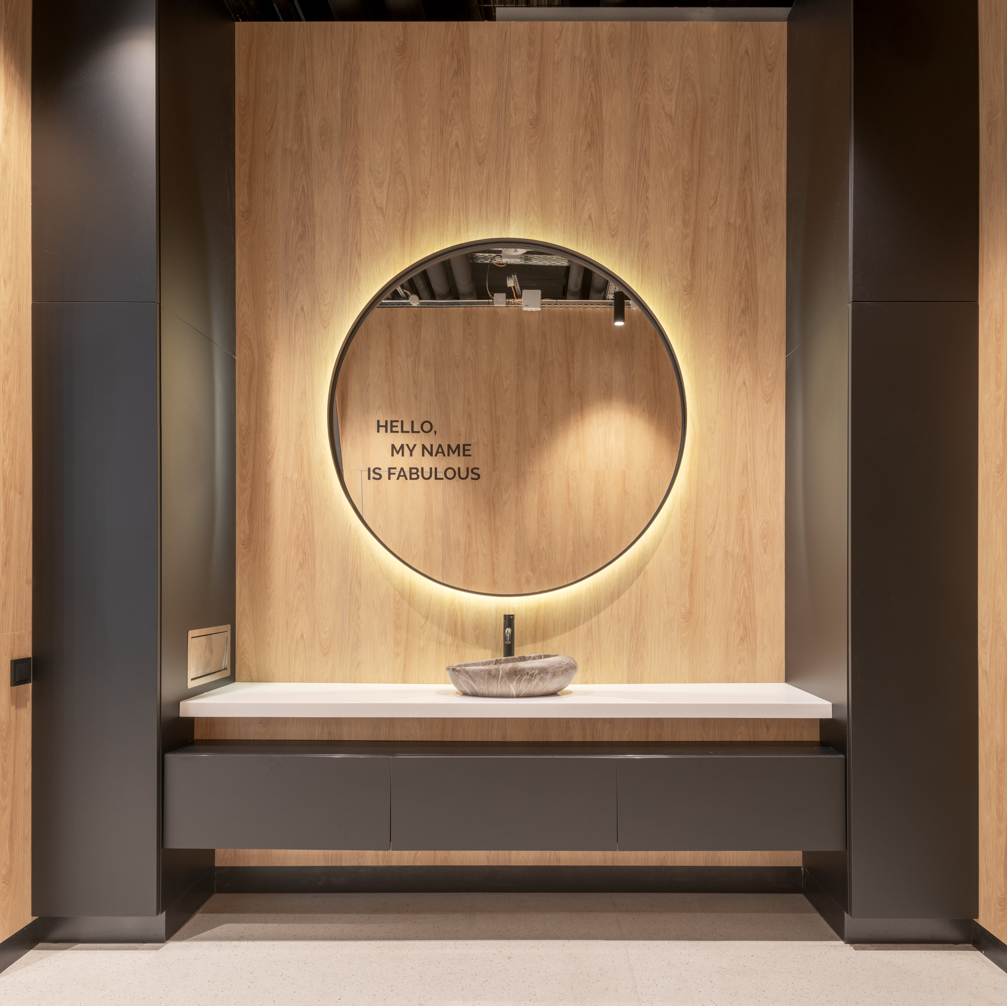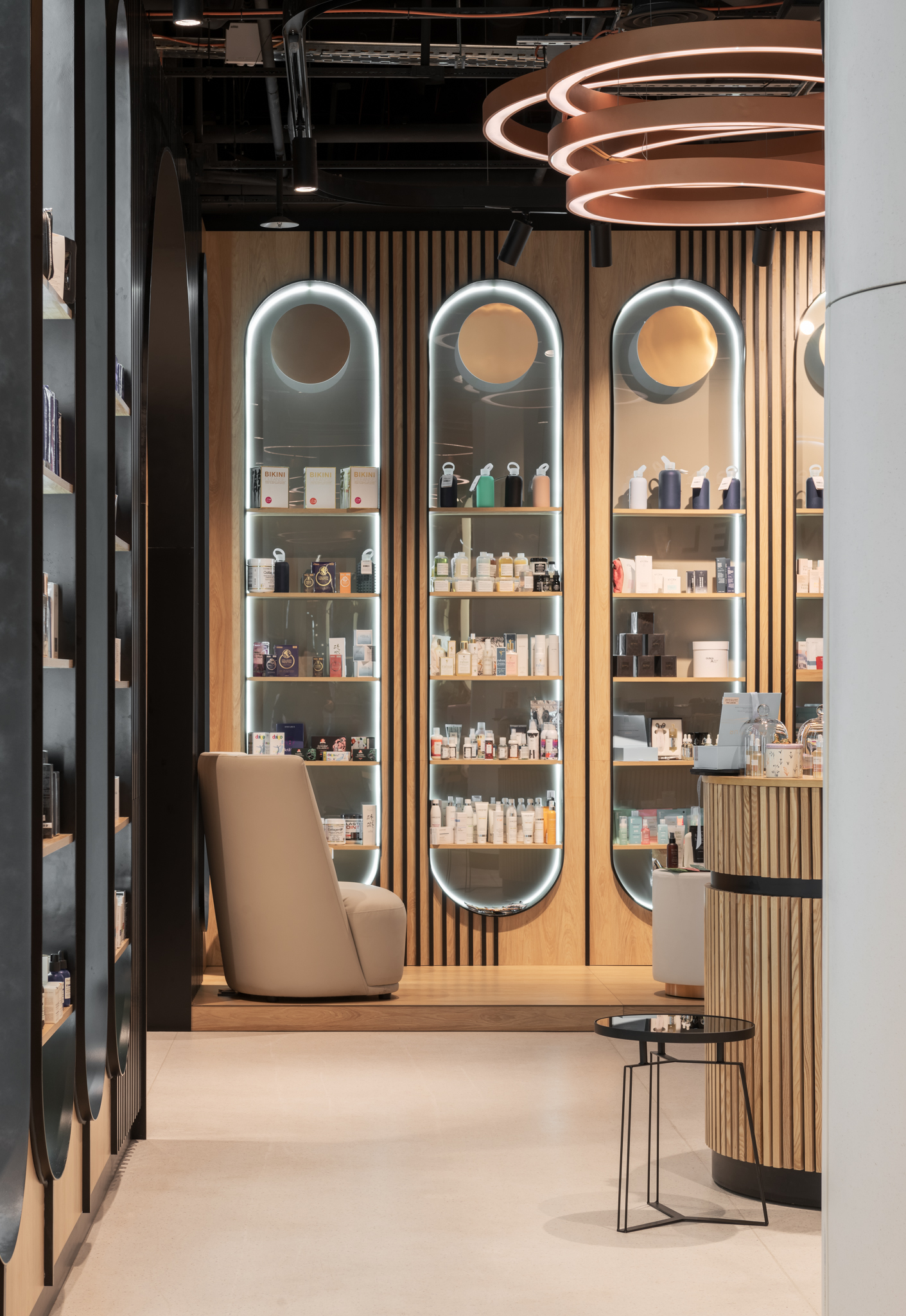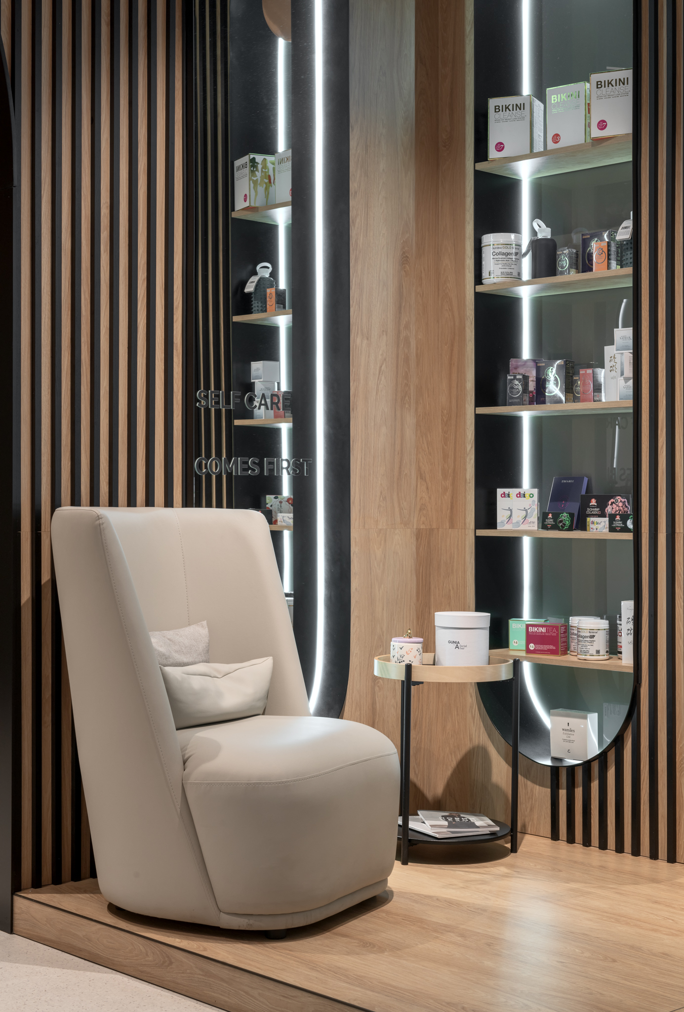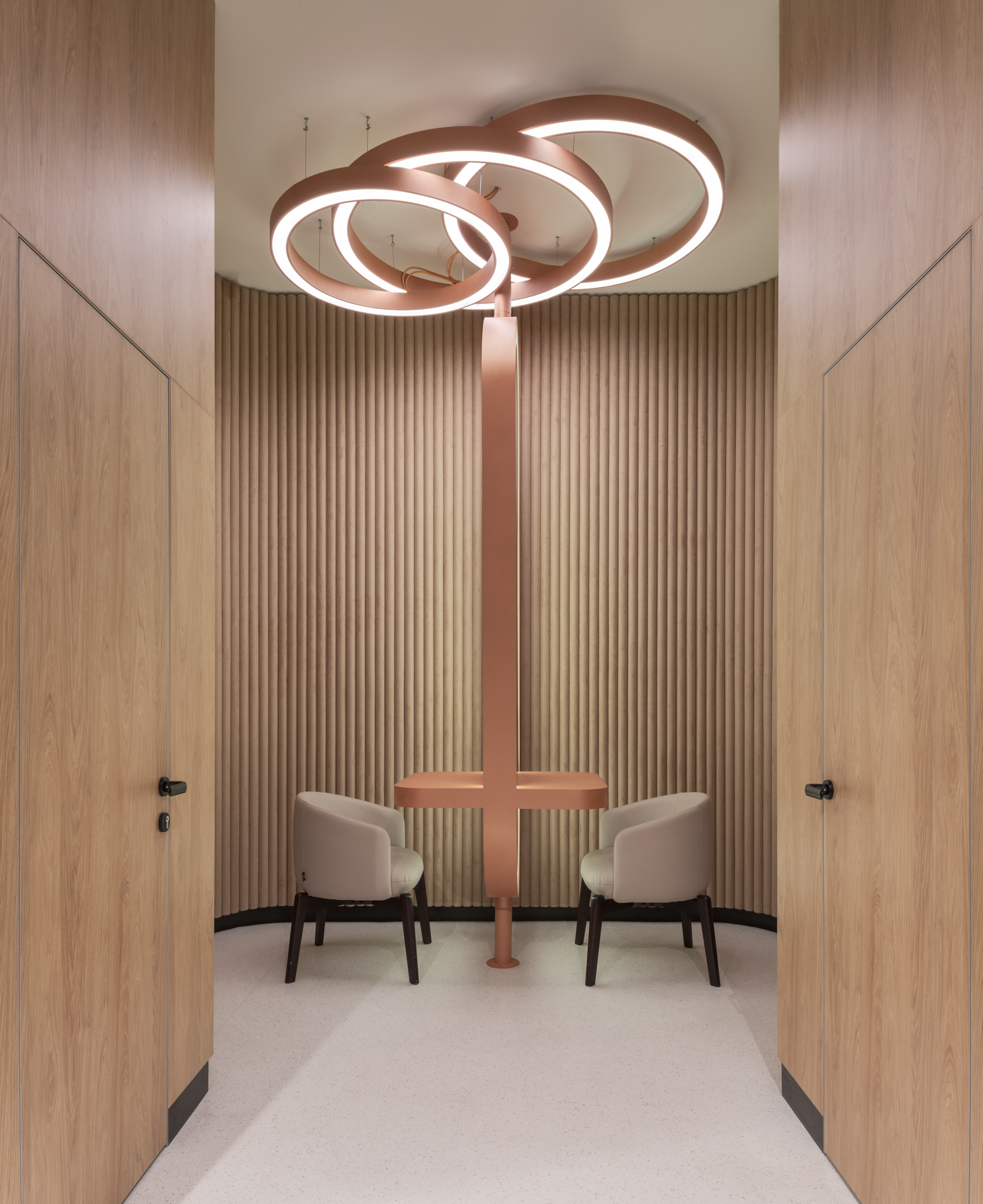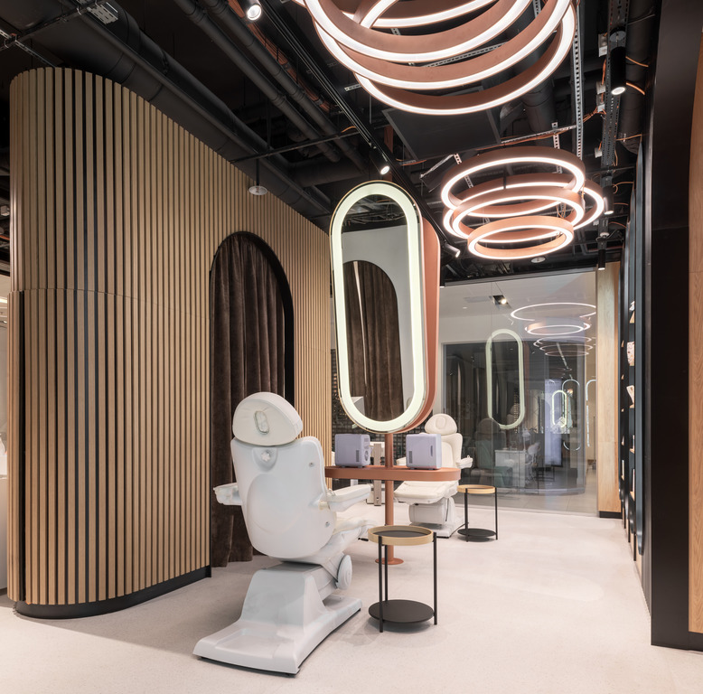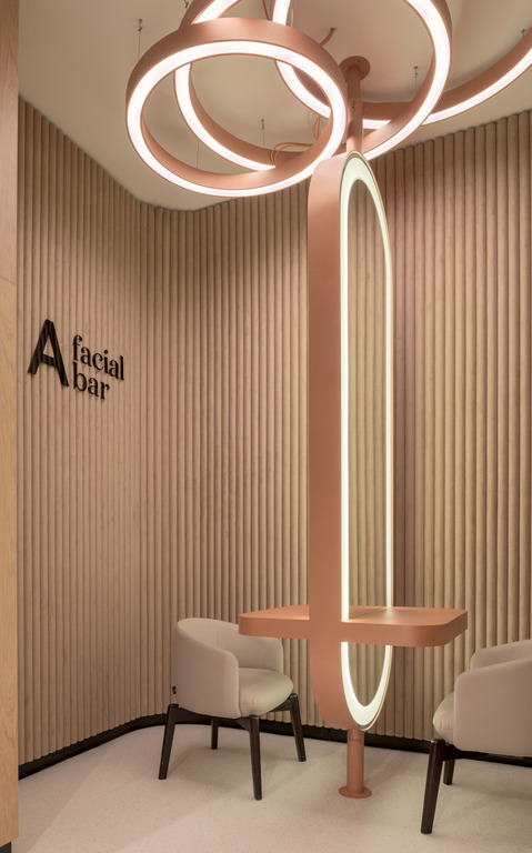 Особенность Anywell Facial Bar — выполнение быстрых процедур. Они проводятся в общем пространстве. В этой части салона кресла разделены с помощью зеркал, что создает атмосферу уединения. Также в салоне обустроен отдельный VIP-кабинет – в его дизайне использованы текстильные панели, которые решают вопросы шумо- и звукоизоляции. Кроме того, в пространстве открыт корнер Anywell Shop – тут расположены витрины с выделенными нишами для товара, которые находятся в общем доступе для проходящих мимо покупателей. В отделке пространства, площадью 130 кв. м, использованы исключительно натуральные материалы с включением металла и деревянных ламелей. Цвет металла – розовое золото, перетекающее в активный оранжевый оттенок. Все элементы дизайна – светильники, мебель, аксессуары – выполнены индивидуально под заказчика.