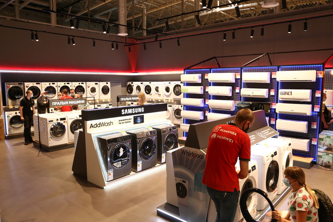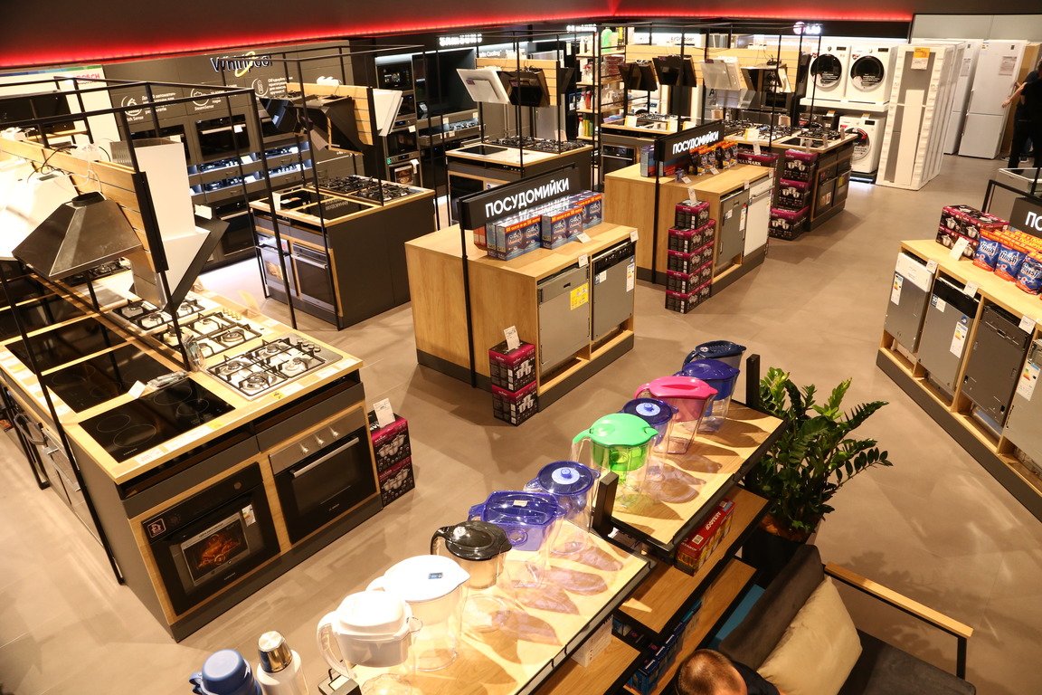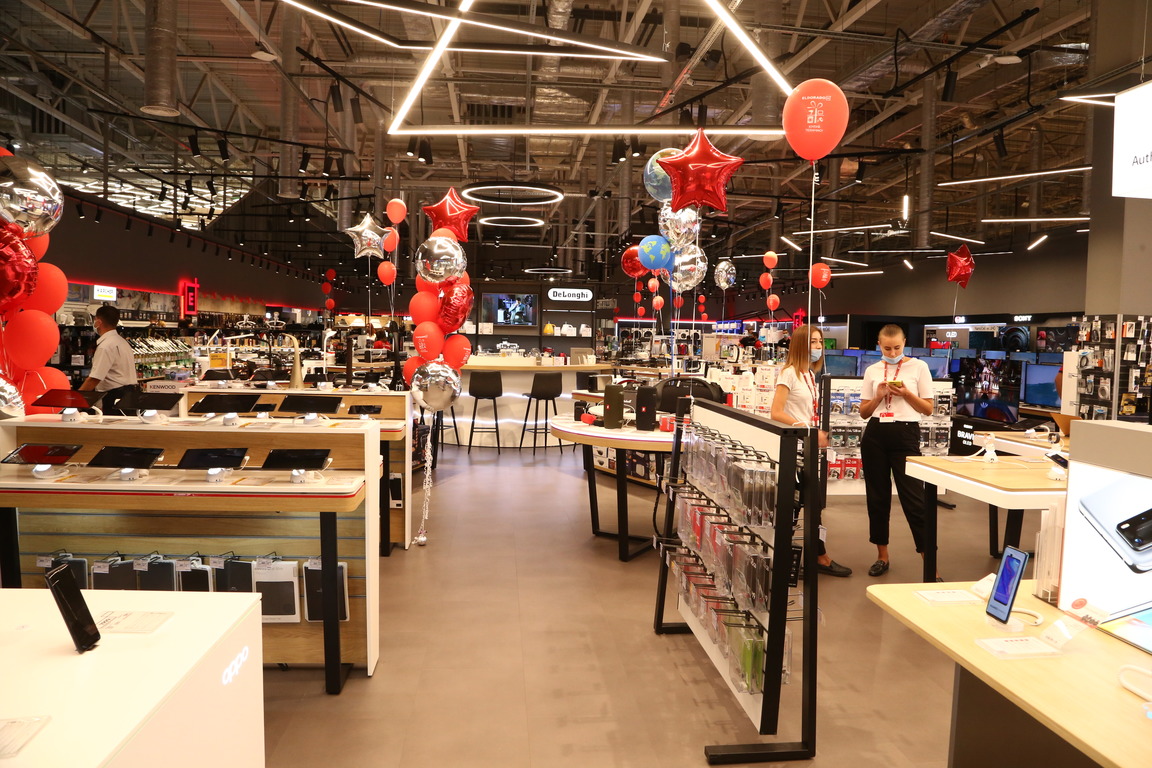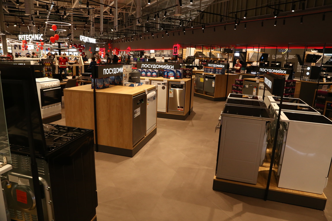Грамотное расположение ключевых зон, удобное размещение касс и продуманное освещение (используются светильники разных типов: линейные, направленного света, дизайнерские фигурные, с различным углом раскрытия линзы), сосредоточенное на товаре, позволит сделать выбор бытовой техники и электроники максимально комфортным для каждого посетителя магазина.