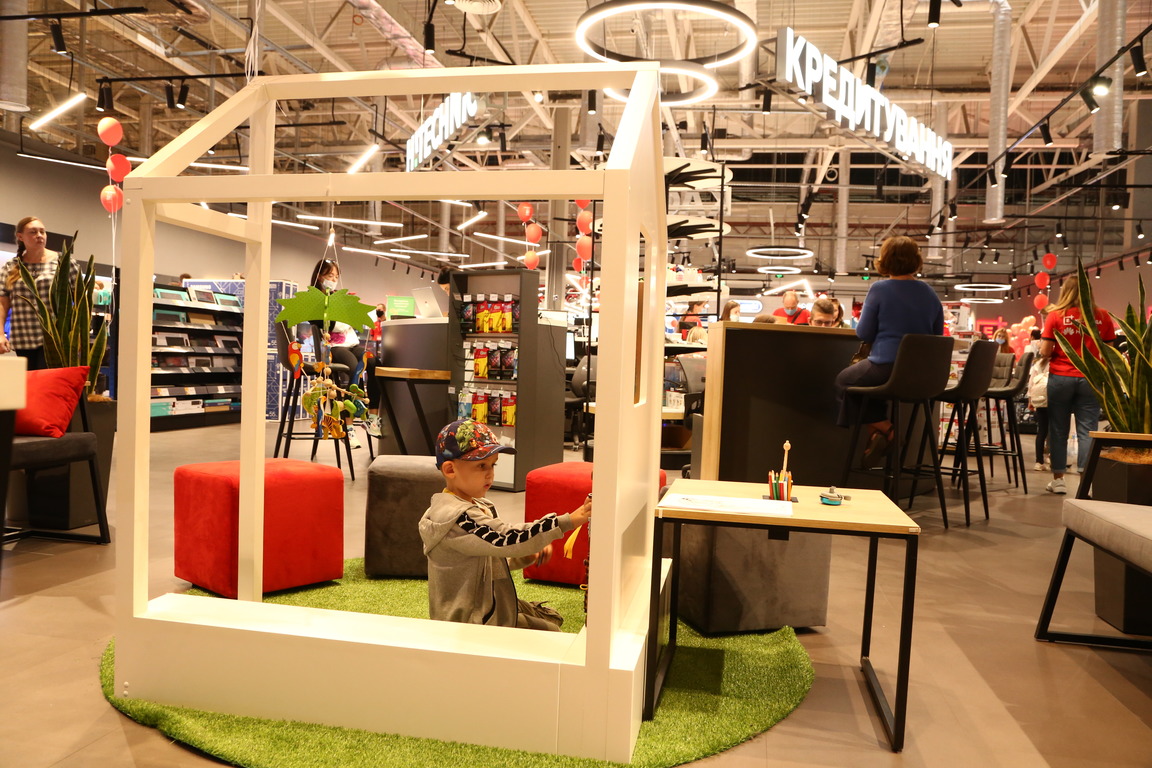 Сюрпризом для покупателей также станет наличие детской зоны и лаунжа – они размещены возле зоны кредитования, что дает возможность сделать визит в магазин интересным и вкусным для всей семьи, а оформление рассрочки - приятным событием. Концептуально новой локацией стала барная стойка совмещенная с бренд-зоной.