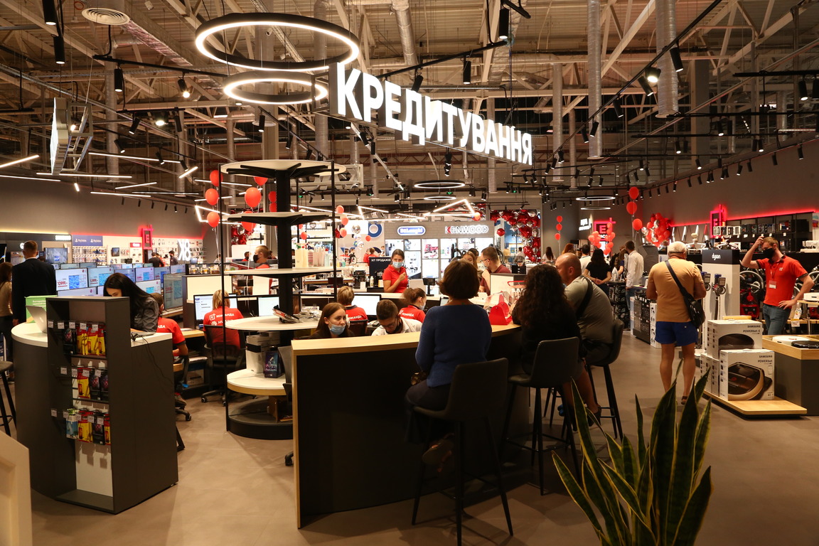 В магазине есть детская зона и лаунжа – они размещены возле зоны кредитования. Концептуально новой локацией стала барная стойка совмещенная с бренд-зоной. Здесь каждый покупатель может отдохнуть и бесплатно выпить чашечку кофе. Дизайн нового формата также был изменен на более «мягкий» и уютный. Так, в магазине стало меньше углов, использование натурального дерева прибавило пространству домашнего комфорта в стиле «эко», что предвосхитило запуск нового маркетингового позиционирования "Заради сімей", а важным элементом нового формата стал эффект «прозрачности» торгового зала, которого удалось достичь благодаря просторному и интуитивно понятному интерьеру и открытой входной группе.