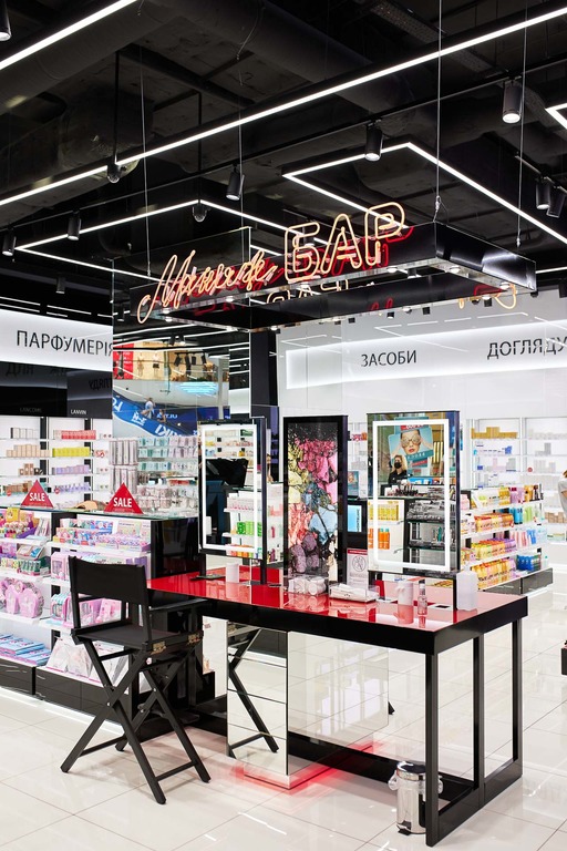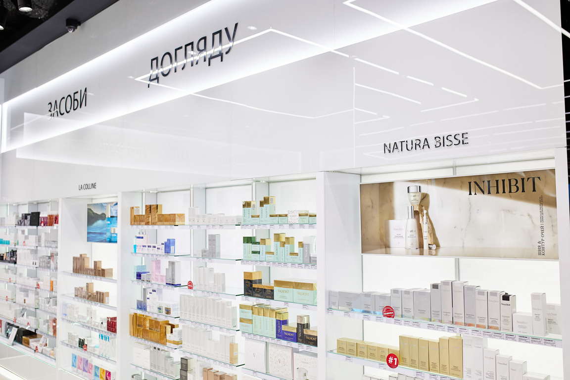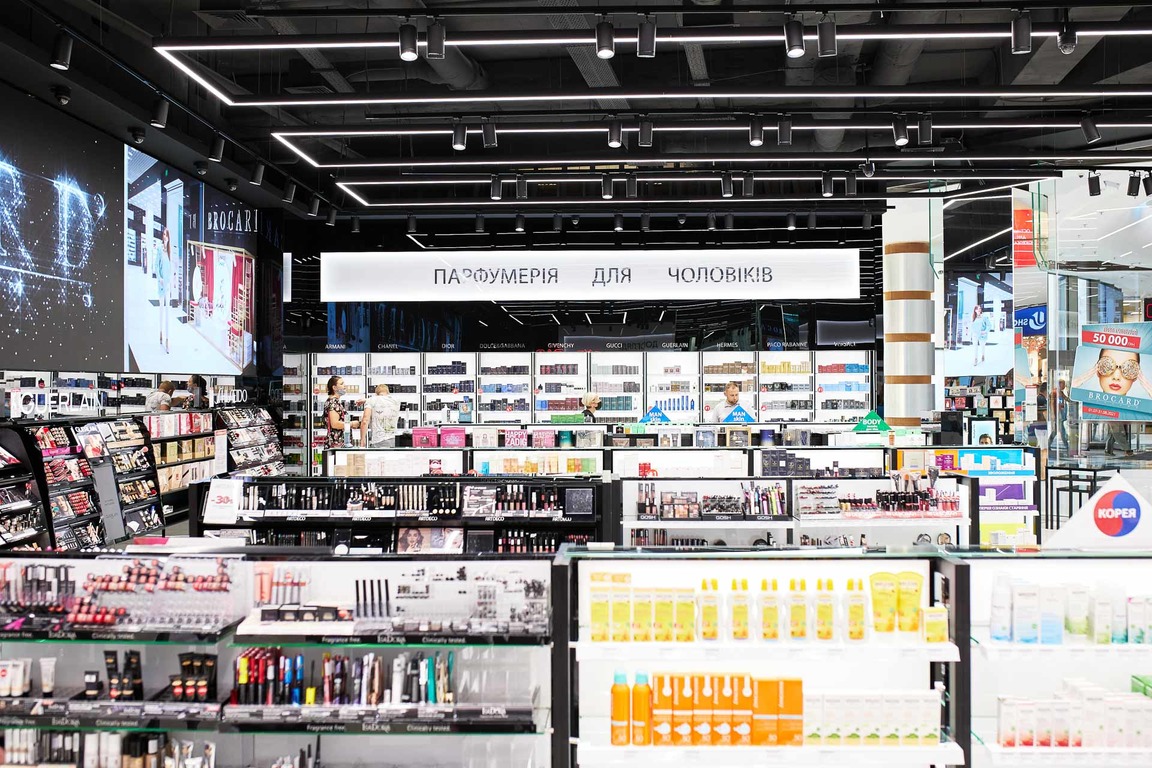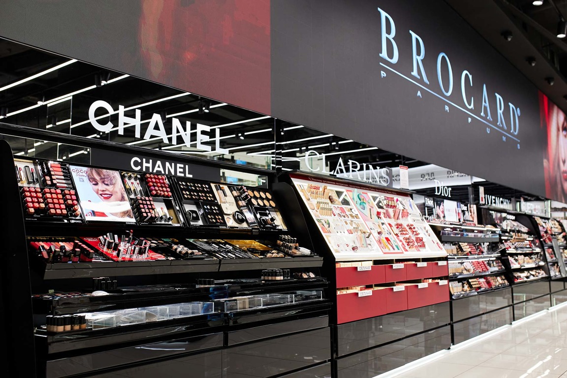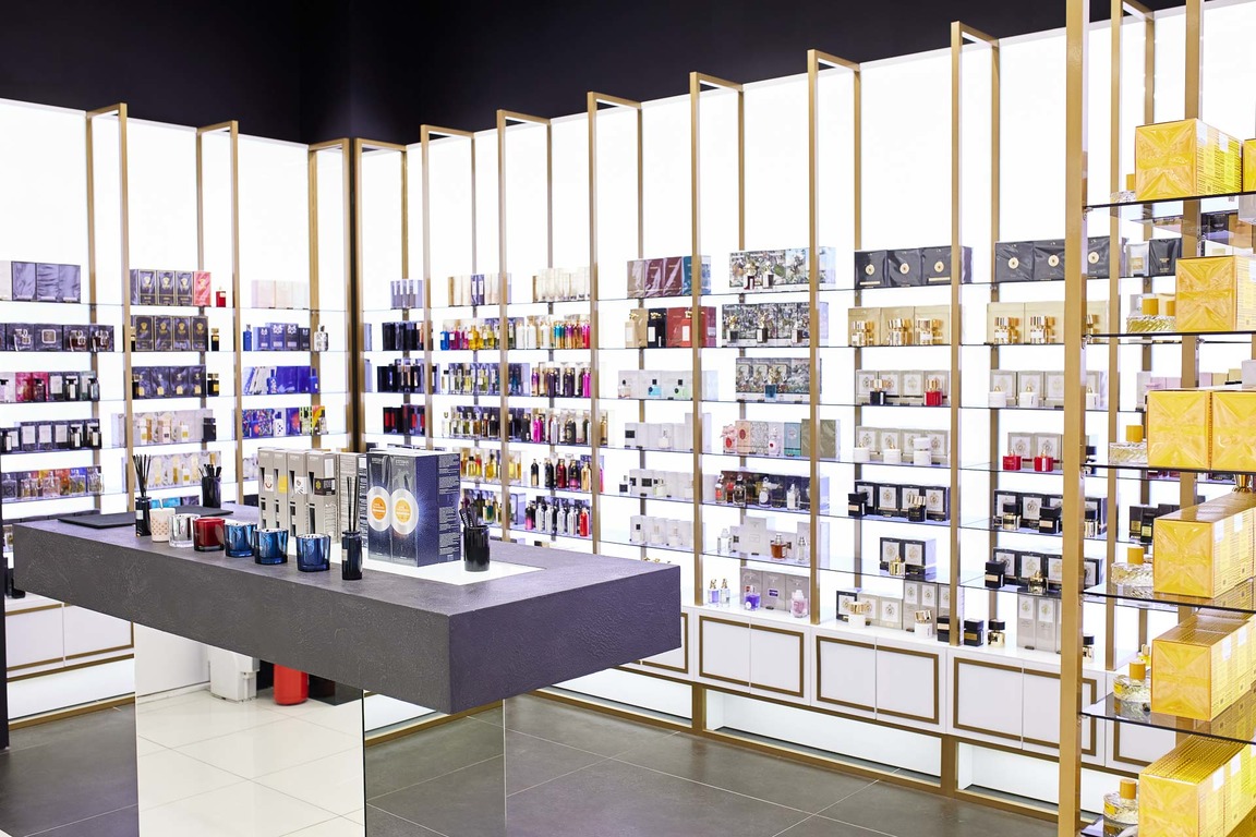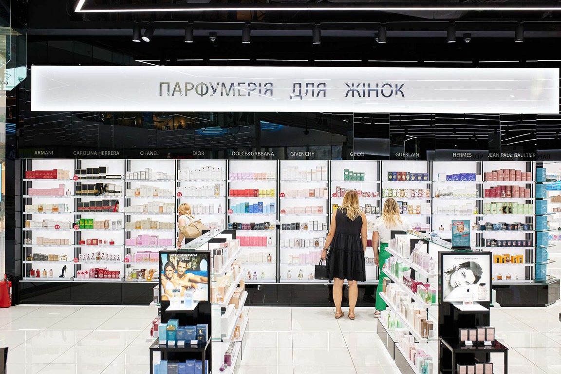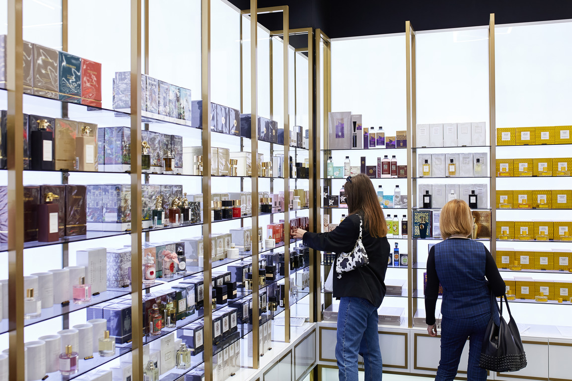 В новом магазине представлены 130 брендов парфюмерии и косметики (CHANEL, Dior, Lancôme, Guerlain, Clarins, Givenchy, Gucci, Collistar, Dolce & Gabbana, Eisenberg Paris, Hermes, Trussardi, Lanvin, Payot, Elizabeth Arden, Carolina и др.).Магазин выполнен в привычной для новых объектов сети черно-белой гамме.