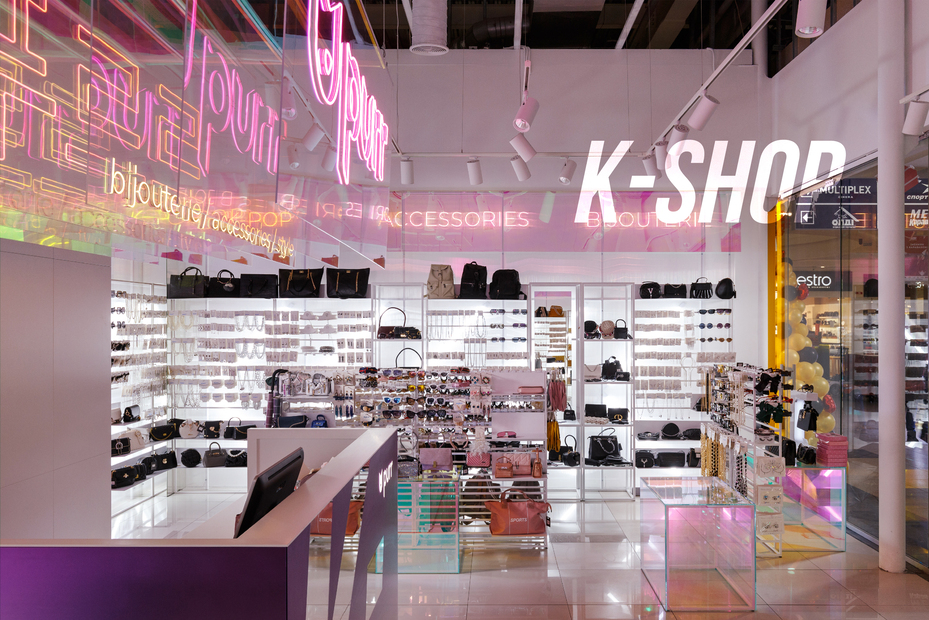 Площадь магазина составляет 65 кв.м, дизайн выполнен в многогранности Сеула с интересными световым инсталляциями.
