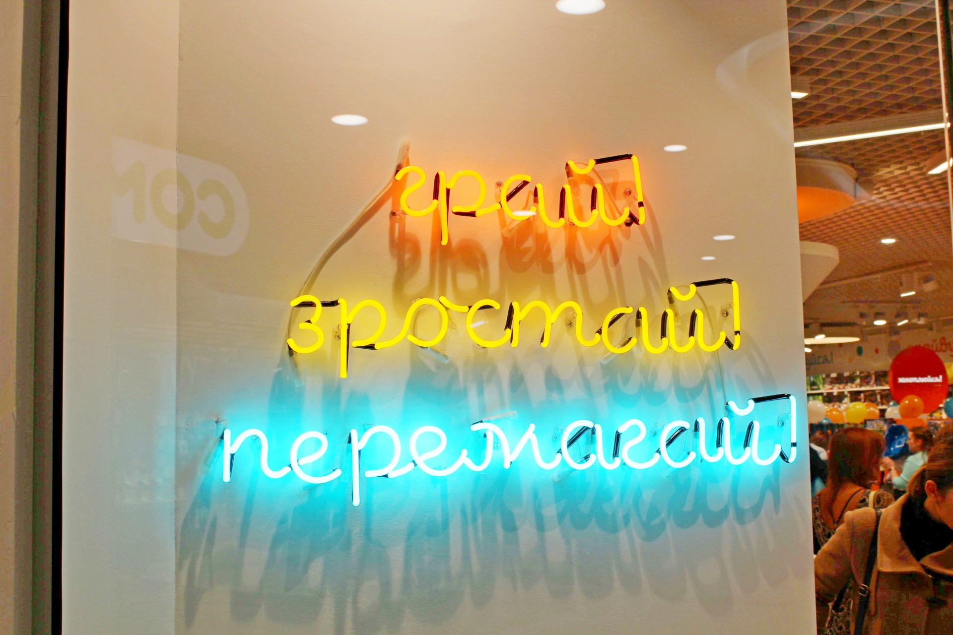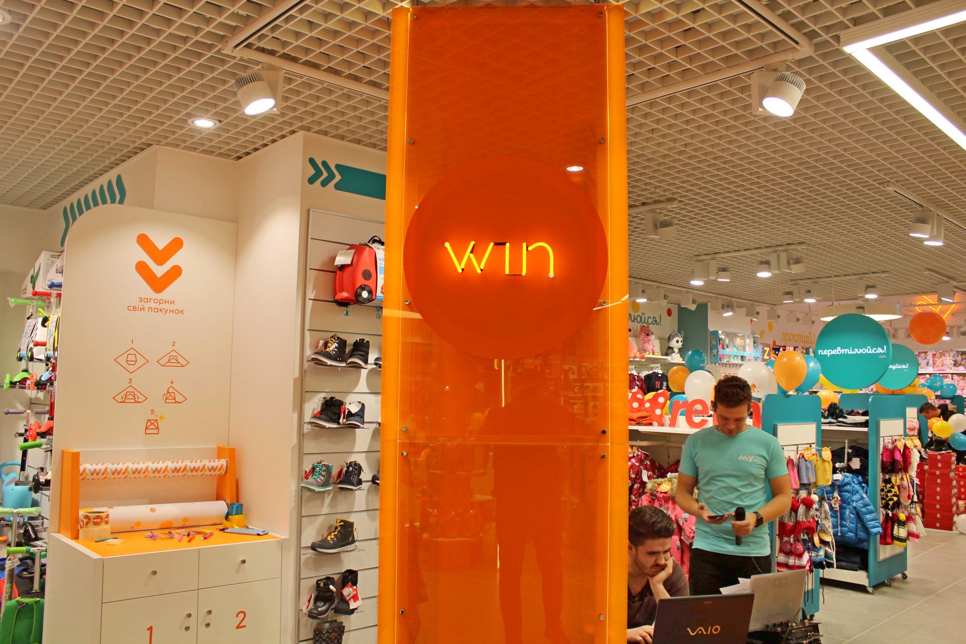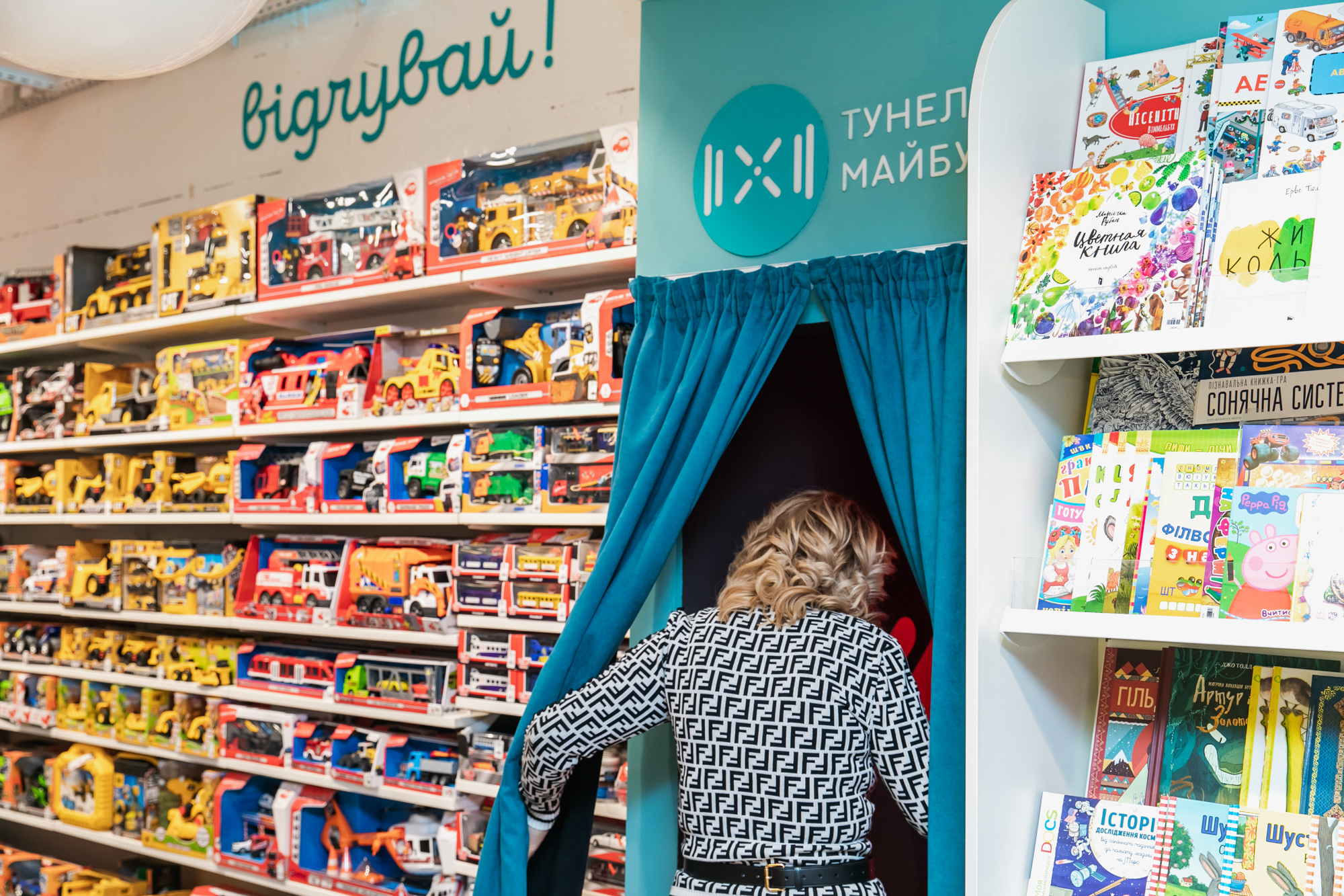 Навигация магазина тоже наполнена эмоциональным посылом: "фантазуй, гаджуй, перевтілюйся, створюй, вмикайся", которая отображена на стенах, а на полу магазина прорисованы игры и подсказки по расположению игрушек.