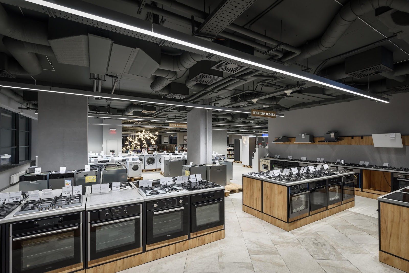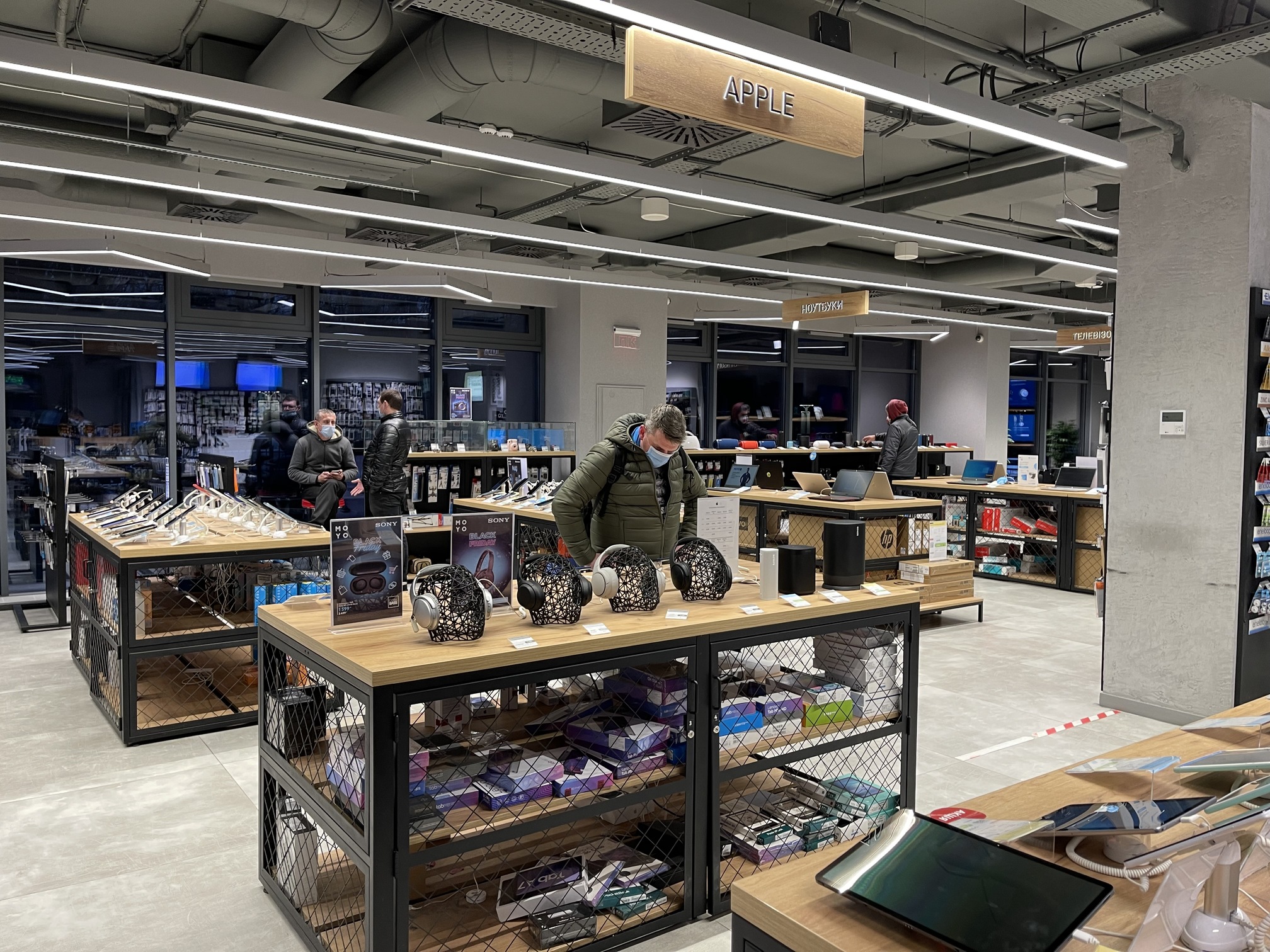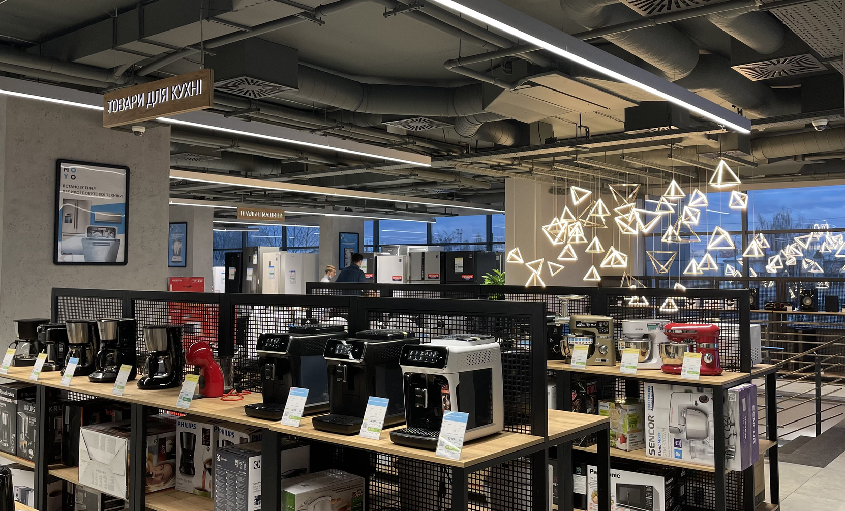 Потолки, освещение разных типов и витрины визуально разделяют магазин большого формата на зоны, расположенные по принципу товарного соседства для удобства покупателя. На нулевом этаже – товары для дома, на первом - смартфоны и гаджеты, ноутбуки, аксессуары, стереосистемы, телевизоры, гейминг-зона, электроинструменты и садовая техника, бренд-зоны Philips и Ajax Systems, на втором - большая и уютная зона для выбора телевизоров длиной 17 метров, большая и мелкая бытовая техника, велнес-гаджеты, игрушки и детские товары. На первом и втором этажах расположены установки разумных гирлянд Twinkly.