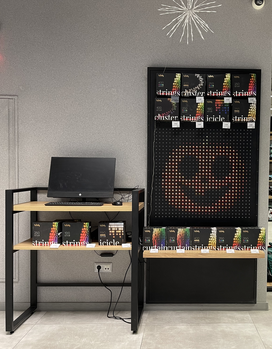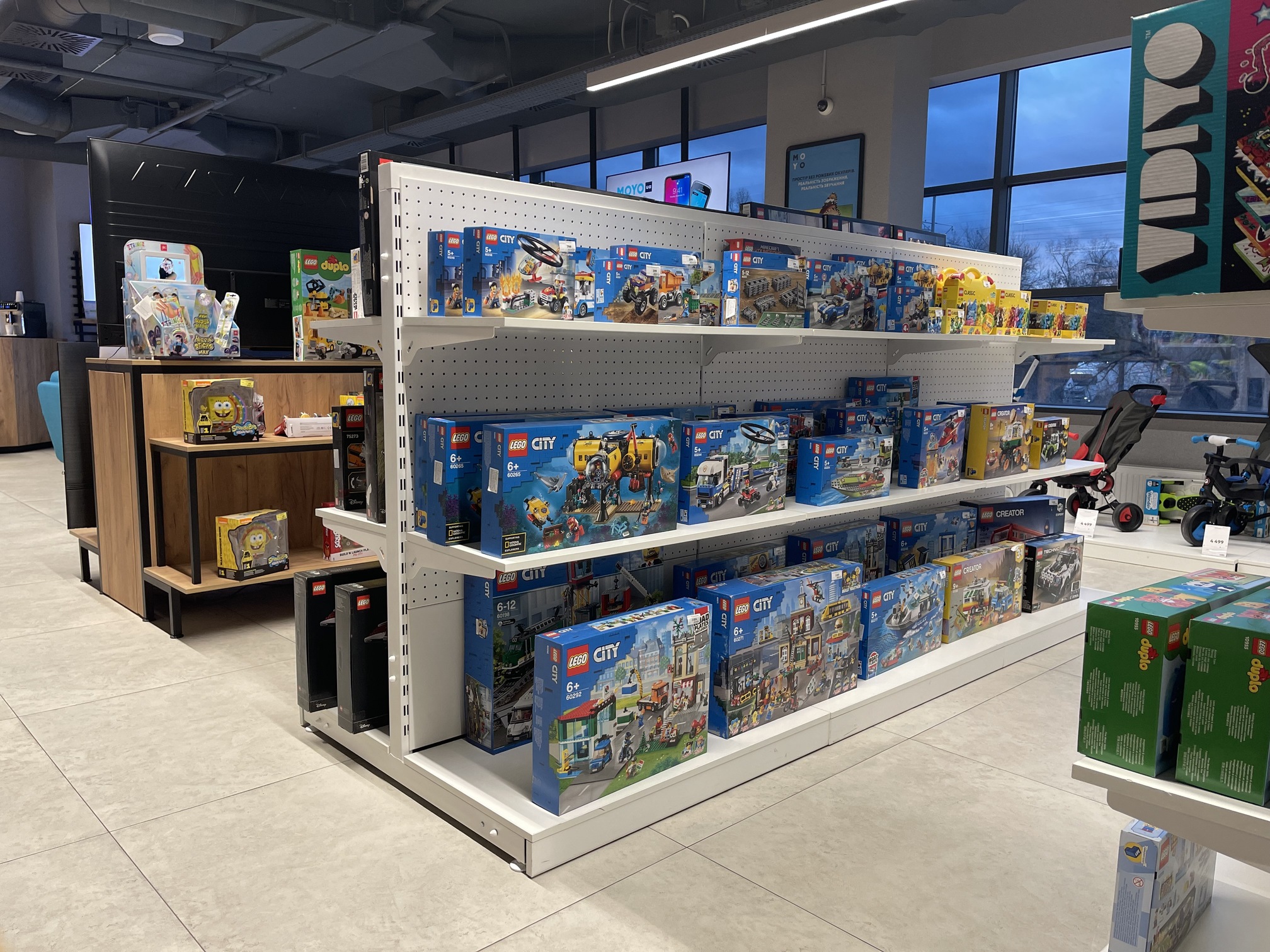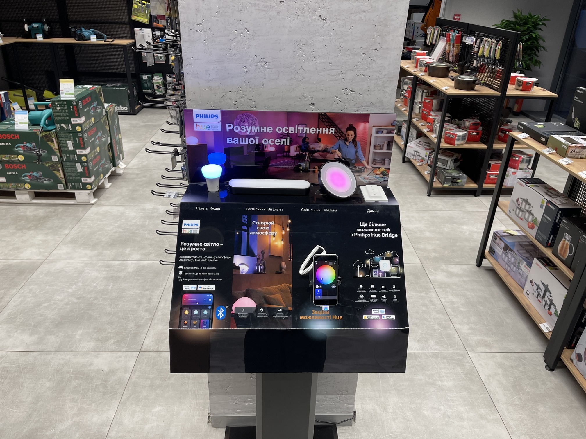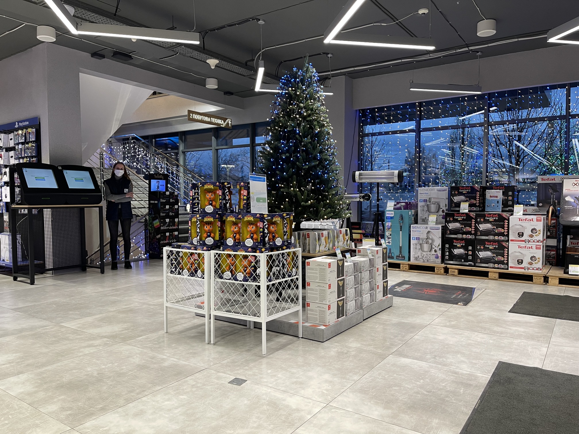 Потолки, освещение разных типов и витрины визуально разделяют магазин большого формата на зоны, расположенные по принципу товарного соседства для удобства покупателя. На нулевом этаже – товары для дома, на первом - смартфоны и гаджеты, ноутбуки, аксессуары, стереосистемы, телевизоры, гейминг-зона, электроинструменты и садовая техника, бренд-зоны Philips и Ajax Systems, на втором - большая и уютная зона для выбора телевизоров длиной 17 метров, большая и мелкая бытовая техника, велнес-гаджеты, игрушки и детские товары. На первом и втором этажах расположены установки разумных гирлянд Twinkly.