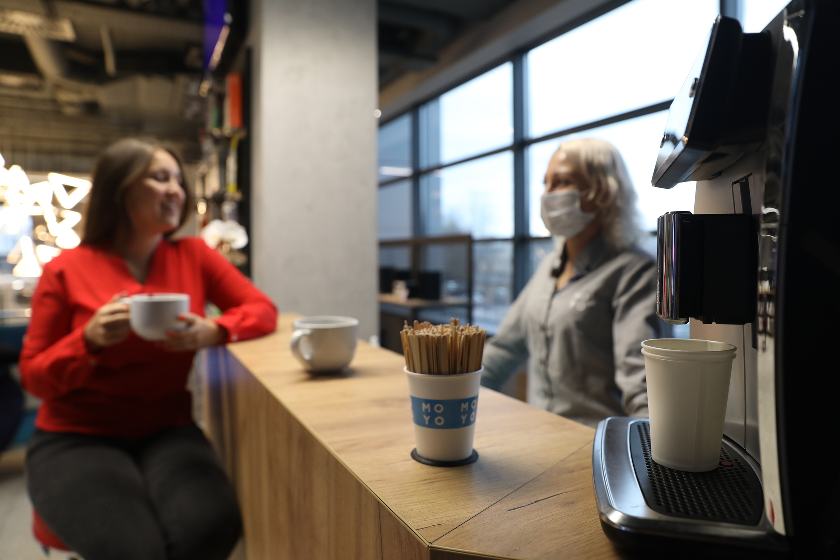 Быстрое обслуживание обеспечивают пять касс, связанных в зоне выдачи с конвейерной линией с автоматизированным трехуровневым составом. Сбор, комплектация и отгрузка товаров происходят путем сканирования штрих-кодов терминалом сбора данных, а перемещение по составу - через конвейер, обеспечивающий быструю выдачу заказов и сводящий ошибки к минимуму. Любой товар из 40-тысячного ассортимента MOYO можно заказать на месте и получить в течение 20 минут. Для комфортного ожидания на втором этаже есть кафе и лаунж-зоны. Эффектную подачу обеспечивают телевизоры в зоне выдачи заказов, где можно наблюдать, как товар поступает клиенту со склада.