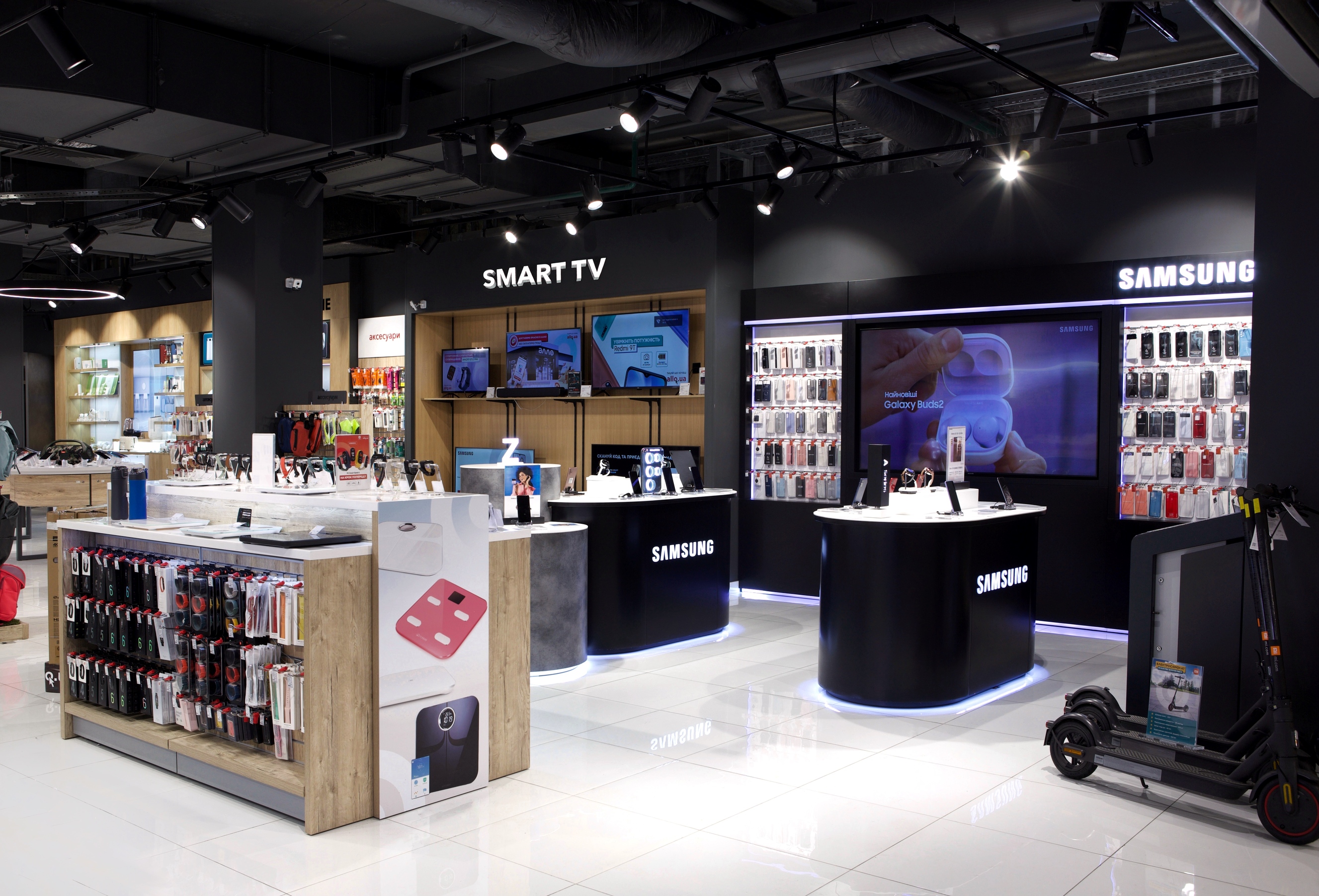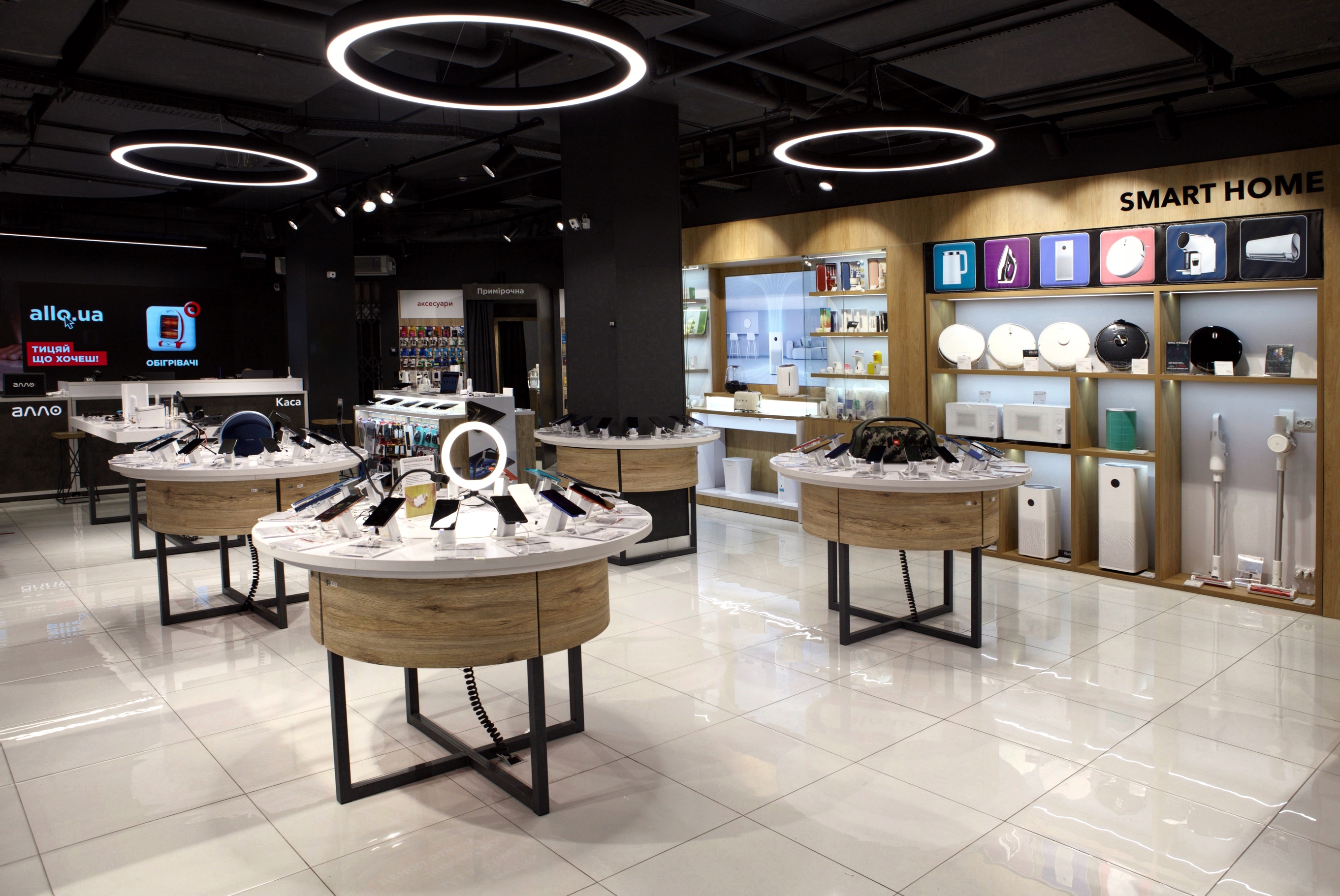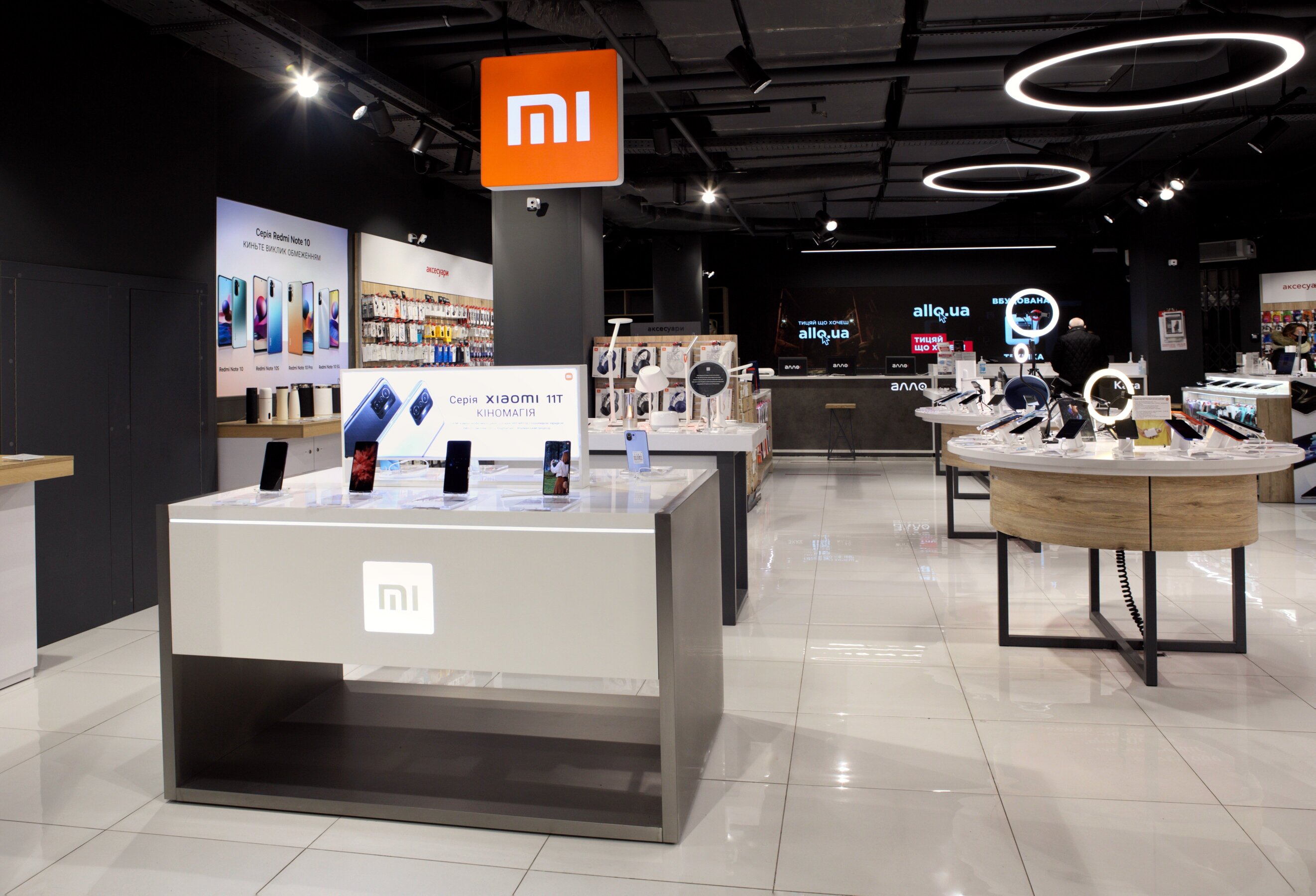 В магазине размещена отдельная зона выдачи заказов маркетплейса allo.ua, примерочная, зоны тестирования товаров и оформления кредитов.