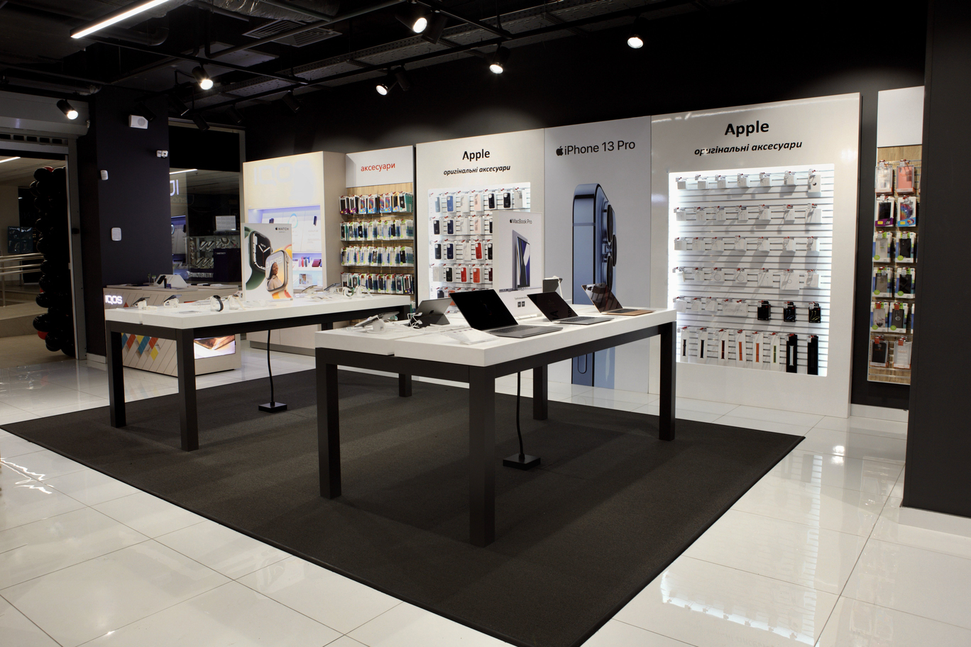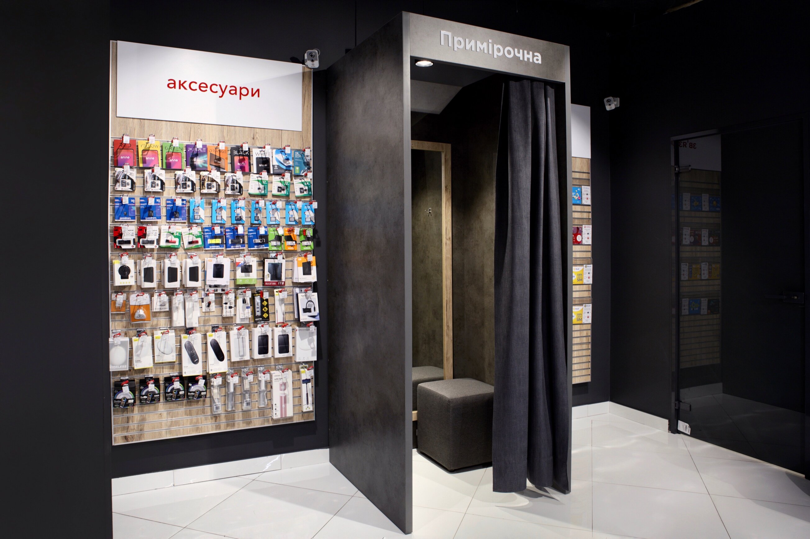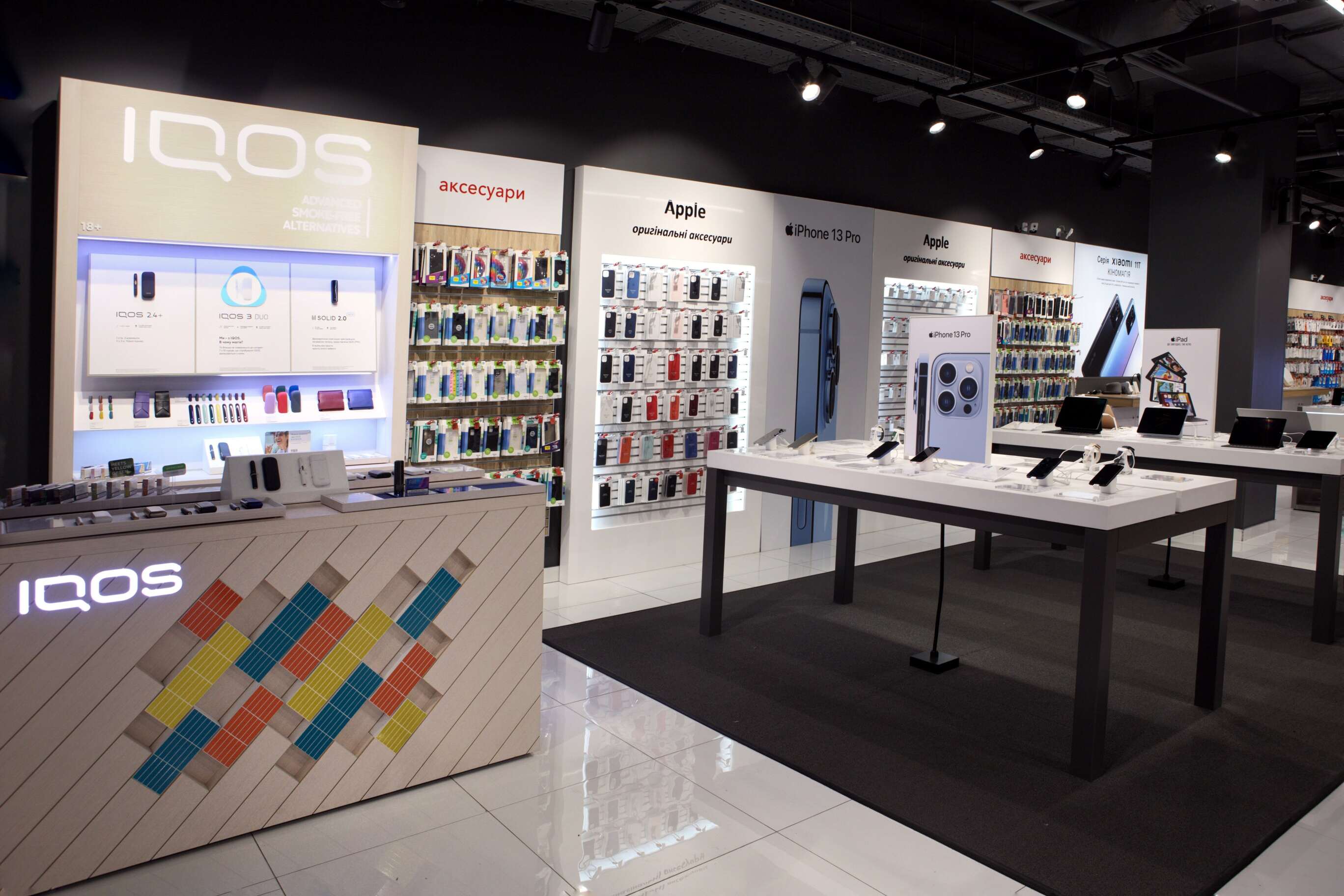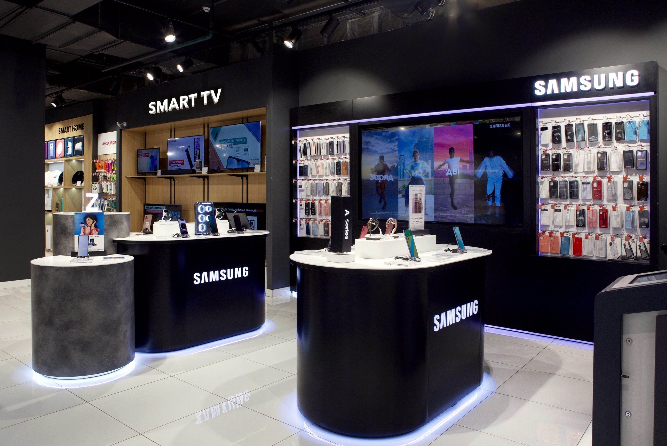 В магазине размещена отдельная зона выдачи заказов маркетплейса allo.ua, примерочная, зоны тестирования товаров и оформления кредитов.