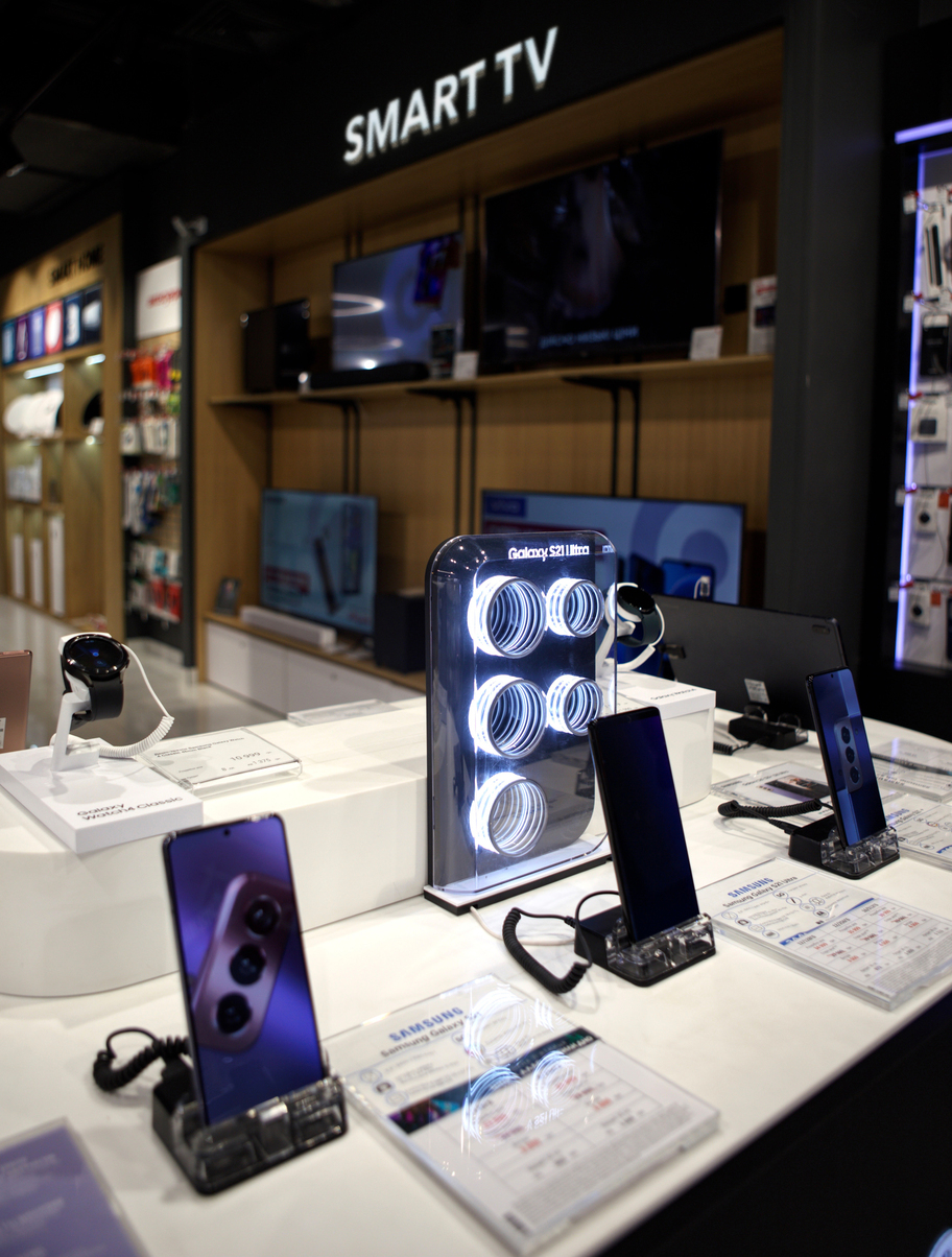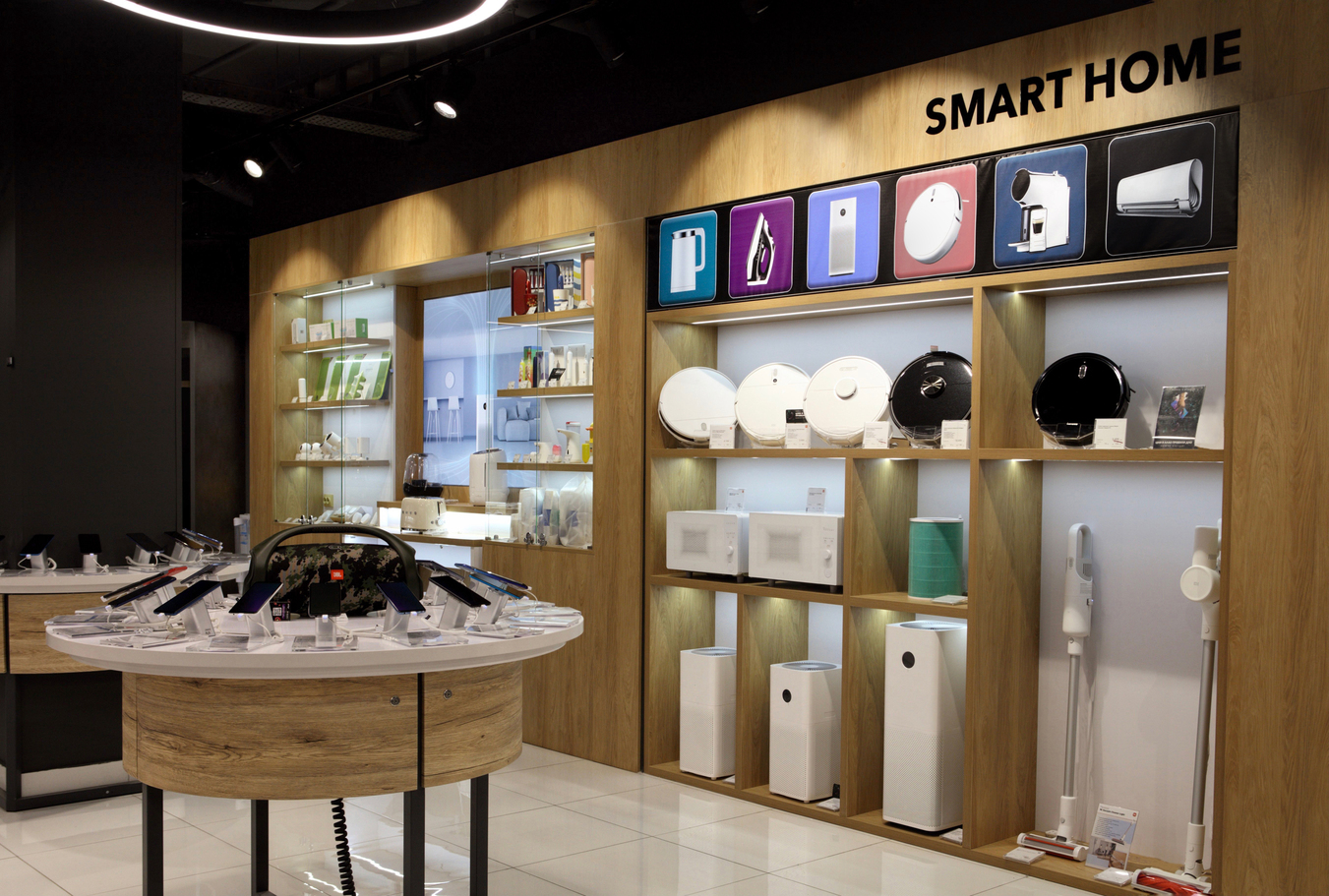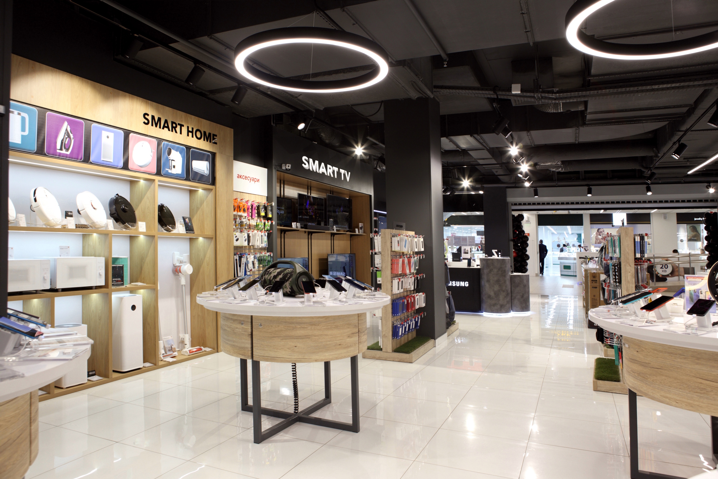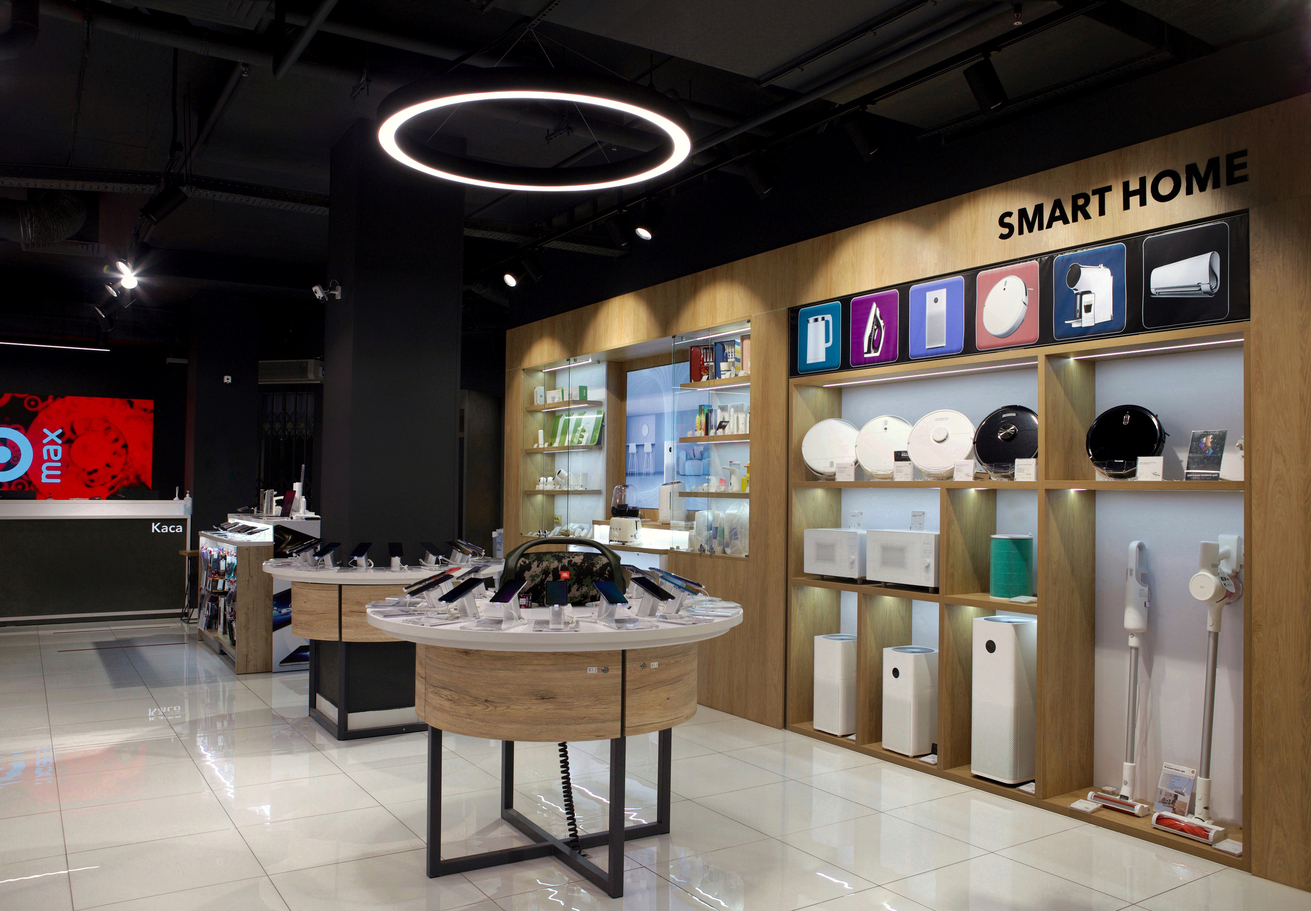 На данной площади стало возможным представить вниманию покупателей расширенный ассортимент товаров, а также добавить новые зоны с открытым доступом: бытовая техника, телевизоры, ноутбуки, товары для спорта, здоровья и персонального ухода, фирменные зоны мировых брендов Xiaomi, Apple, Samsung, IQOS. Команда разработала и обустроила обновленную зону Smart Home.