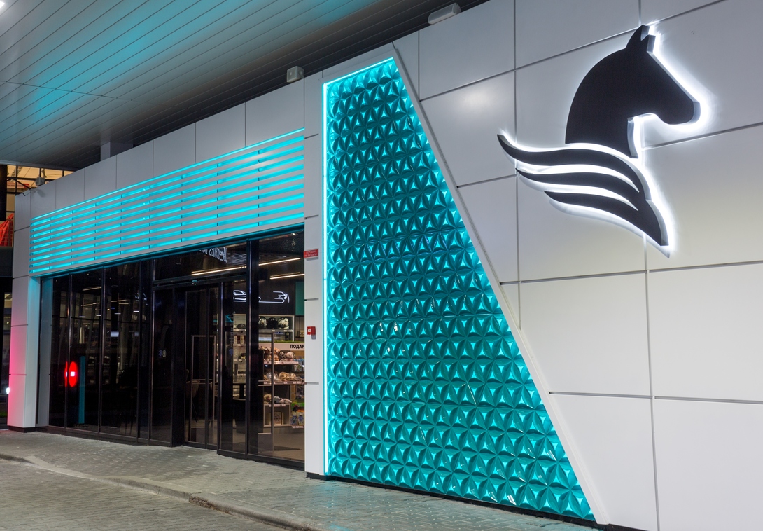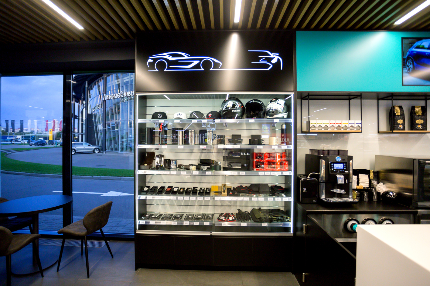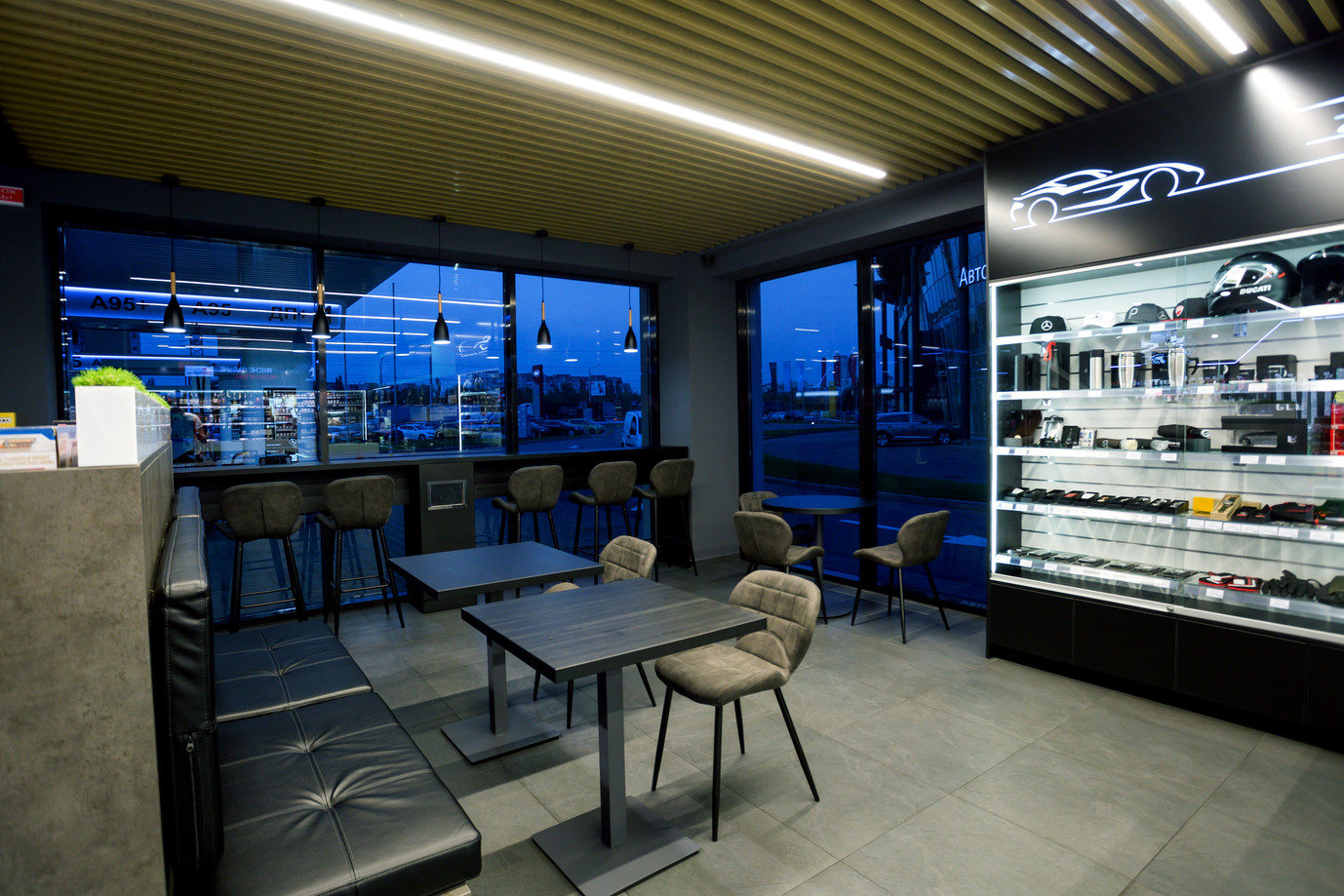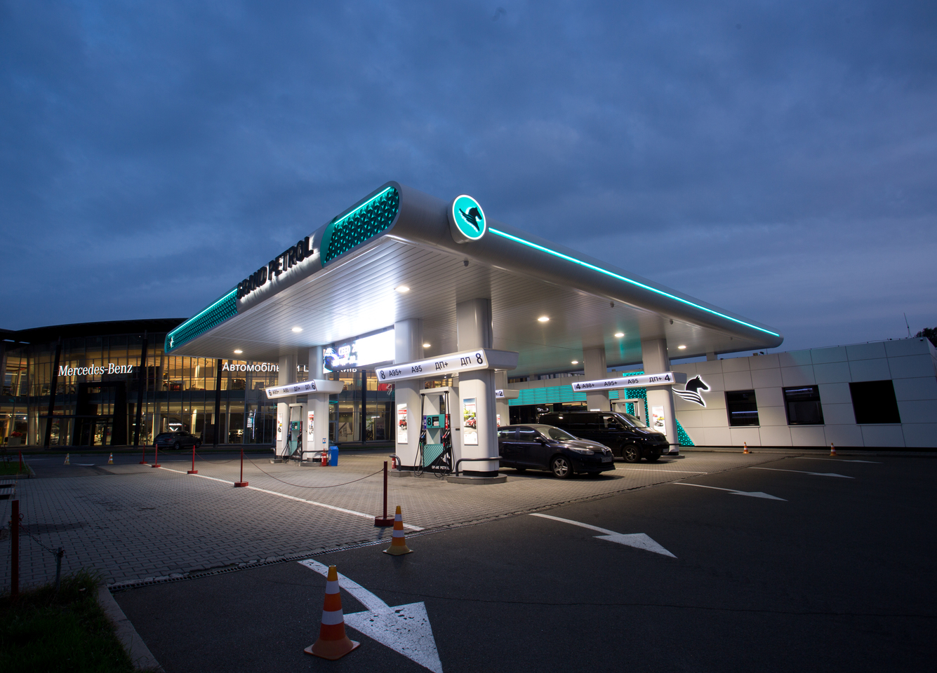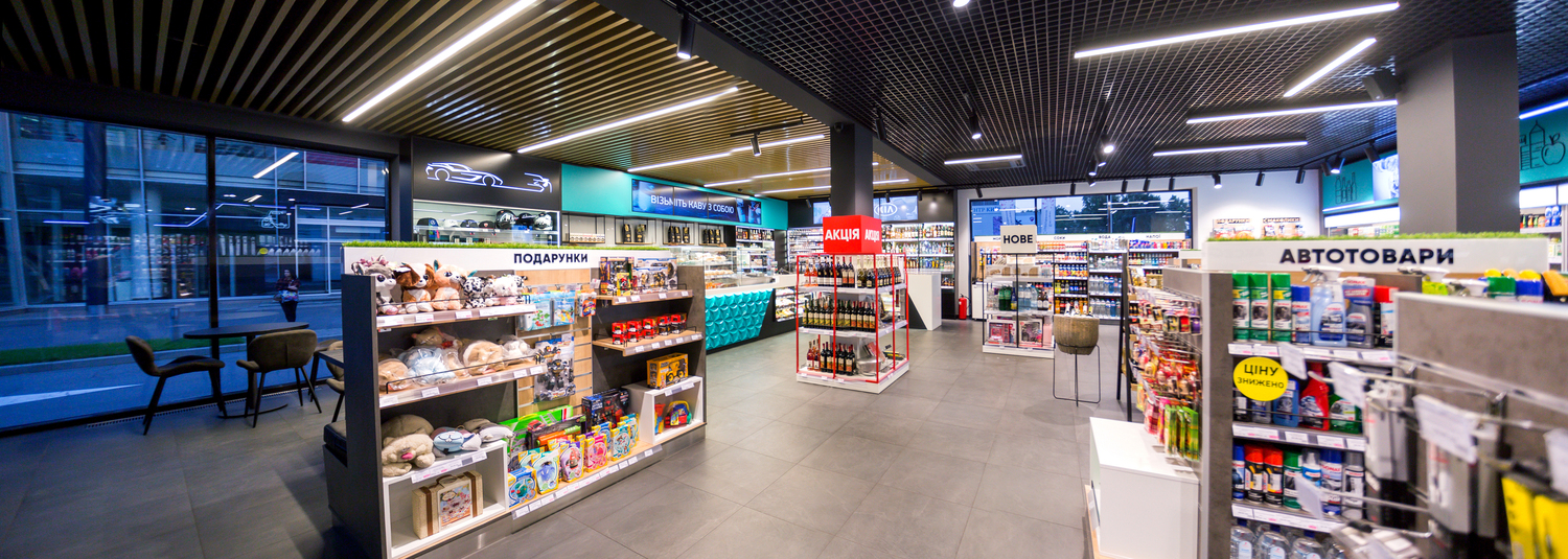 Автозаправочный комплекс по проспекту Степана Бандеры, 22 работает с 1999 года и был одним из первых в Киеве комплексов в формате "заправка с полноценным магазином и кухней". Весной 2020 года была проведена полная реновация комплекса с редизайном торгового зала магазина. При планировании торгового зала, площадью 120 кв, акцент был сделан на удобной навигации и зонировании: нестандартное торговое оборудование, максимально открытая кассовая зона, что позволяет с порога установить с клиентом визуальный контакт и выгодно представить премиальный товар в закассовой зоне, бренд-витрина с товарами Mercedes-Benz и Ducati располагается на пересечении кассовой зоны и зоны отдыха, что привлекает внимание к брендтоварам. В зоне кафе разноформатные места отдыха позволяют как быстро перекусить так и провести встречу. Комбинированное освещение, акцентные подсветки позволяют правильно выделить товар, создать уютную атмосферу в торговом зале.