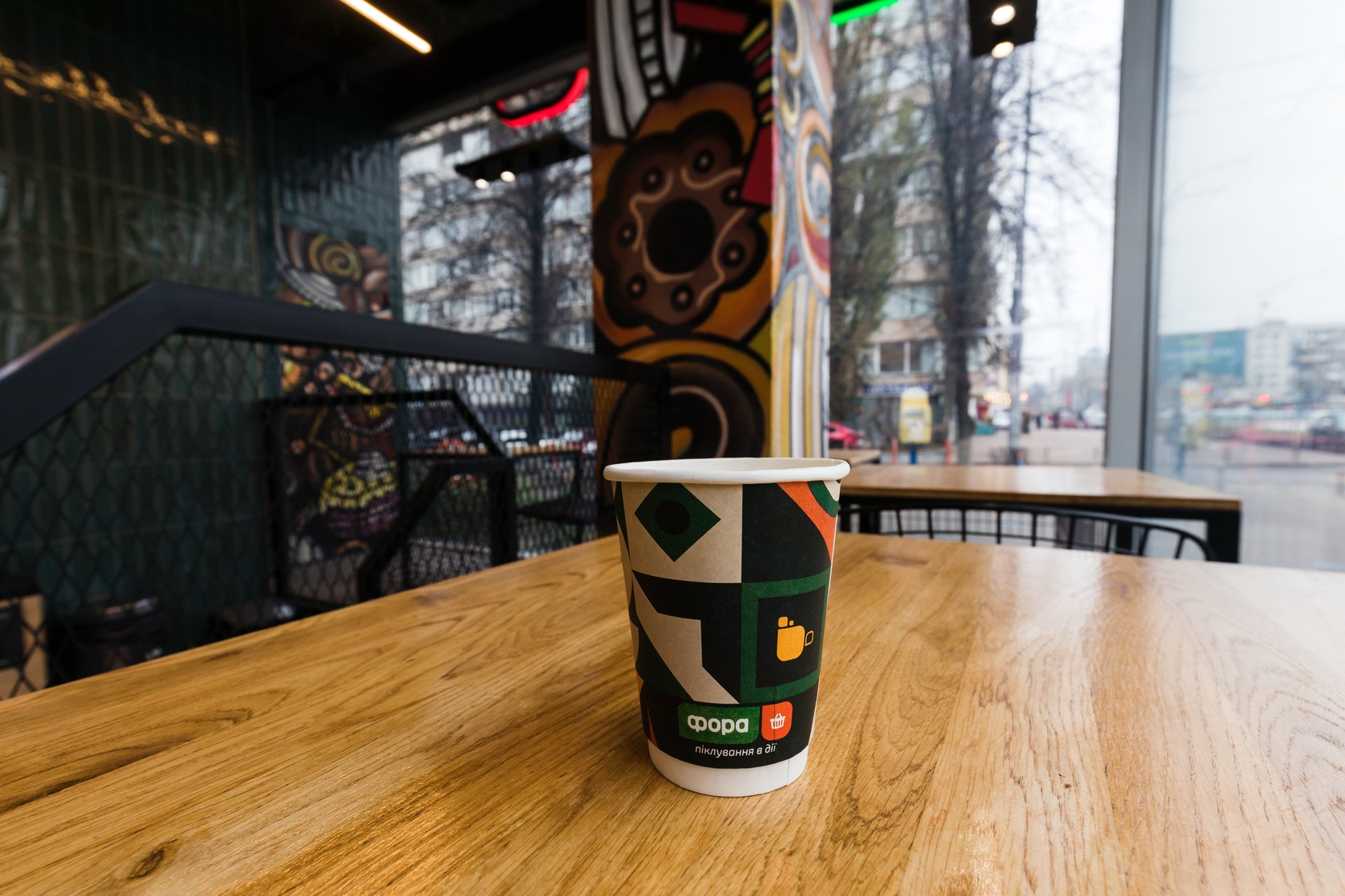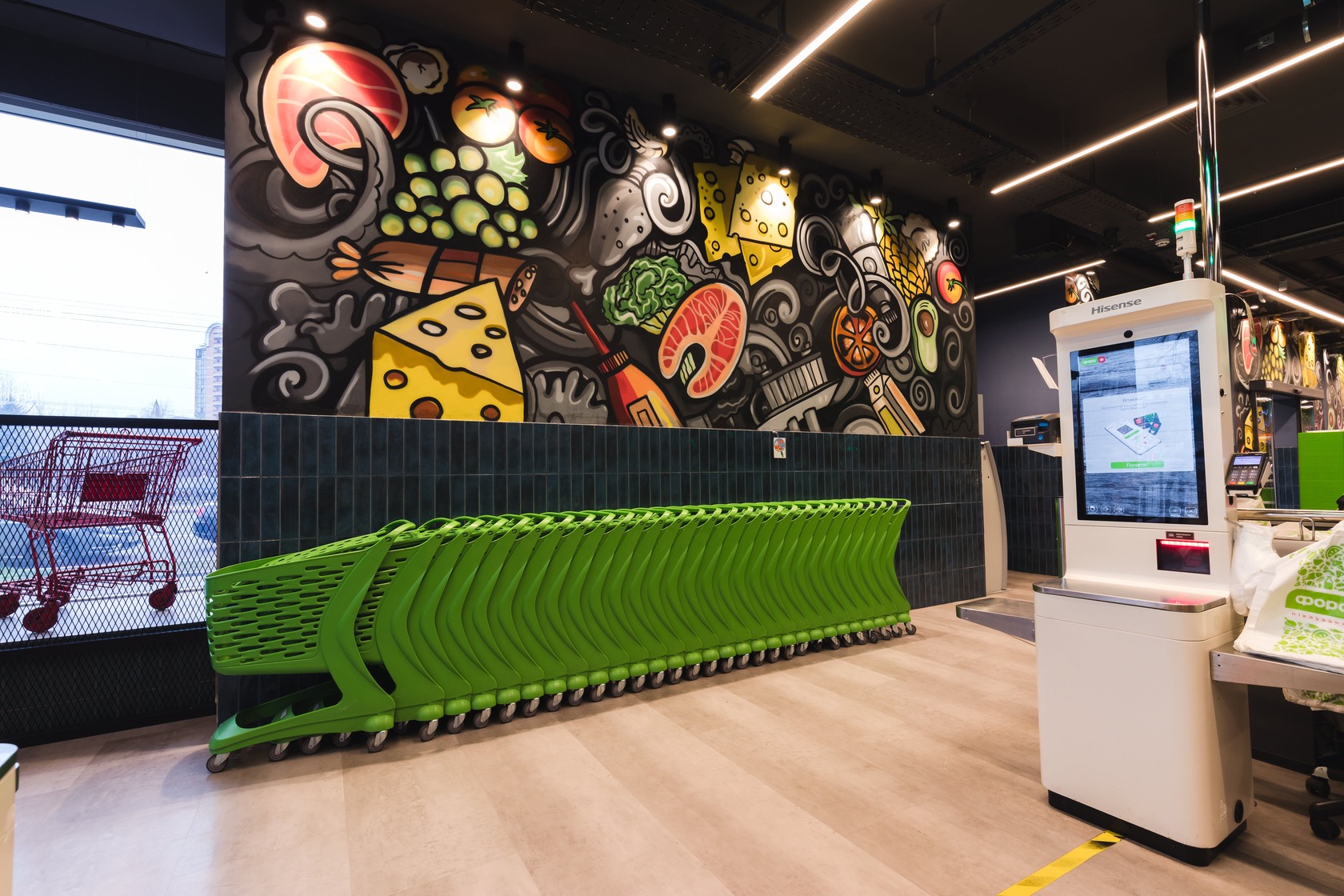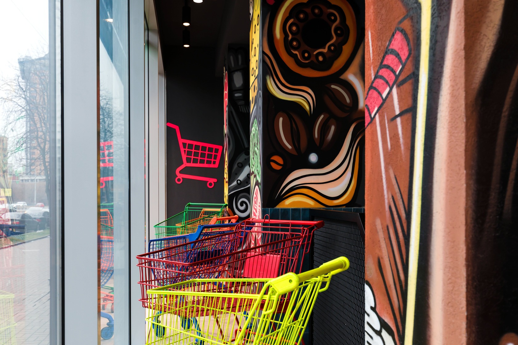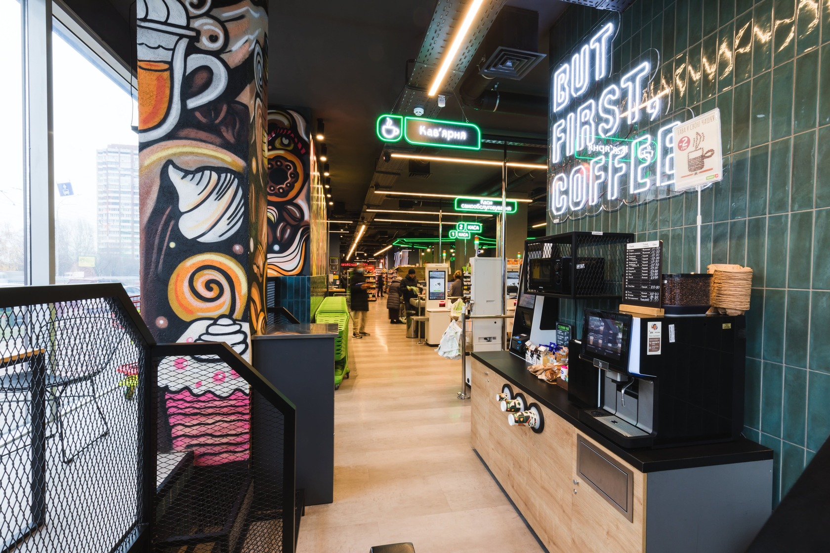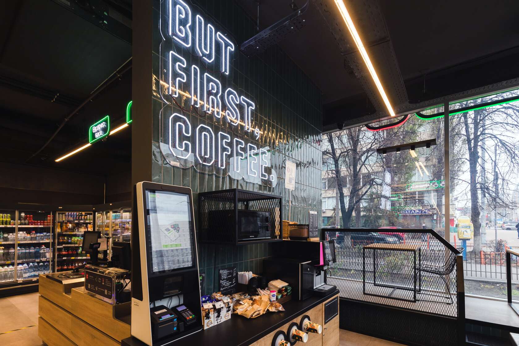 В магазине есть 4 кассы самообслуживания. Интерьер "Форы" выполнен в стиле «urban vibe», максимально соответствующем формату «city market». Основной задумкой было создание динамичного дизайна с духом большого города и его стремительным ритмом жизни, в то же время создать уютную атмосферу, где можно перевести дыхание. Это все соединилось в кафе магазина, где можно спокойно выпить кофе. Окна вдоль магазина мы решили оставить открытыми, благодаря чему соединили помещение с внешней атмосферой, и добавили дневное освещение.