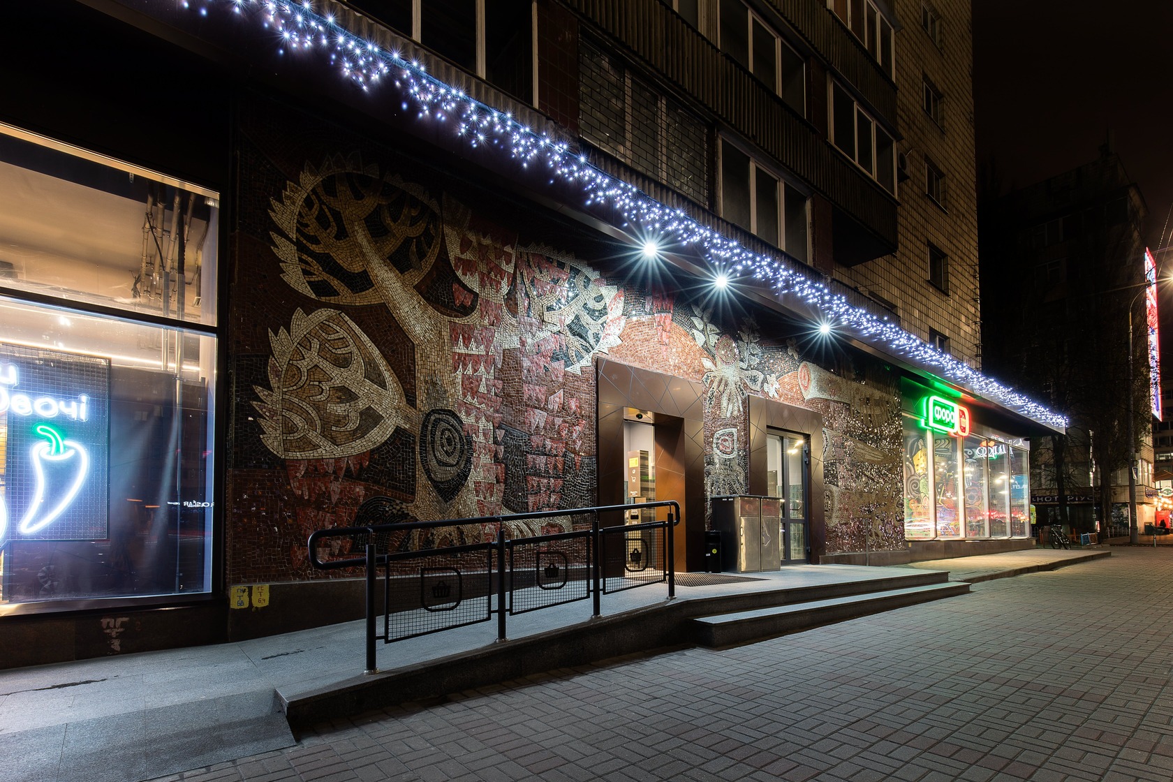 Дом, в котором находится магазин, украшен мозаикой конца 60-70-х годов прошлого века. За это время панно было значительно повреждено и временем, и предварительным вмешательством в архитектуру фасада. "Фора" профинансировала реставрацию мозаики. Конечно, внешнее оформление магазина было стилизовано под внешний вид здания и района в целом.