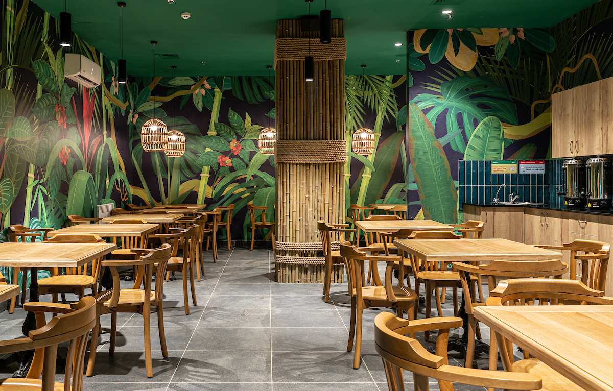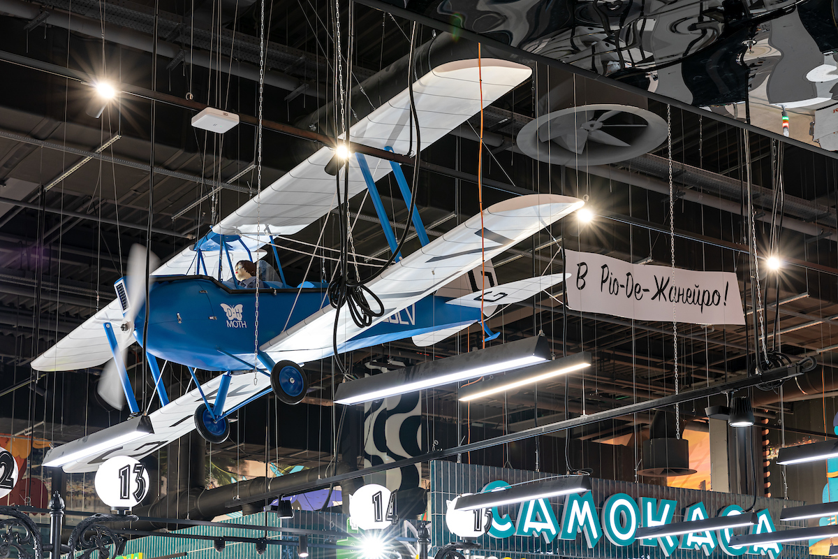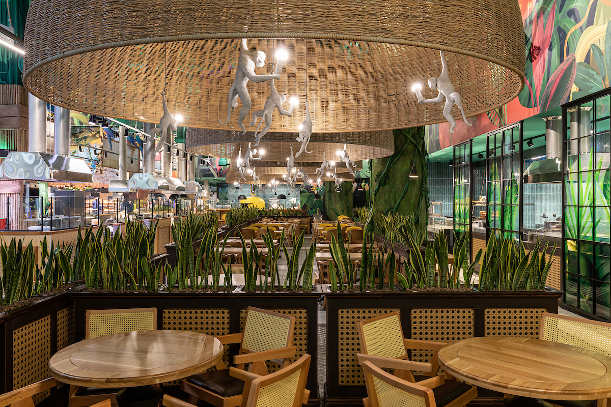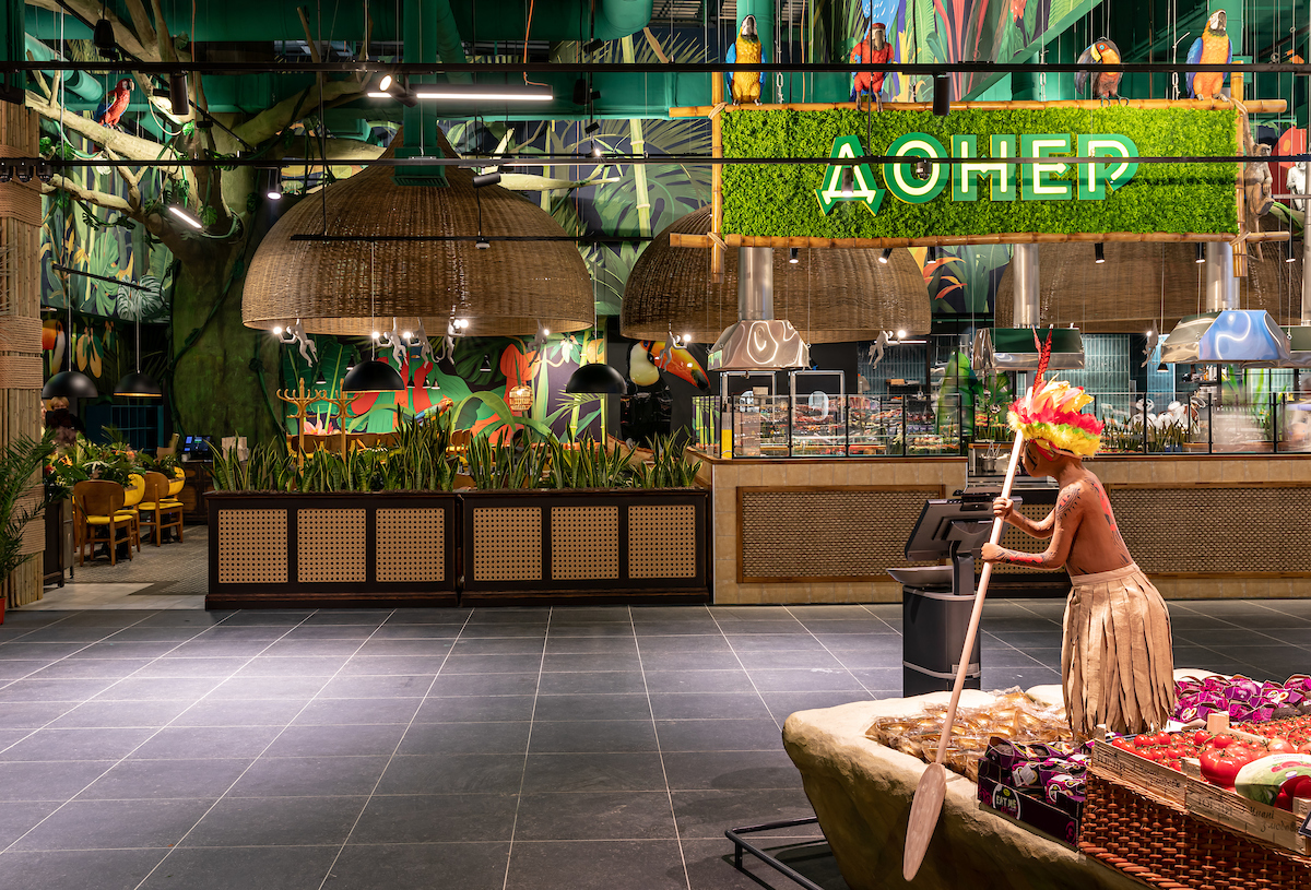 Среди инсталляций деревьев, лиан и диких животных и птиц под огромными люстрами из ротанга расположен уютный фудхол с несколькими кухнями мира. Здесь наши гости смогут отведать блюда итальянской кухни, пиццу на дровах, вок, суши, донер. Работает и кофейня Feeltrd – конечно, с лучшим бразильским кофе. Рядом находится дегустационное пространство, в котором бренд-шеф «Сільпо» Марко Черветти и другие топовые шефы будут проводить мастер-классы и создавать рецепты для «Академии вкуса».