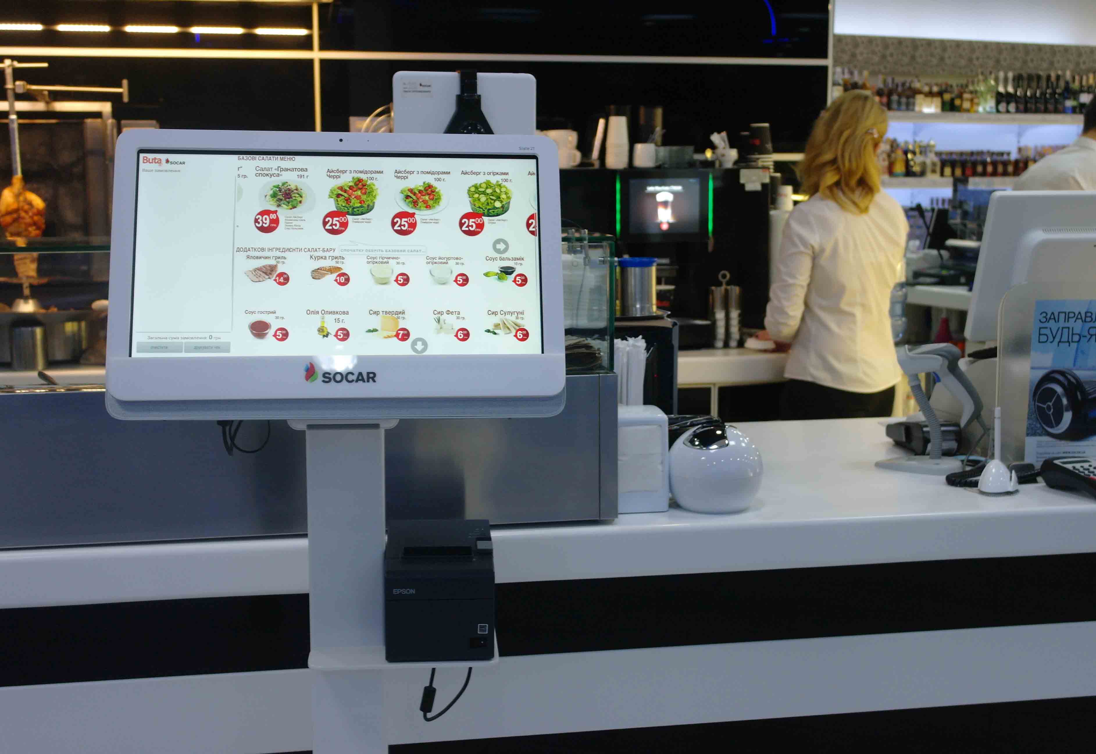 Помимо кебаба и салатов, в кафе можно заказать крем-суп. На АЗС работает интерактивный бар — установлен планшет HP Slate 21 и принтер чеков, клиент выбирает самостоятельно ингредиенты для салата, печатает чек, оплачивает и ожидает заказ, который он может взять с собой или съесть на месте.
