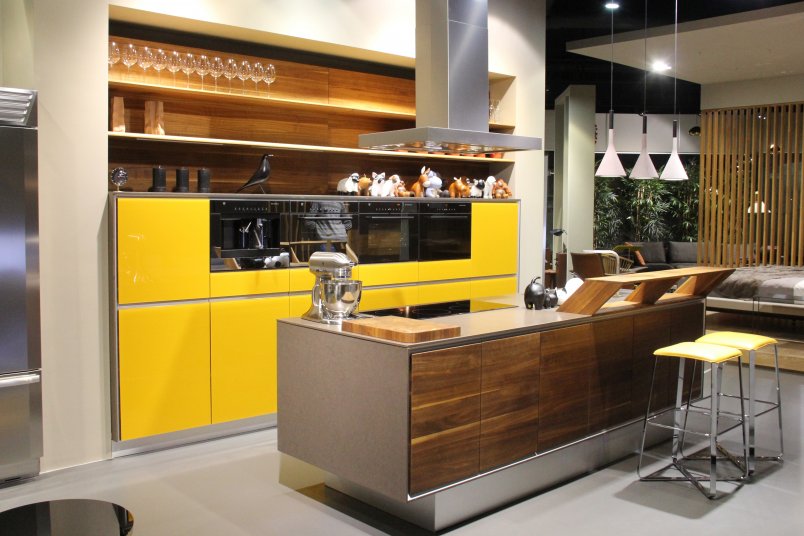 В кухонном интерьере яркий желтый цвет сочетается с деревом.