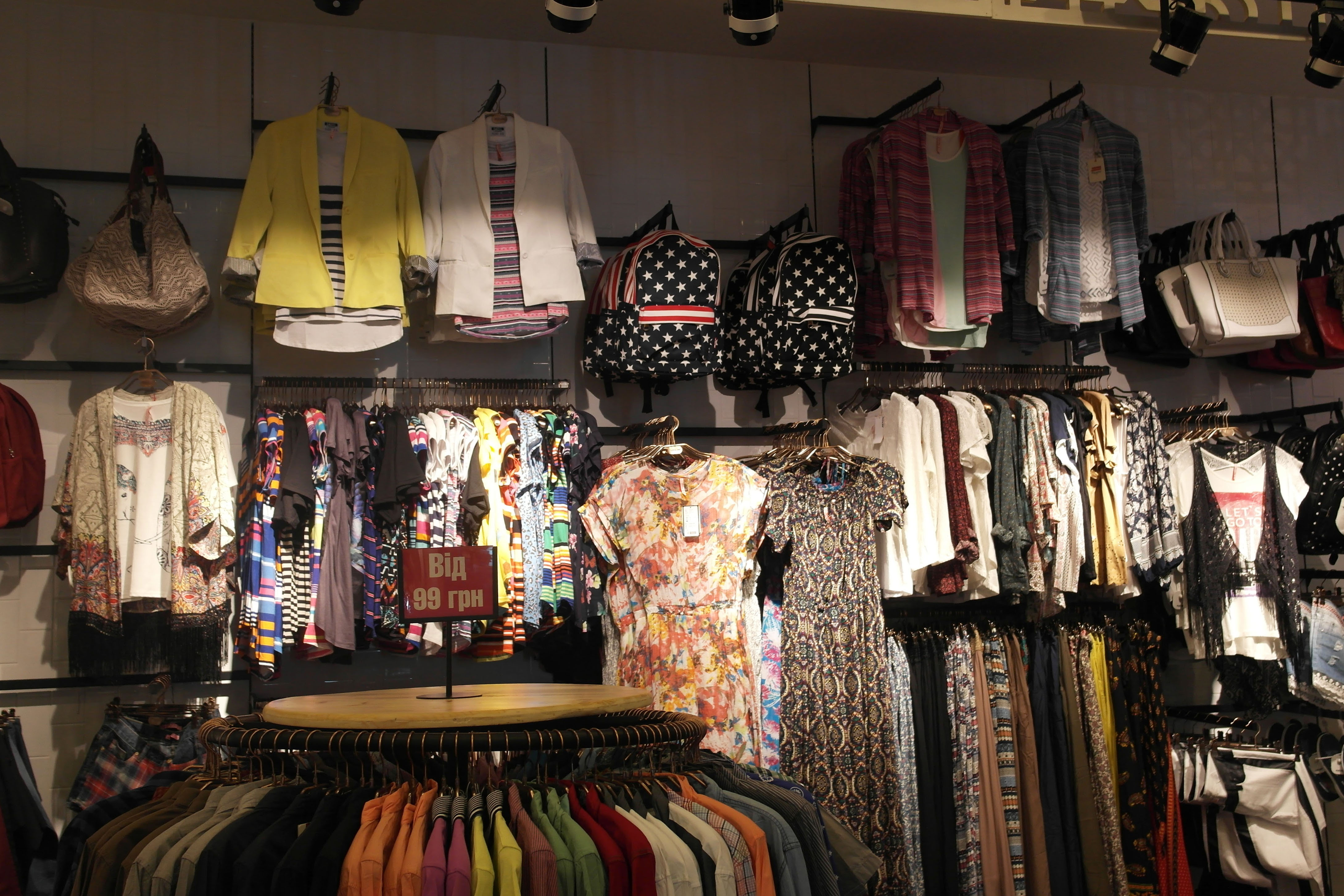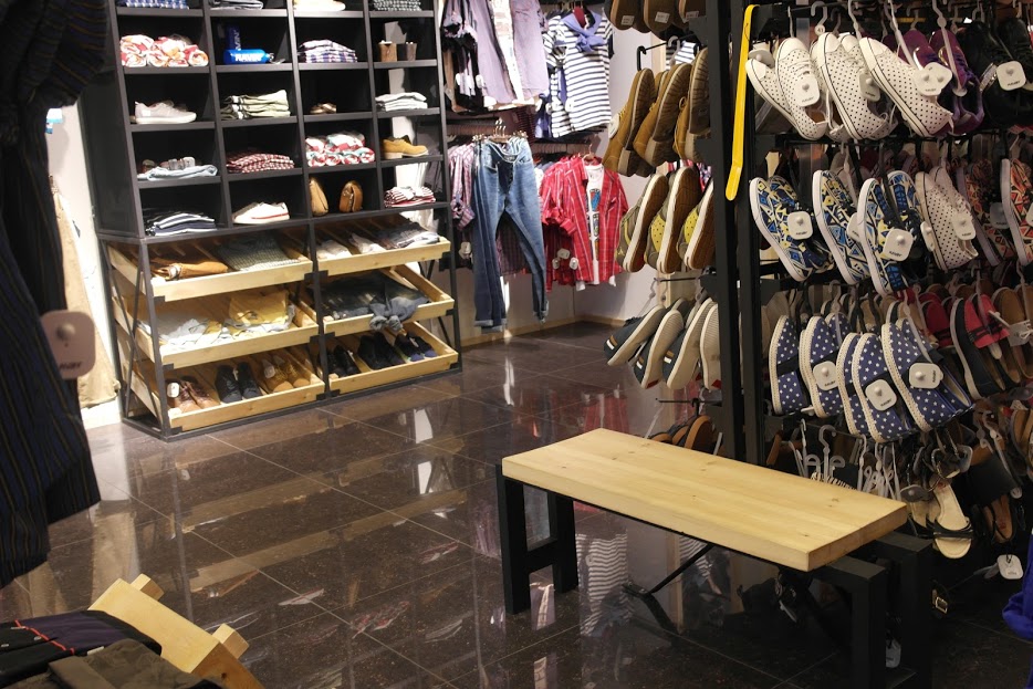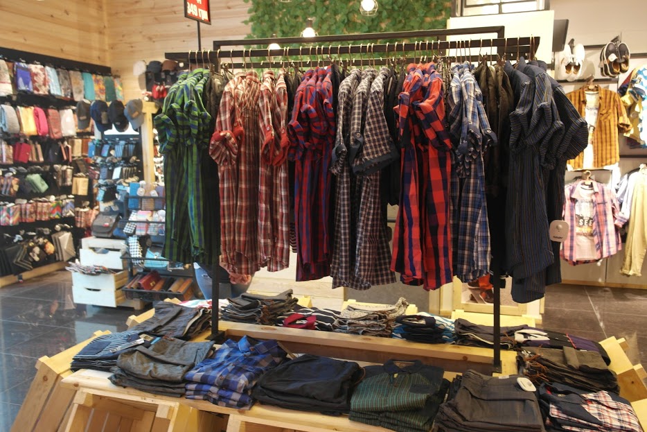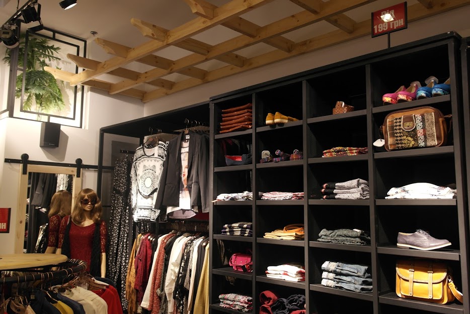 Часть товара хранится в деревянных ящиках, расположенных тут же, под стойками с одеждой и в высоких шкафах в торговом зале.