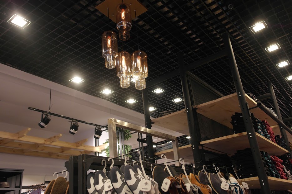 Часть потолочной конструкции также выполнена из деревянных брусьев. Большое внимание деревянным элементам в дизайне уделяют такие украинские ритейлеры, как Comfy, Varus, «Сільпо».