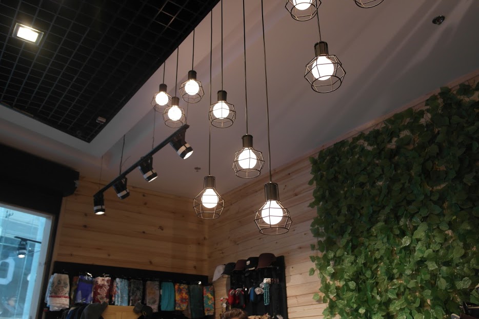 Светильники необычных форм и размеров размещены в разных частях зала. Они выполняют больше декоративную функцию, чем осветительную.
