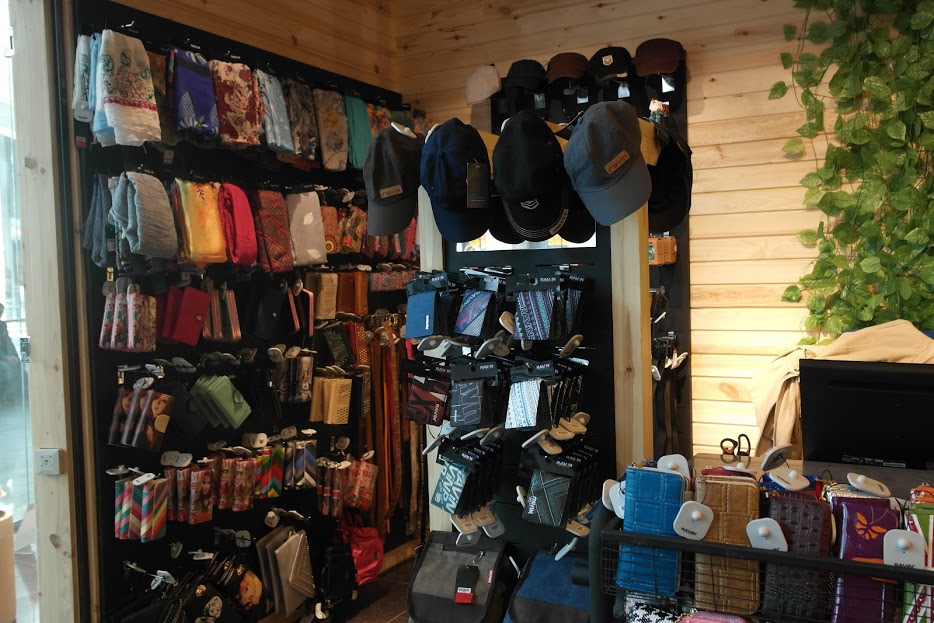 Кроме стен, из дерева выполнены полки, стойки; на скамейки можно присесть отдохнуть или примерить обувь.