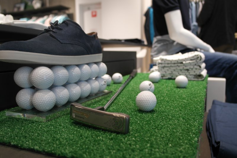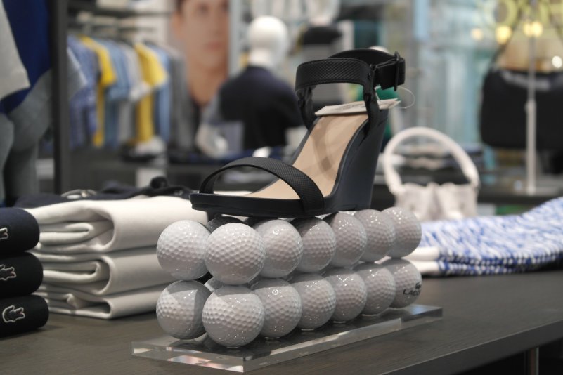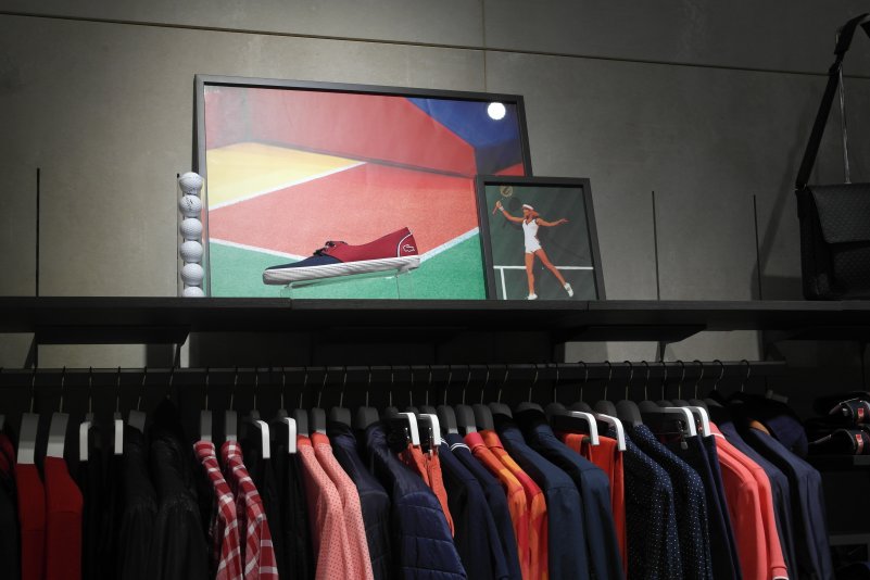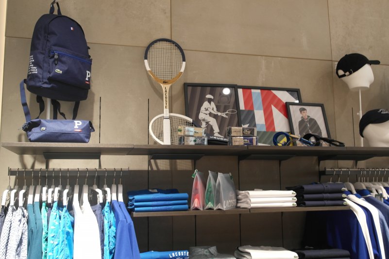 На изображениях по залу можно увидеть фото основателя бренда — Рене Лакоста и других спортсменов. Различные клюшки, теннисные ракетки, мячики и кубки делают акцент на спортивных увлечениях, где одежда бренда будет наиболее удобна и комфортна: теннис, гольф, яхтинг.