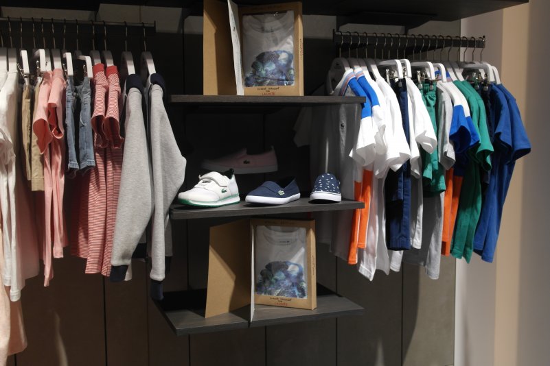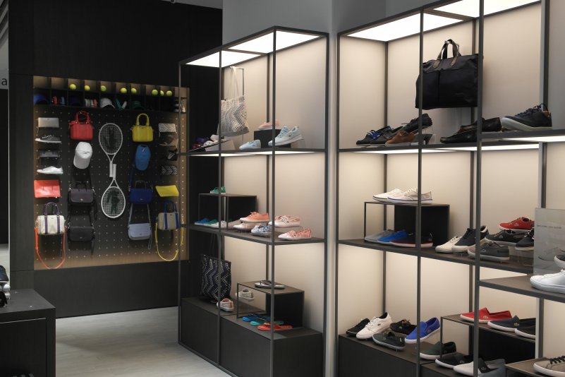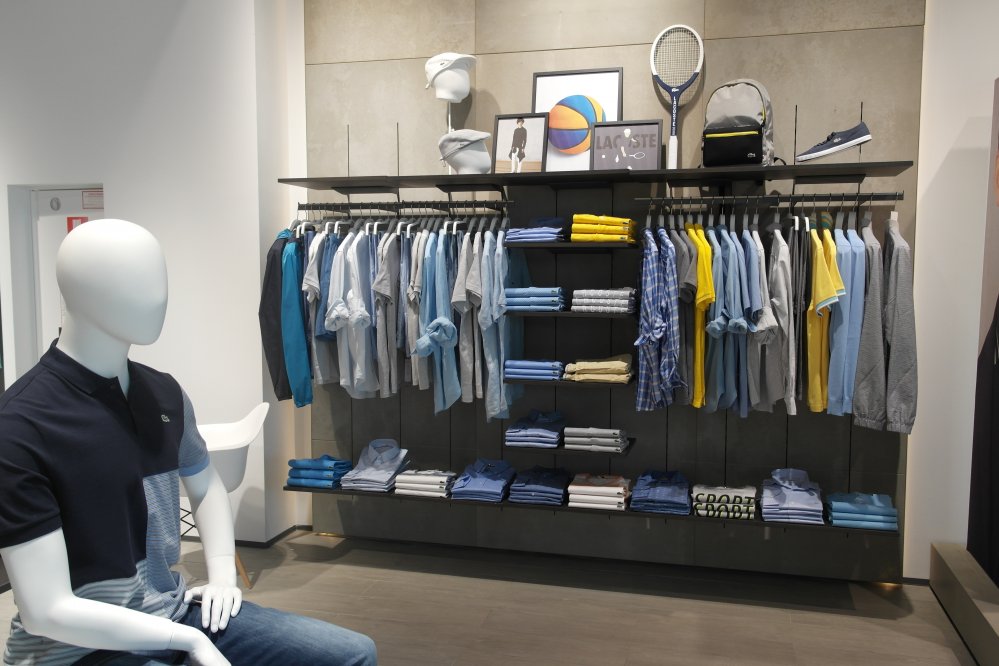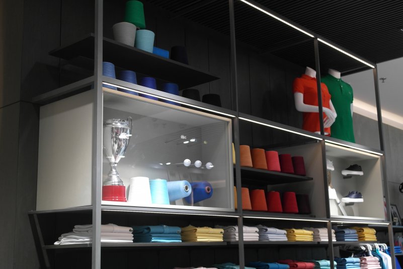 Важным элементом магазина является Polo Wall — зона рубашек-поло. Именно с рубашки-поло началась история бренда Lacoste, поэтому им уделено особое внимание в интерьере и представленности в бутике.