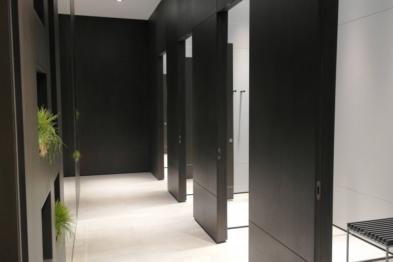 В зоне примерочных стены оснащены огромными зеркалами, визуально увеличивающими пространство. Контрастная цветовая гамма с использованием травянистых оттенков придает интерьеру современный и динамичный облик, наиболее точно отображающий ценности бренда Lacoste.