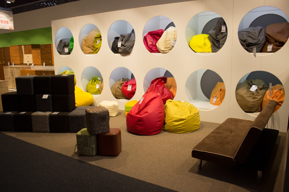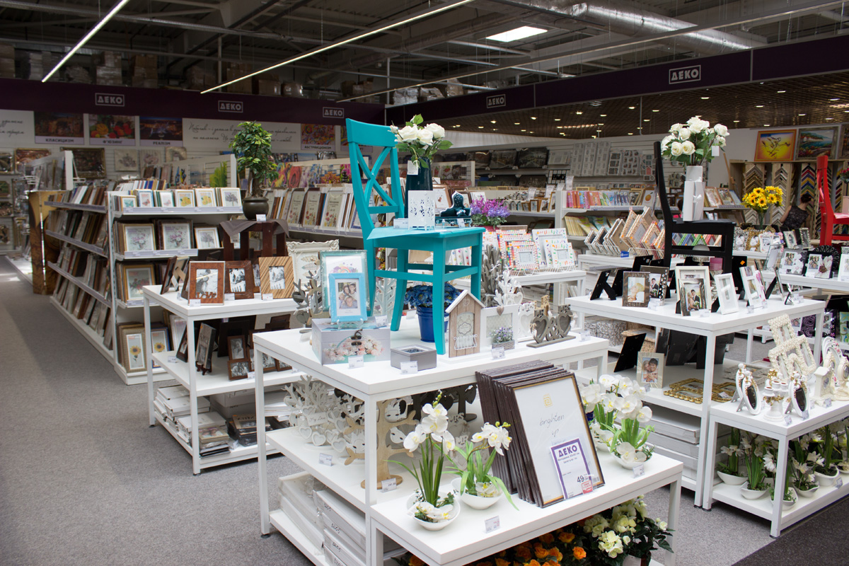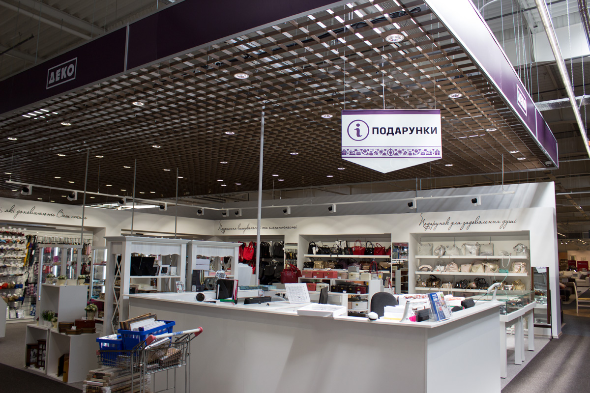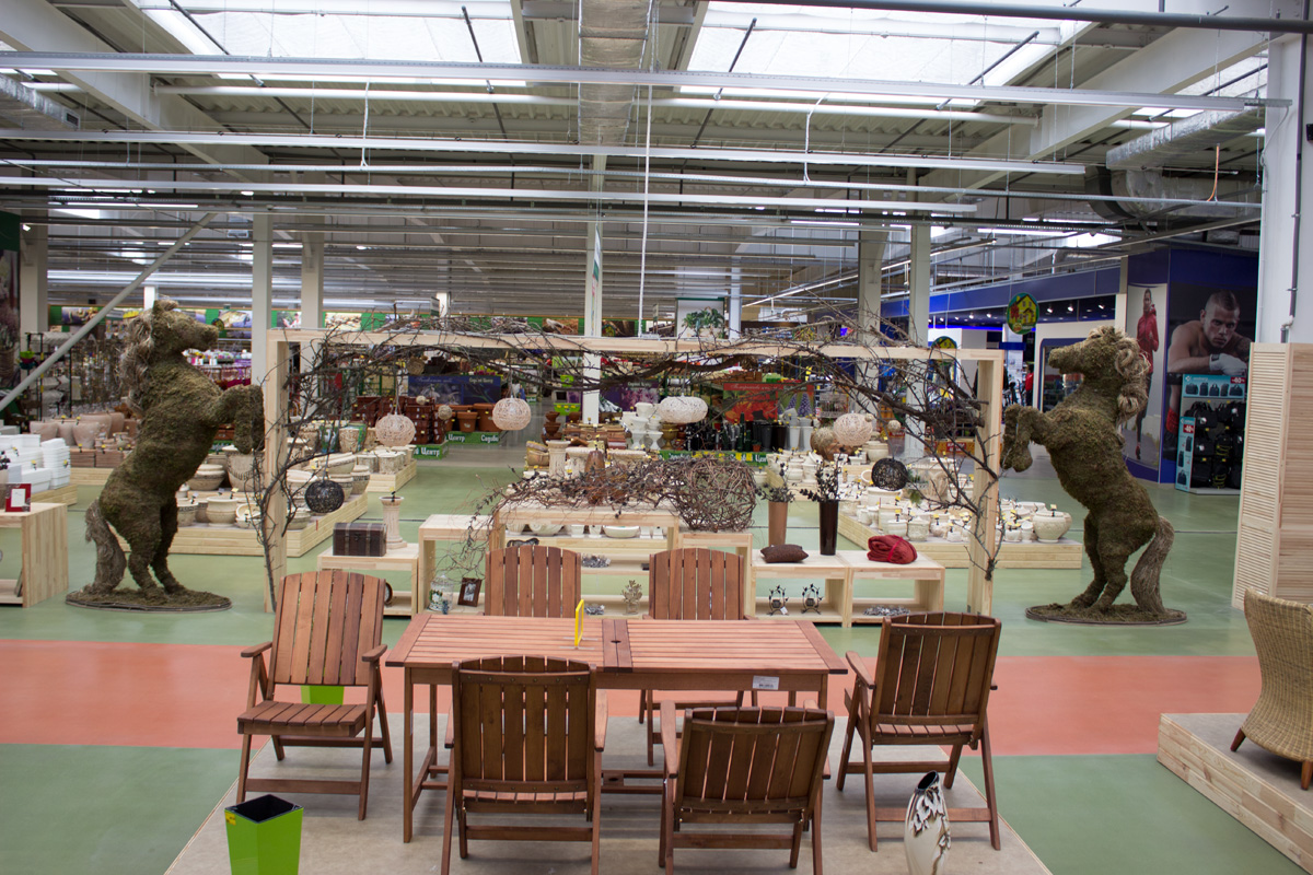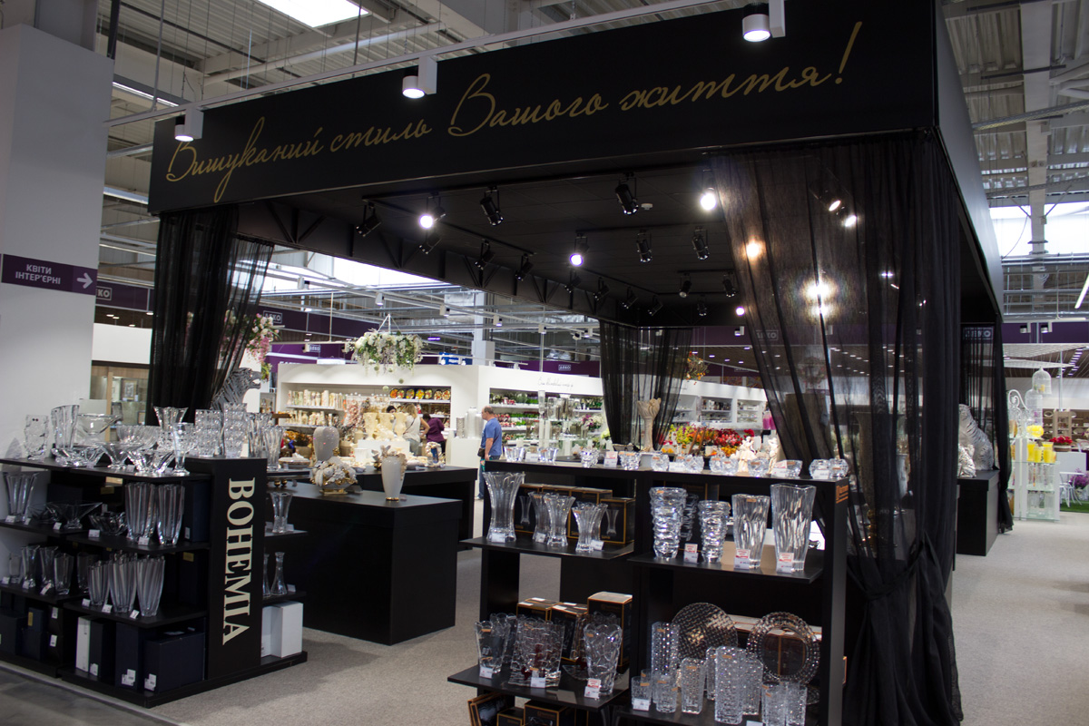 На территории гипермаркета размещены экспозиции товарных групп, выполненные в виде готовых интерьерных решений (готовые кухни, ванные комнаты, гостиные и т.д.).