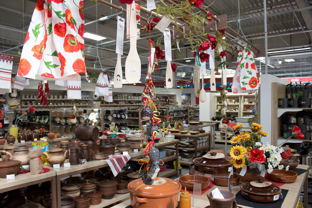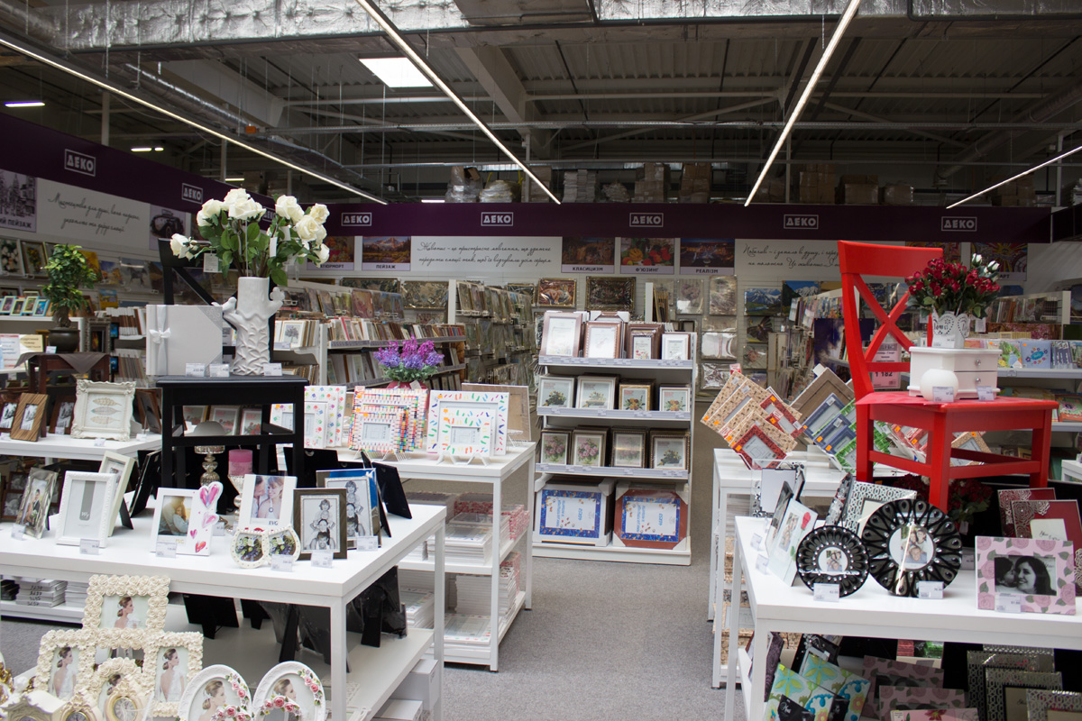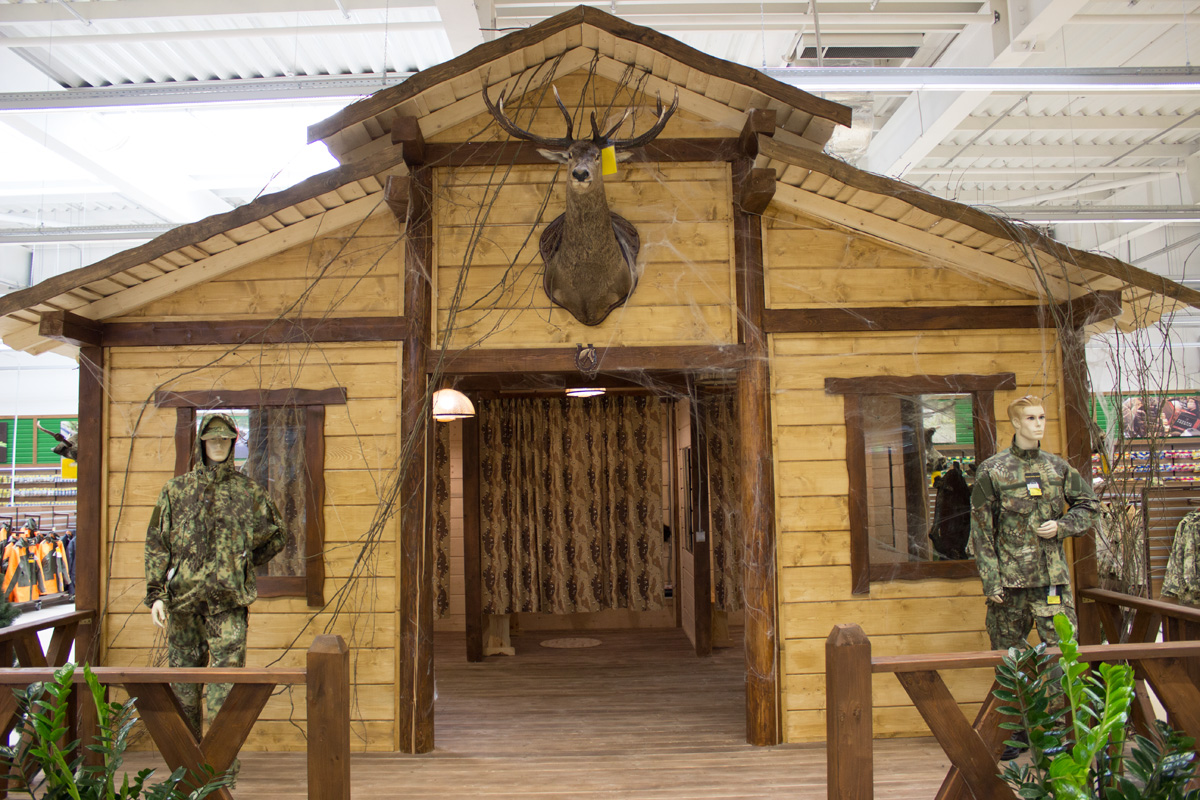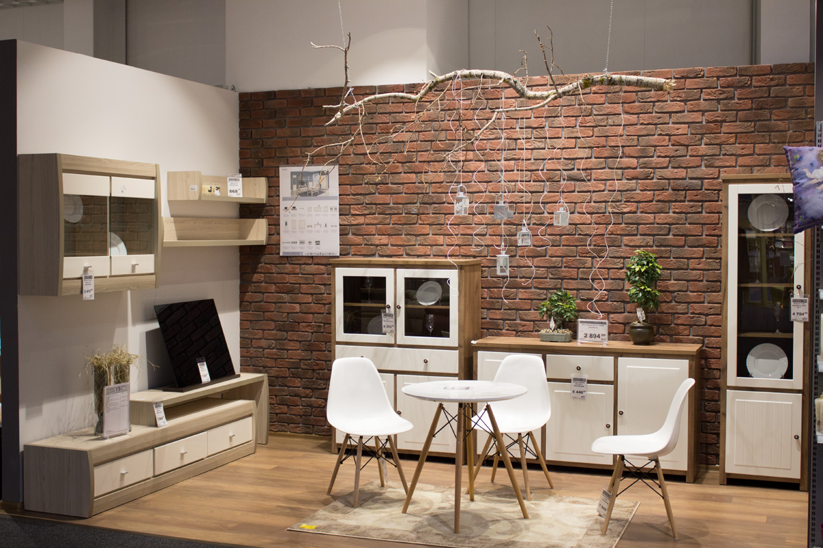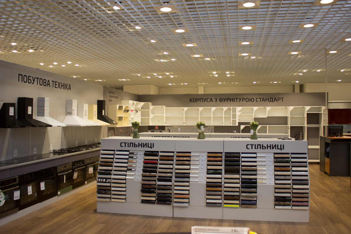 На территории гипермаркета размещены экспозиции товарных групп, выполненные в виде готовых интерьерных решений (готовые кухни, ванные комнаты, гостиные и т.д.).