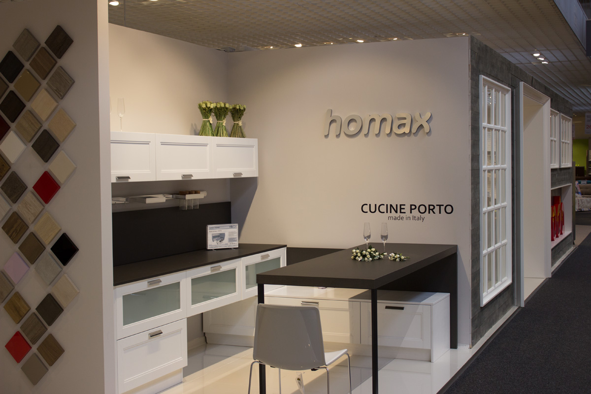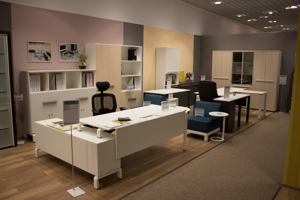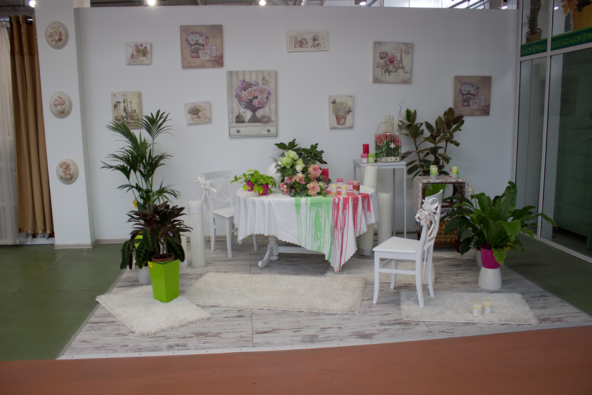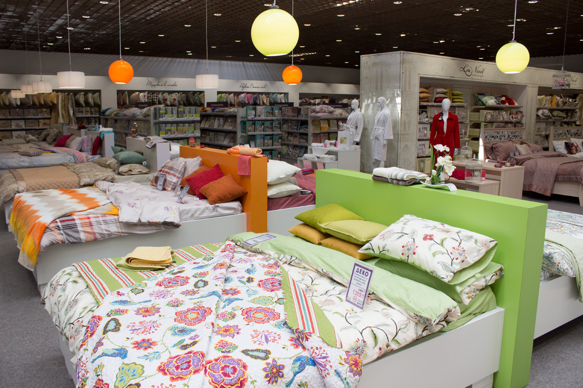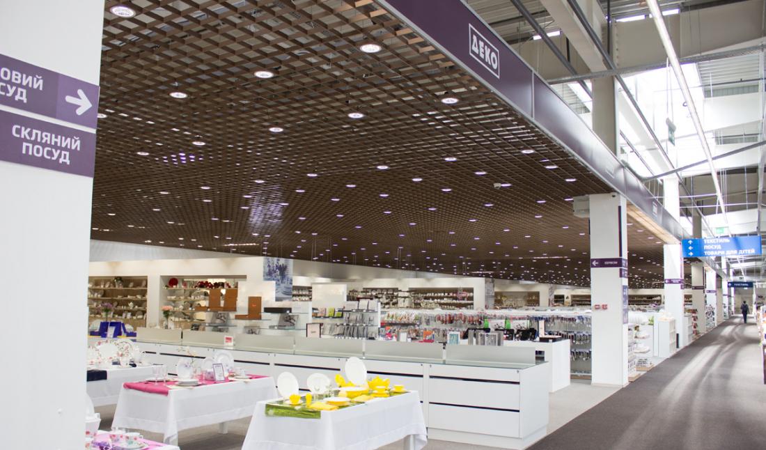 На территории гипермаркета размещены экспозиции товарных групп, выполненные в виде готовых интерьерных решений (готовые кухни, ванные комнаты, гостиные и т.д.).