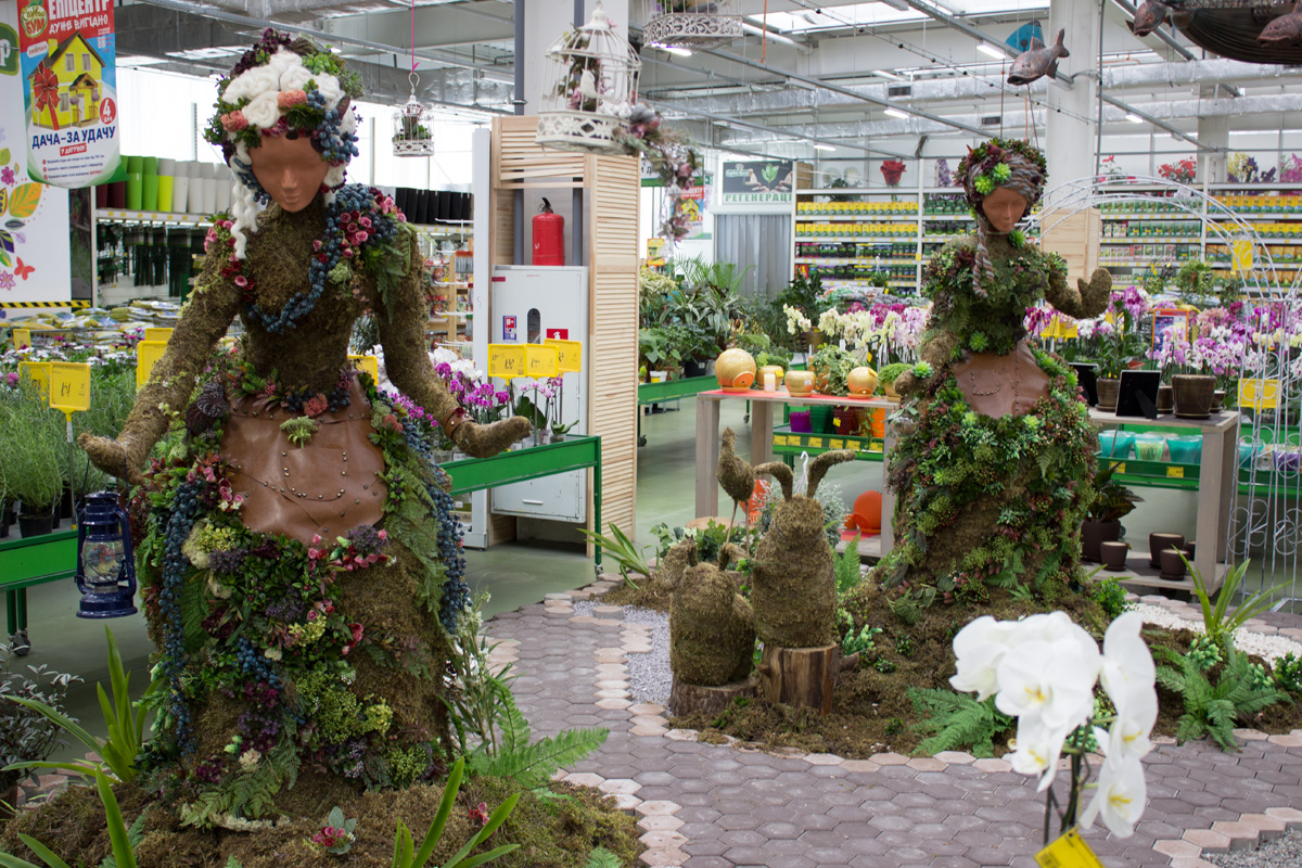Садовый центр украшают живые скульптуры.