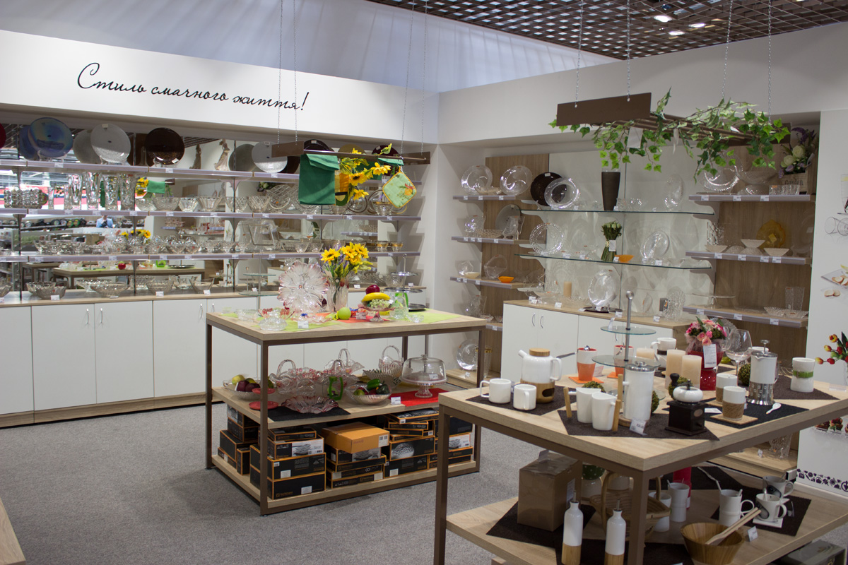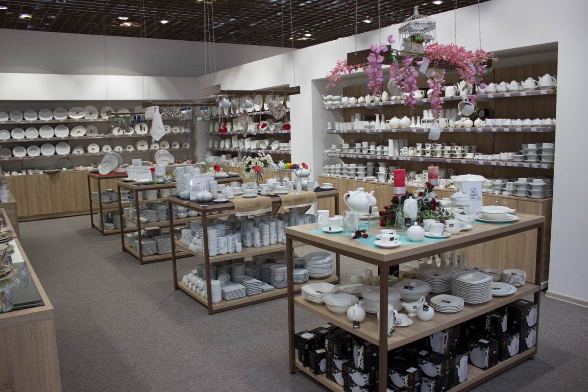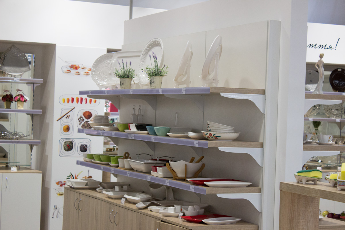 В отделе посуды торговые стеллажи выполнены в белом цвете.