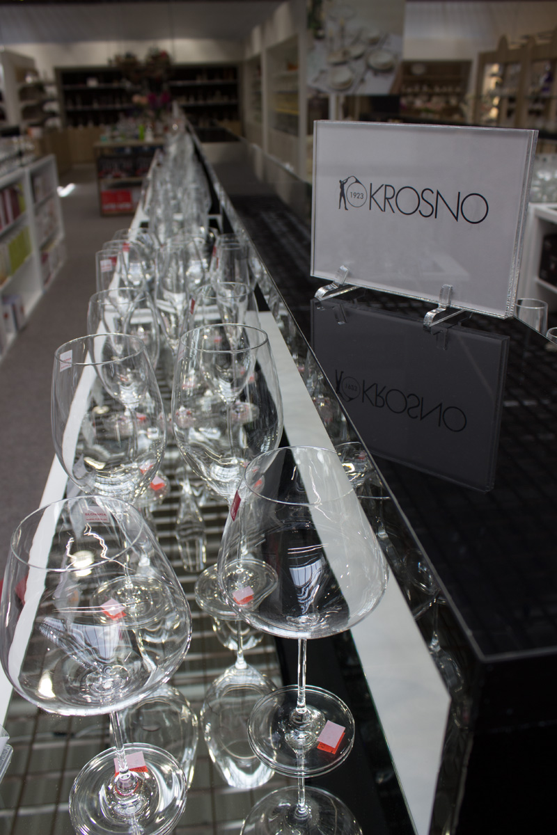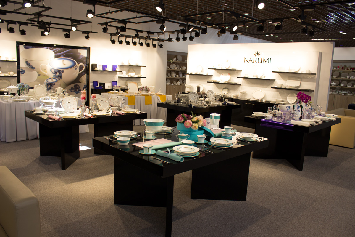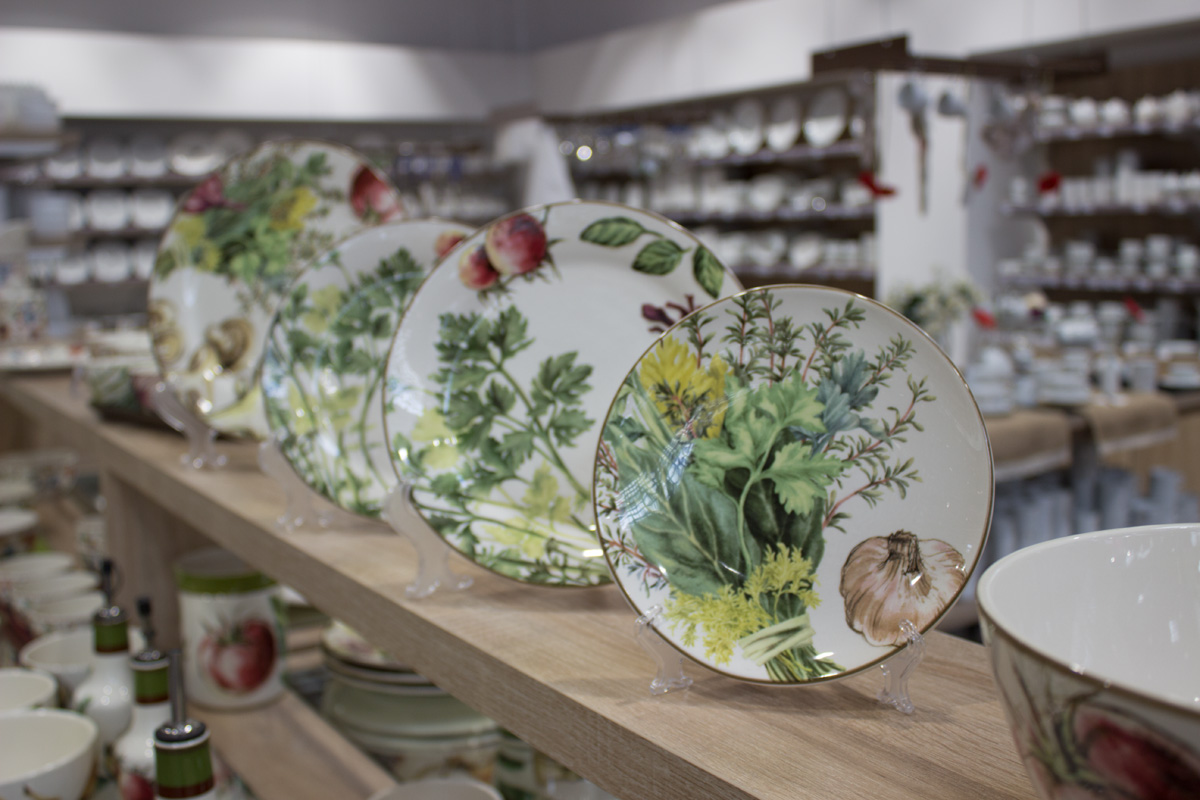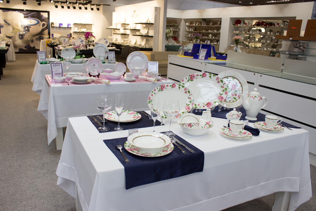 В отделе посуды торговые стеллажи выполнены в белом цвете.