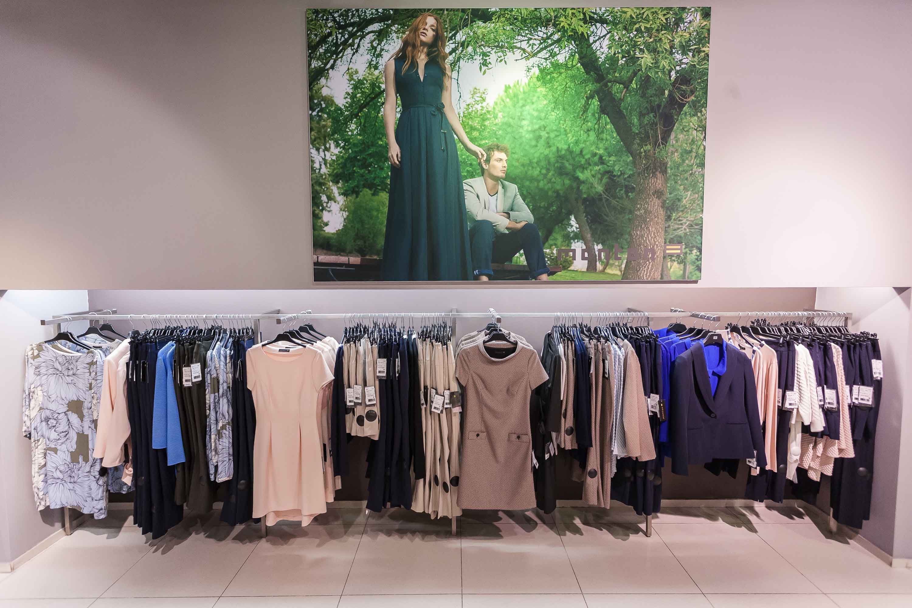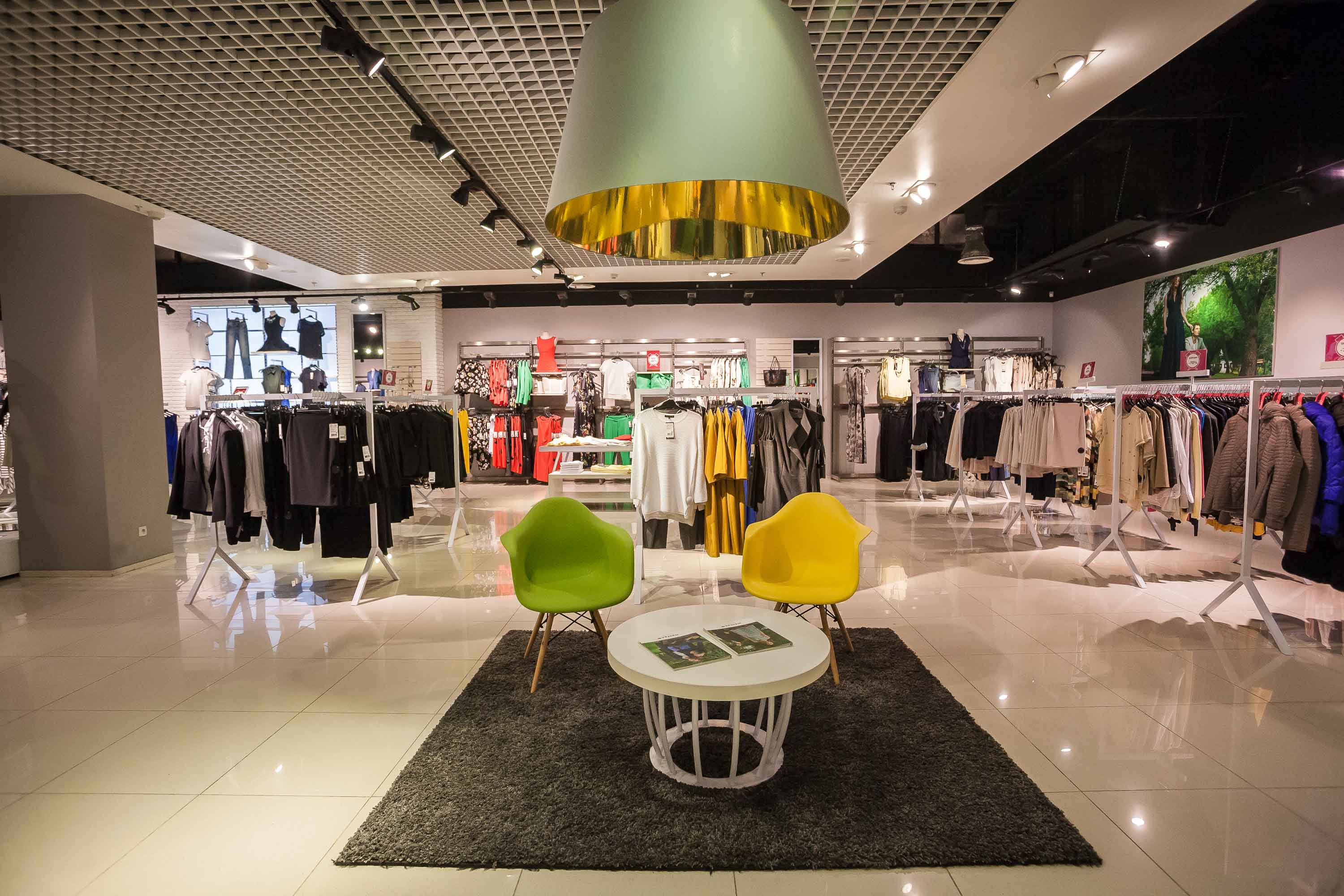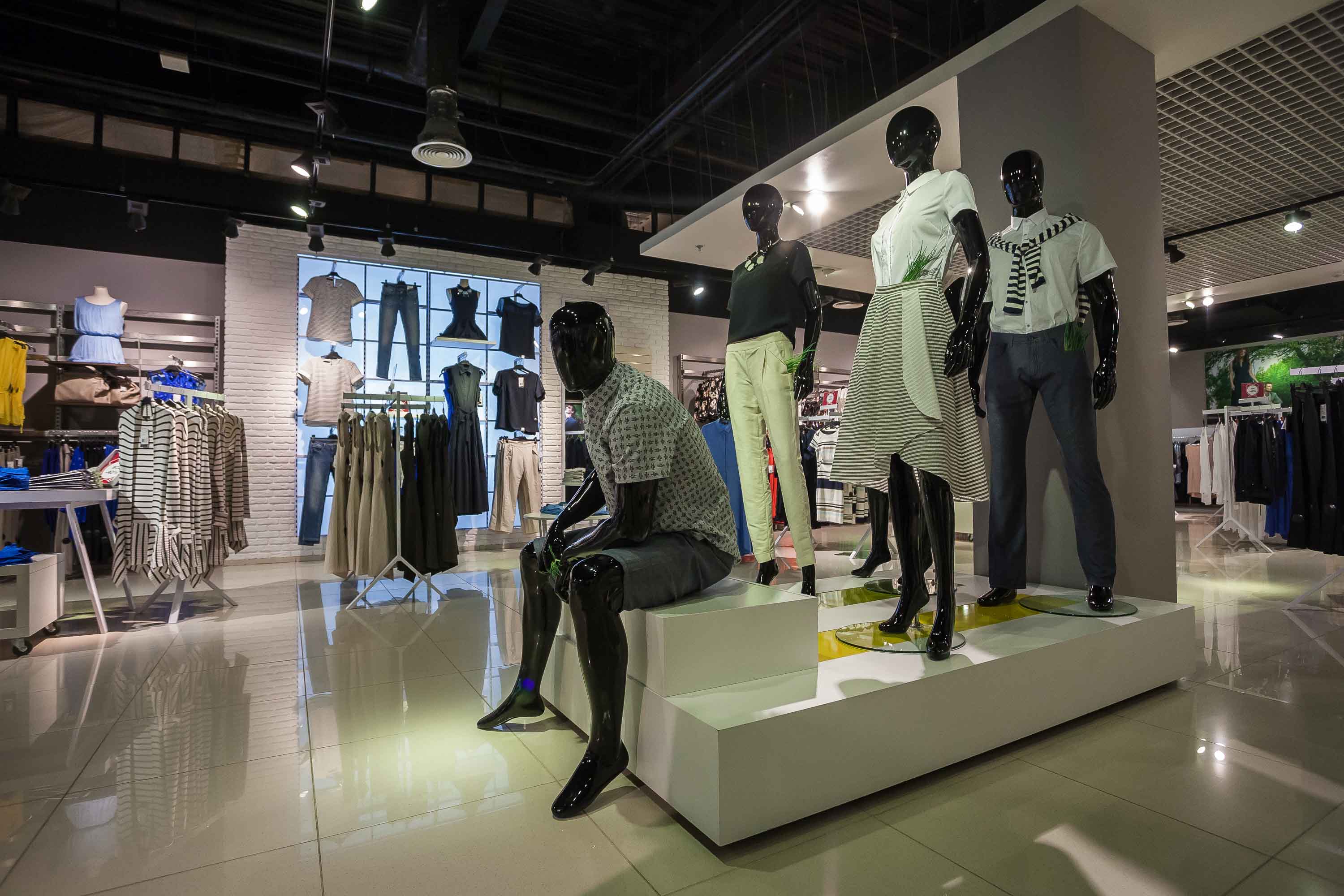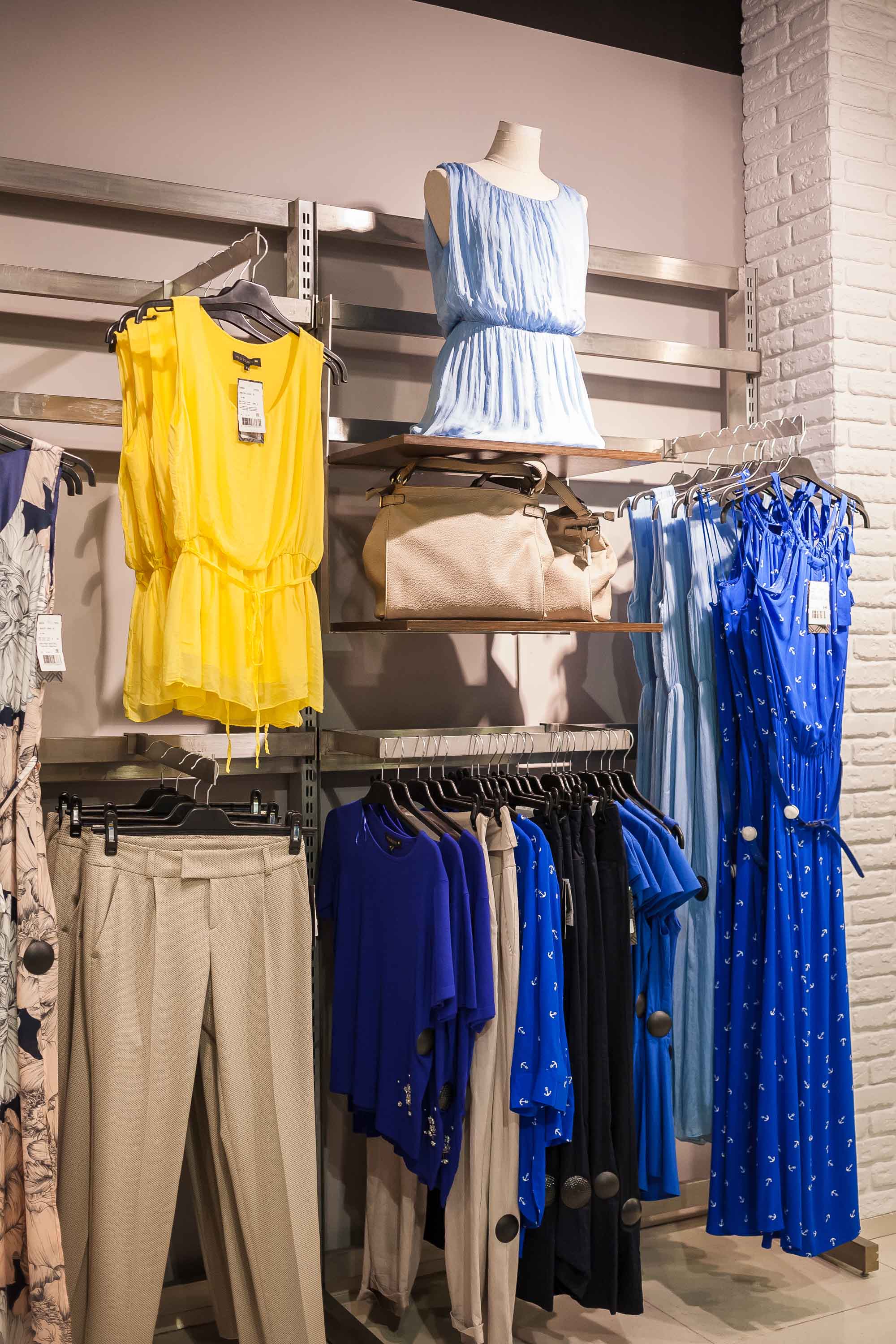 Зал разделен на женскую и мужскую части. Далее одежда выложена исходя из цветового решения коллекции.
