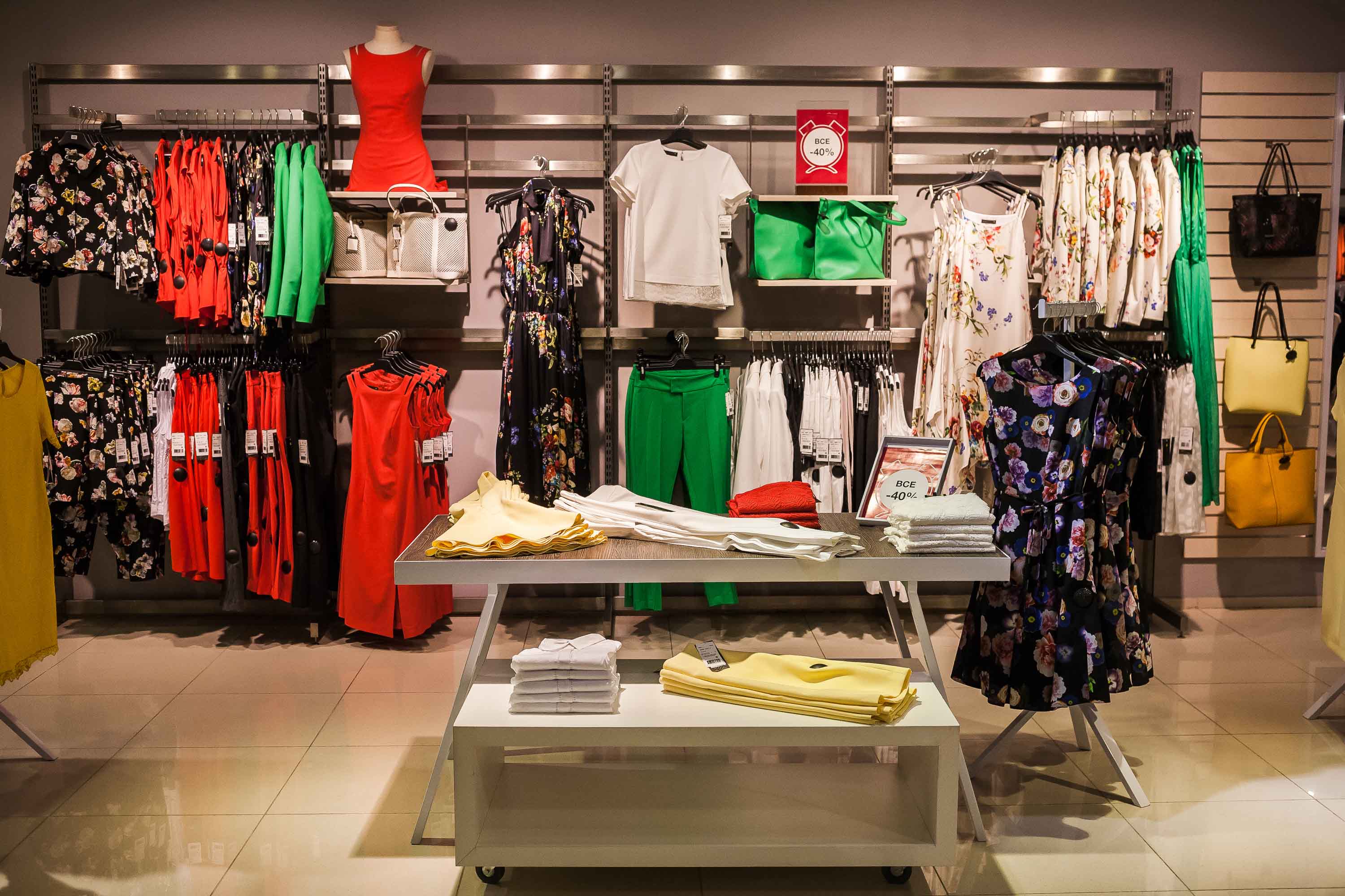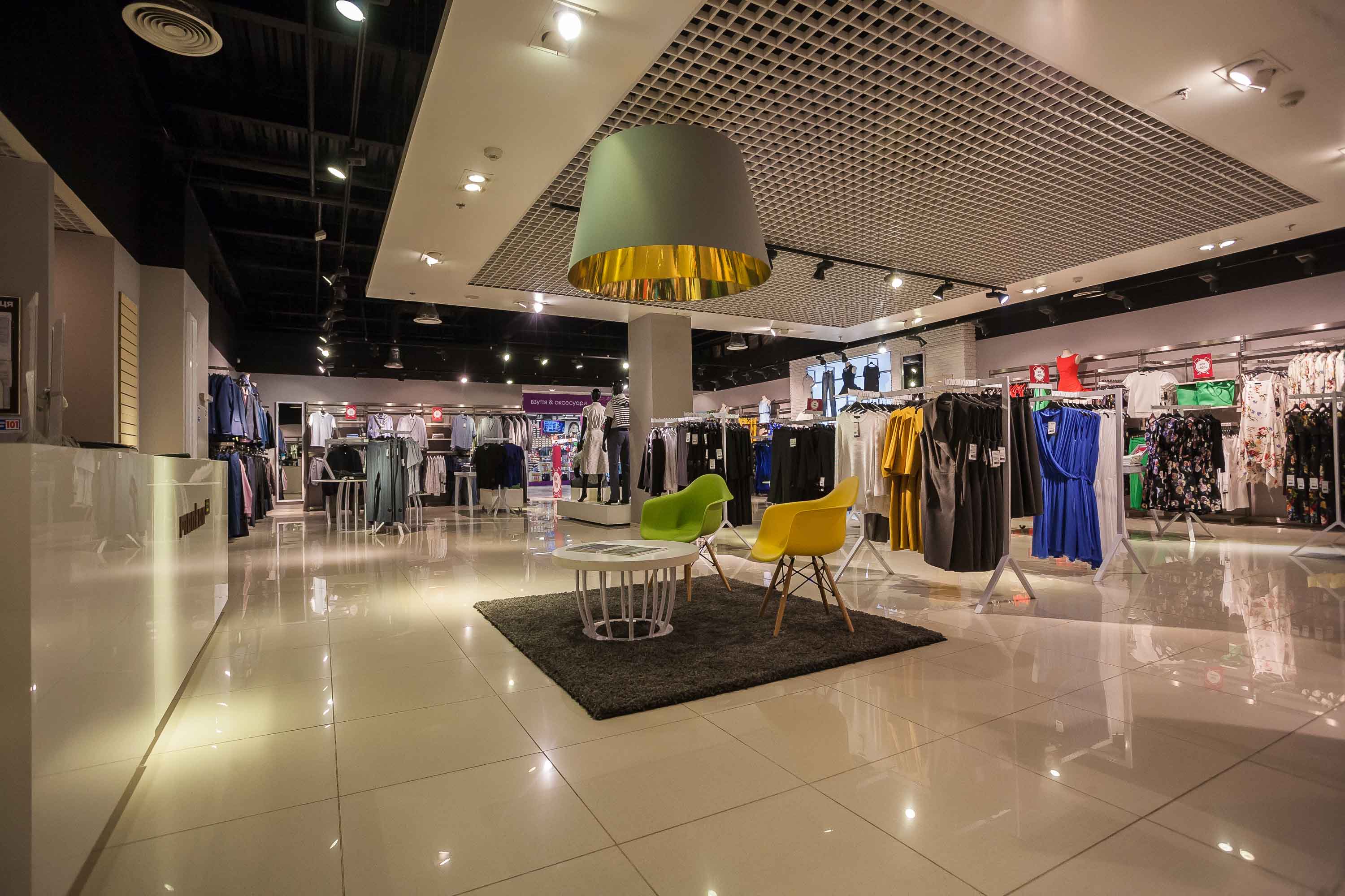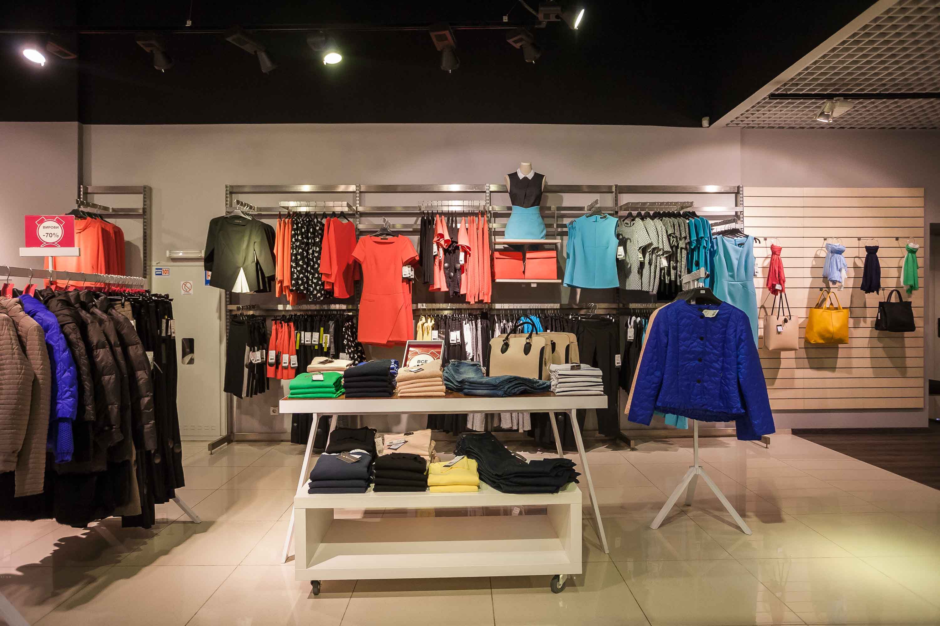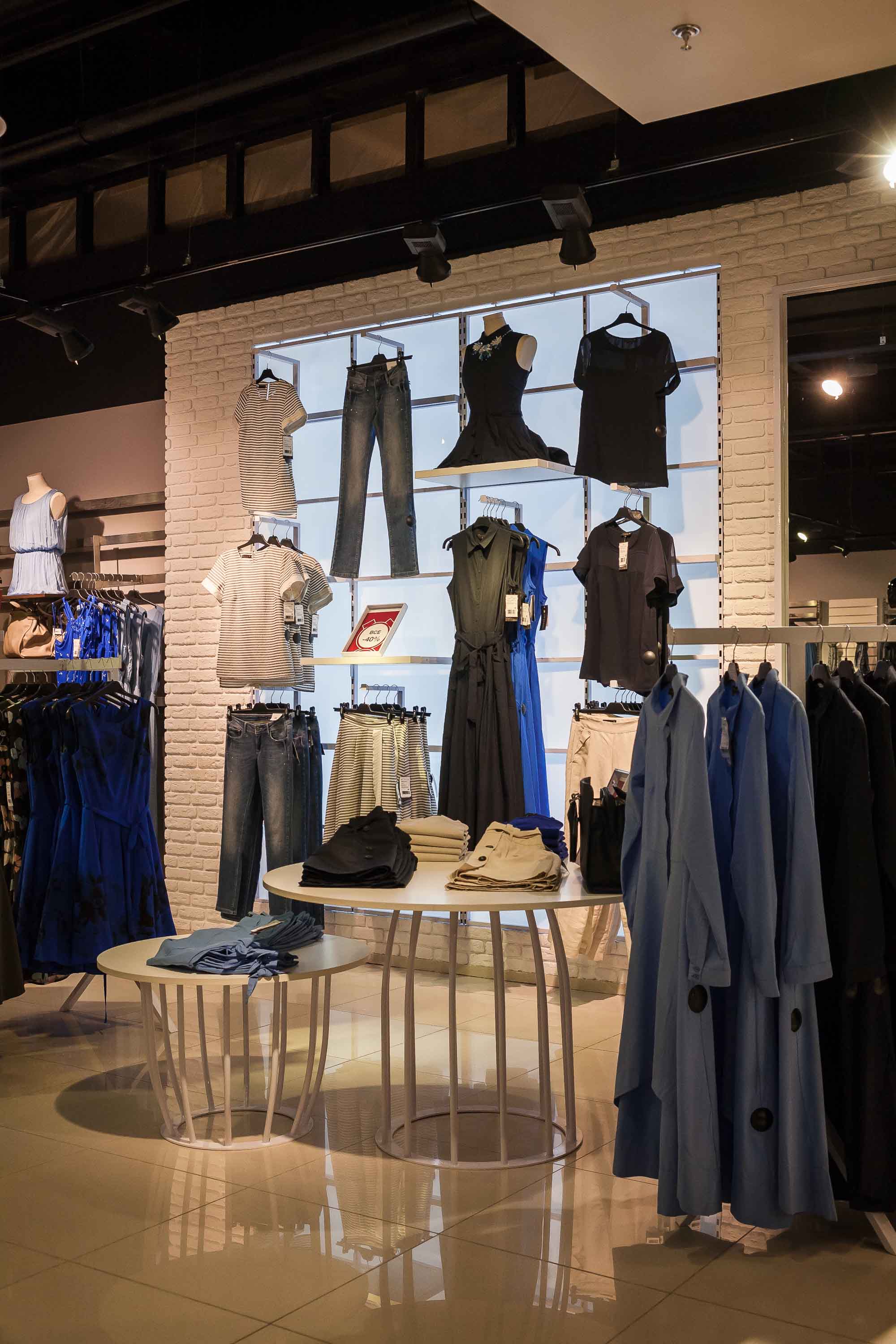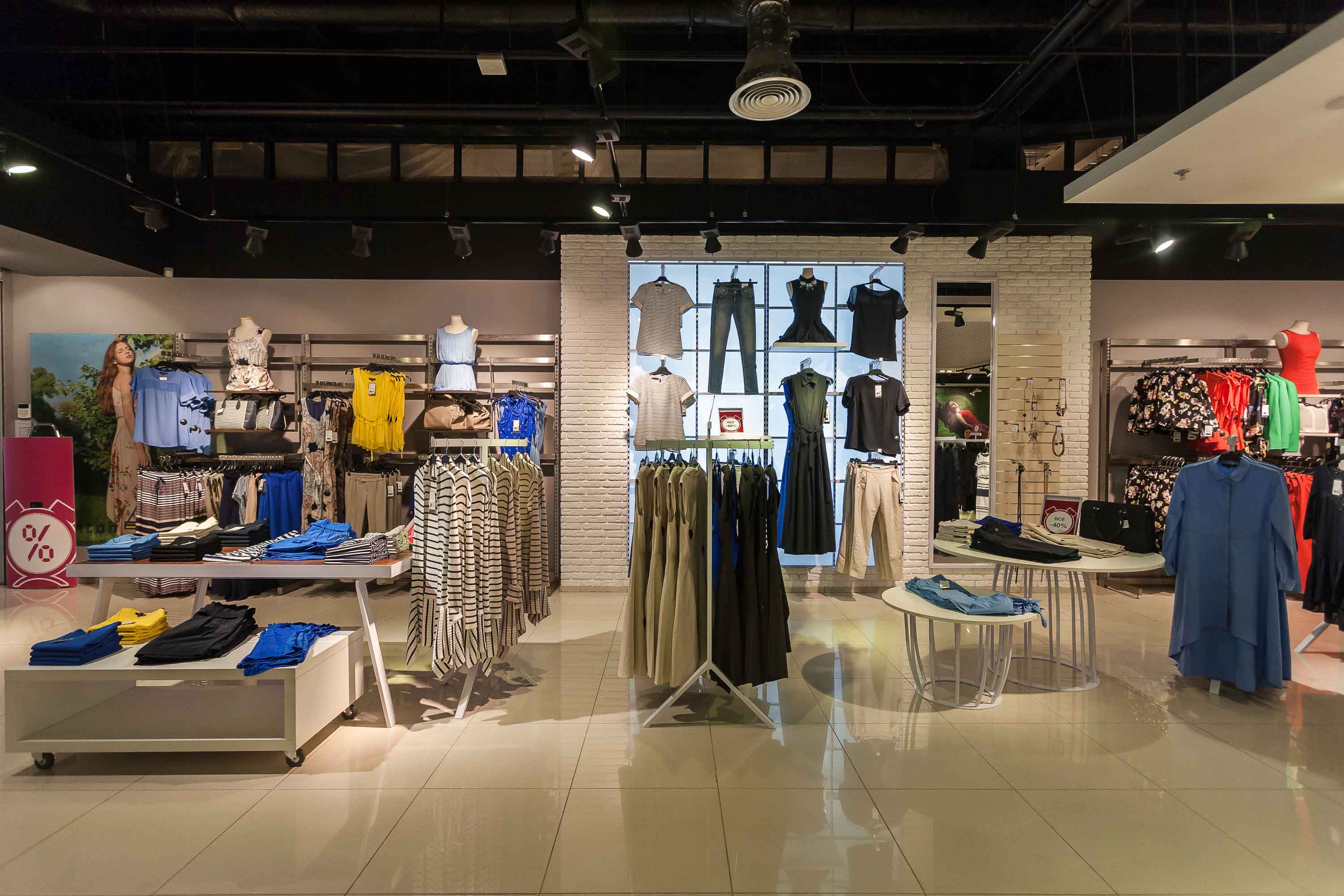 Зал разделен на женскую и мужскую части. Далее одежда выложена исходя из цветового решения коллекции.
