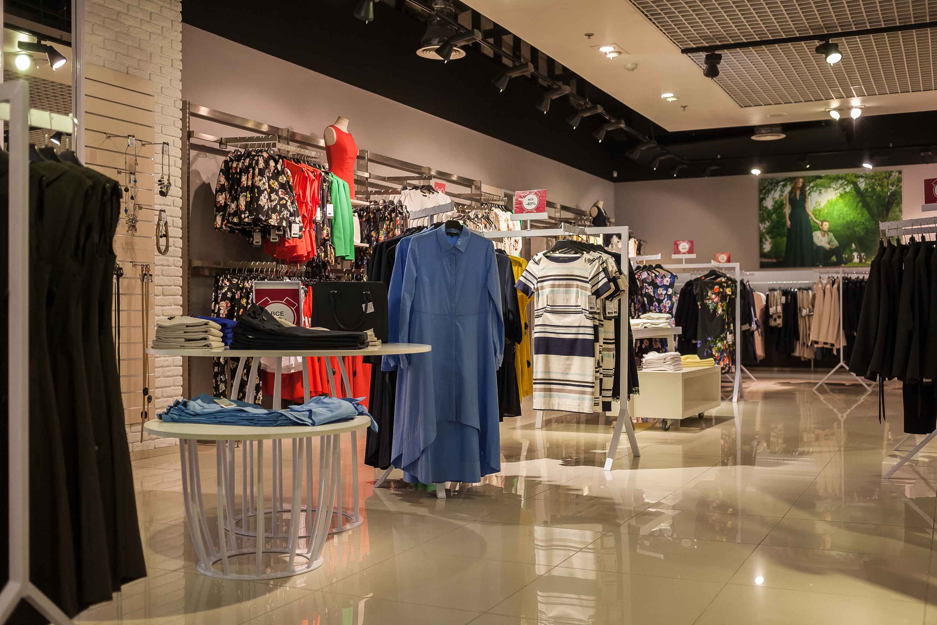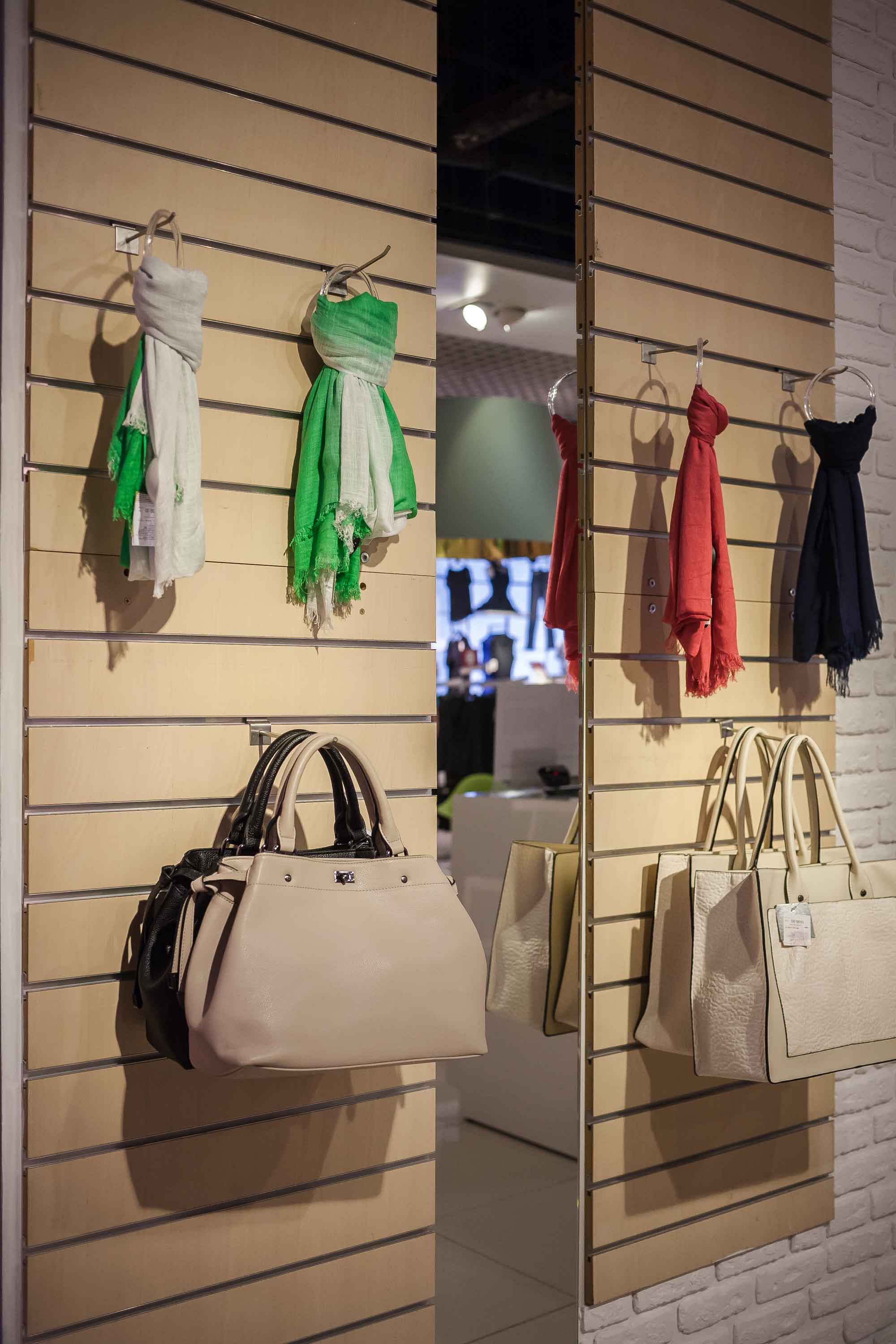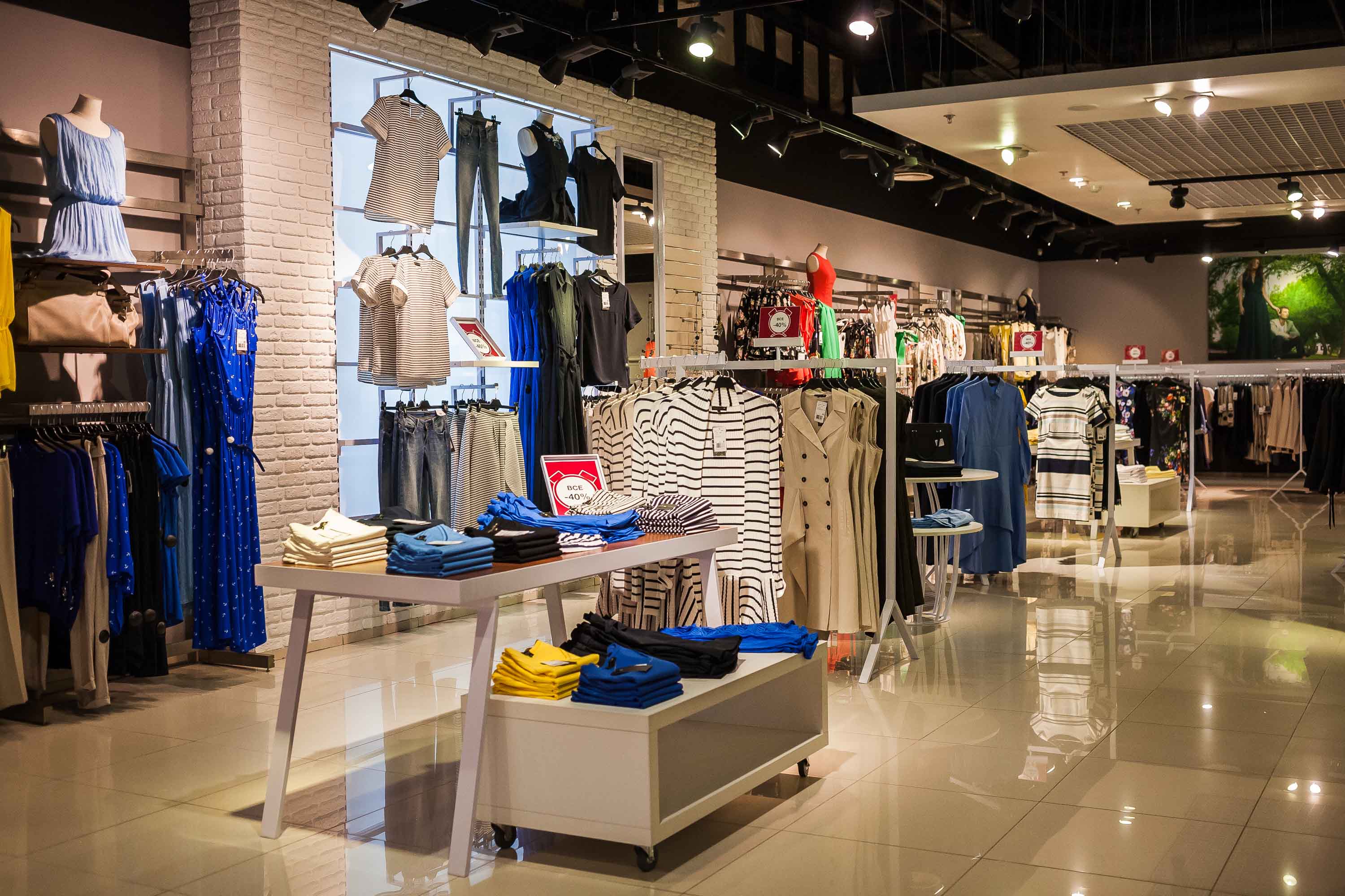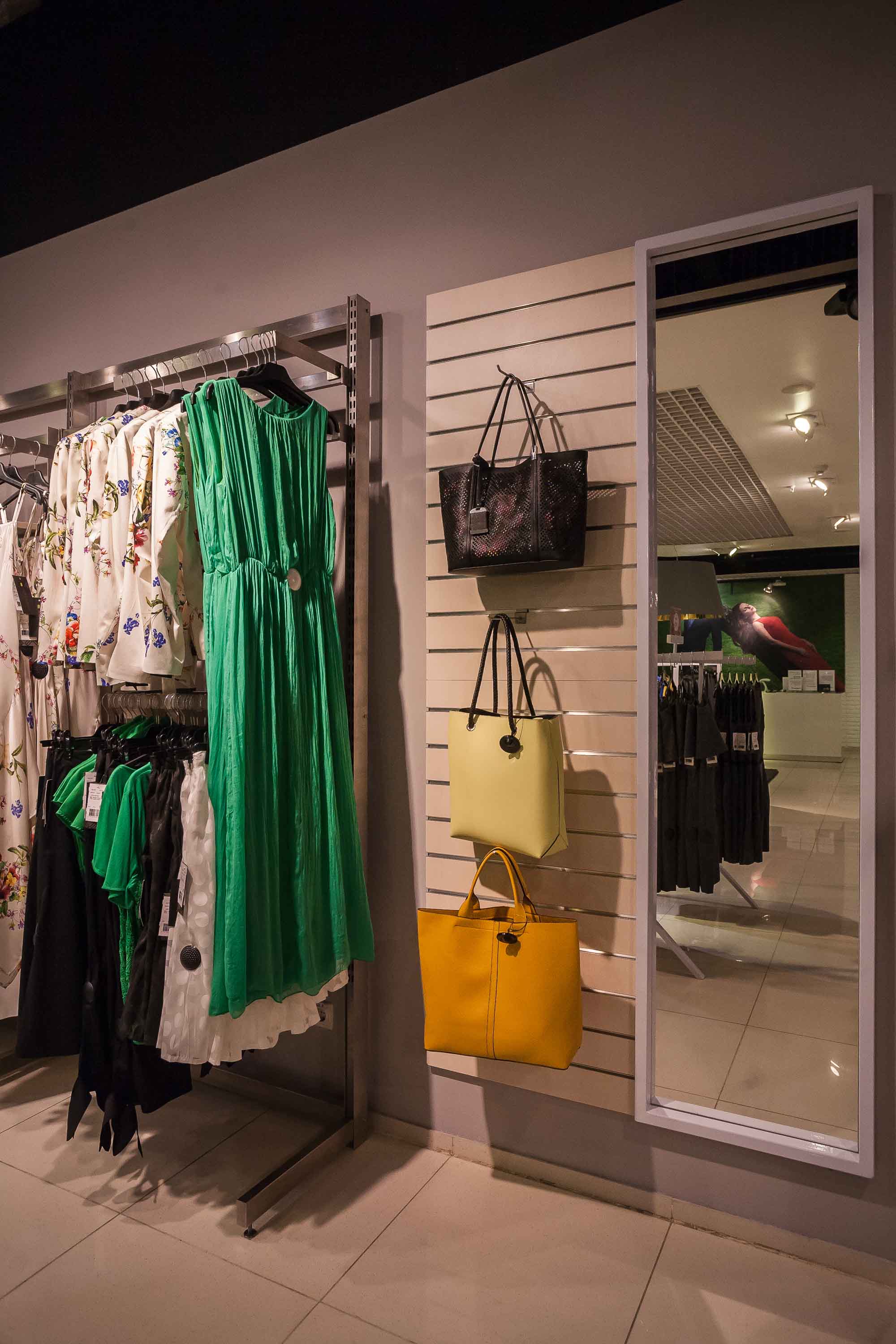 Зал разделен на женскую и мужскую части. Далее одежда выложена исходя из цветового решения коллекции.