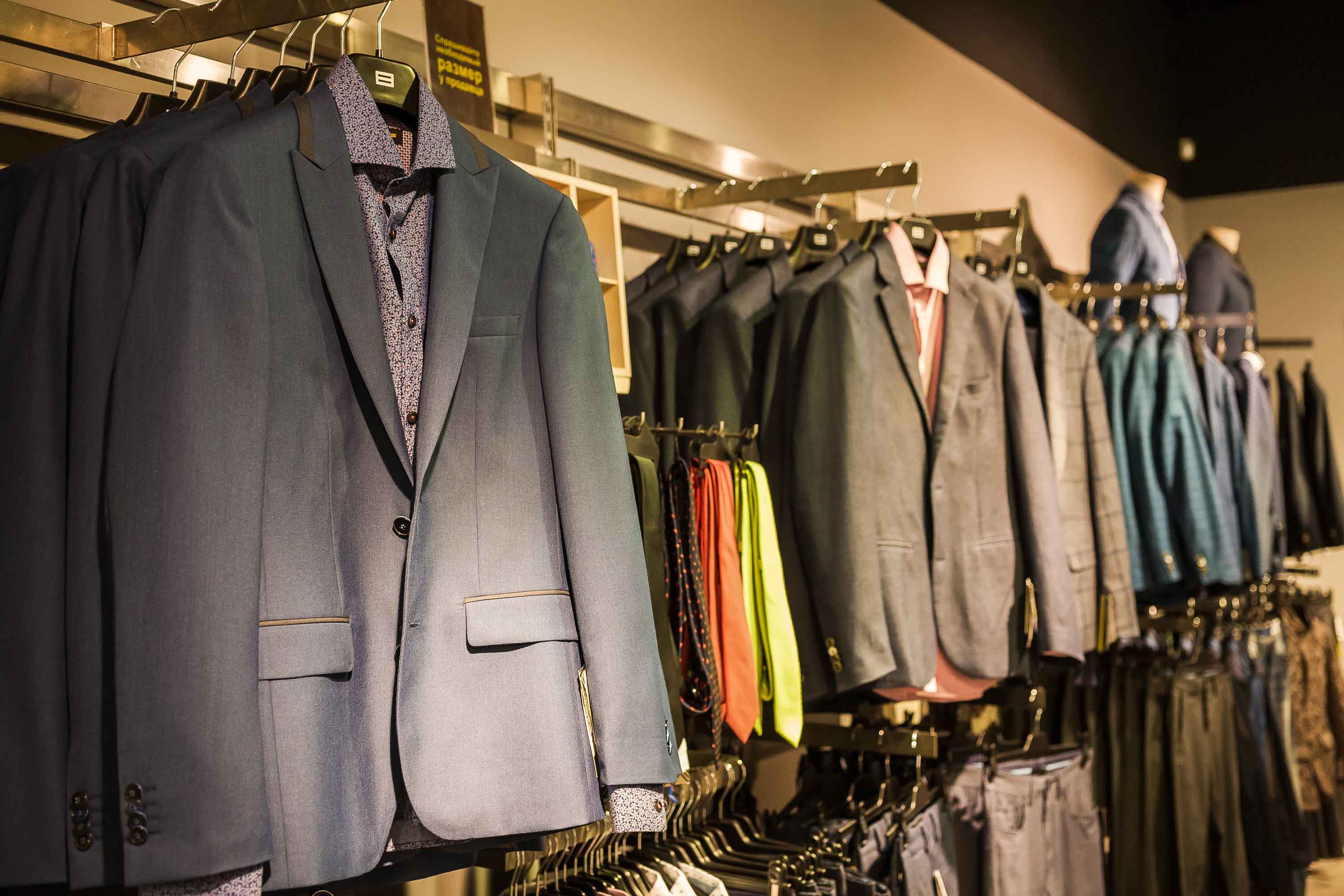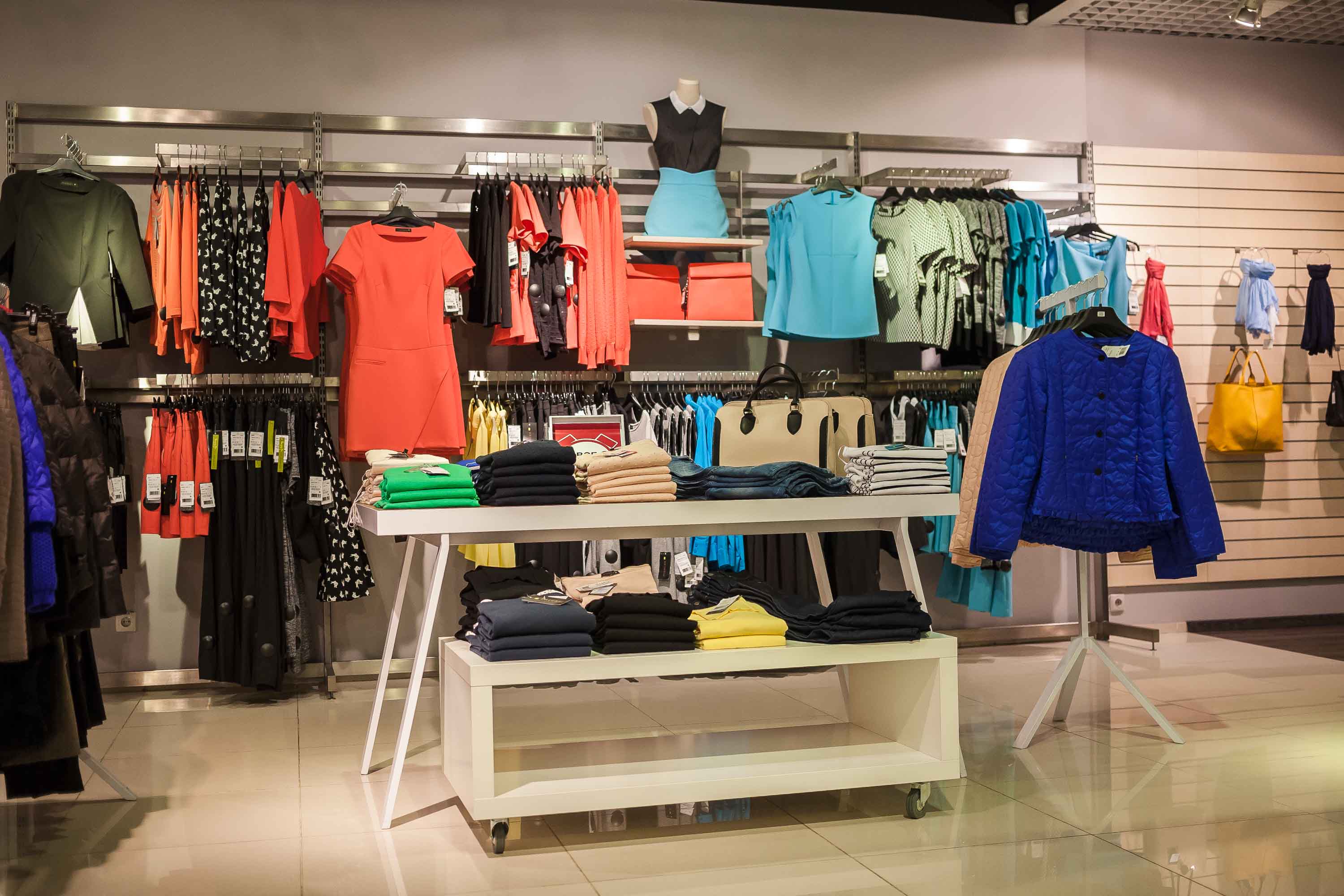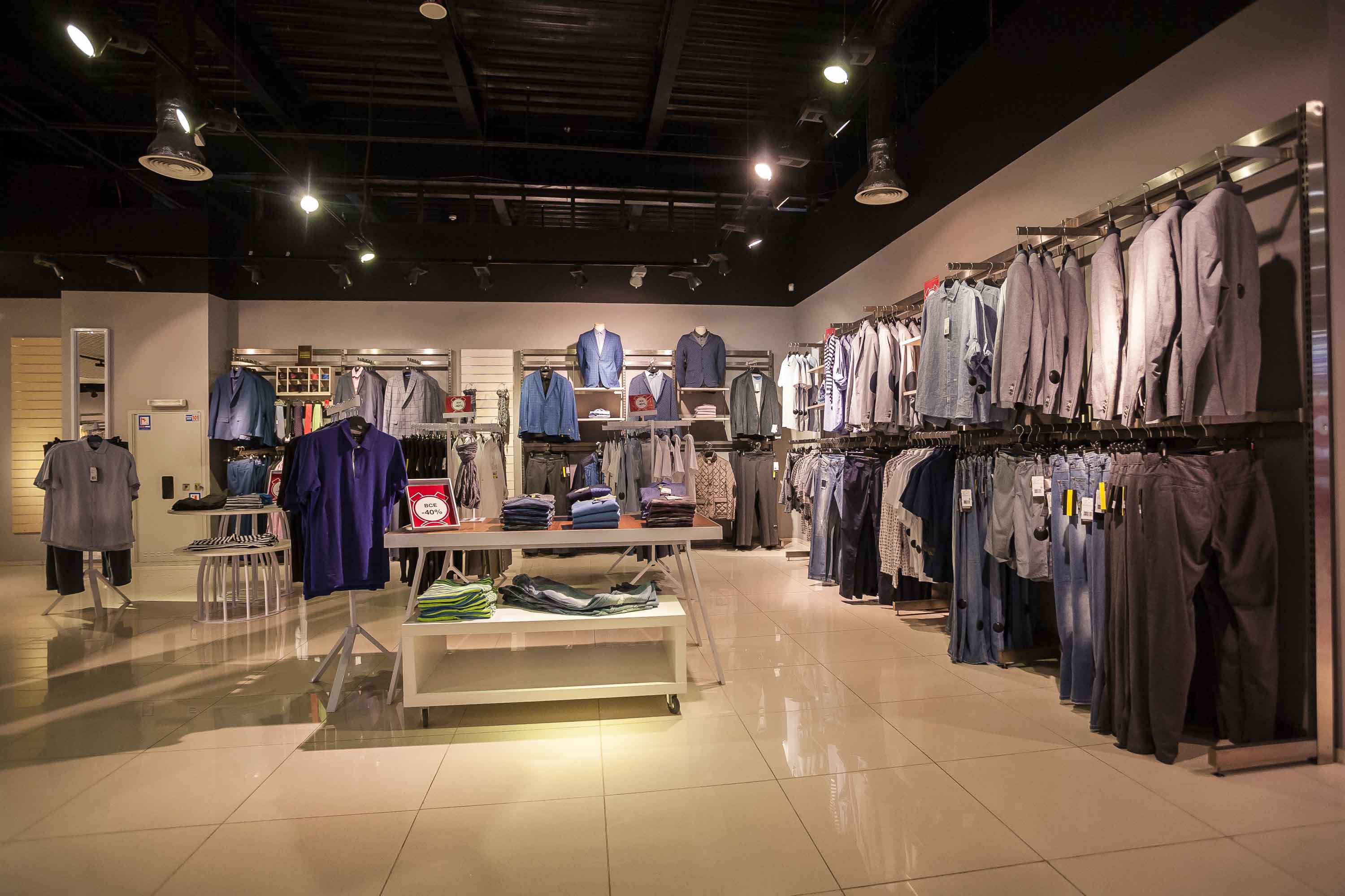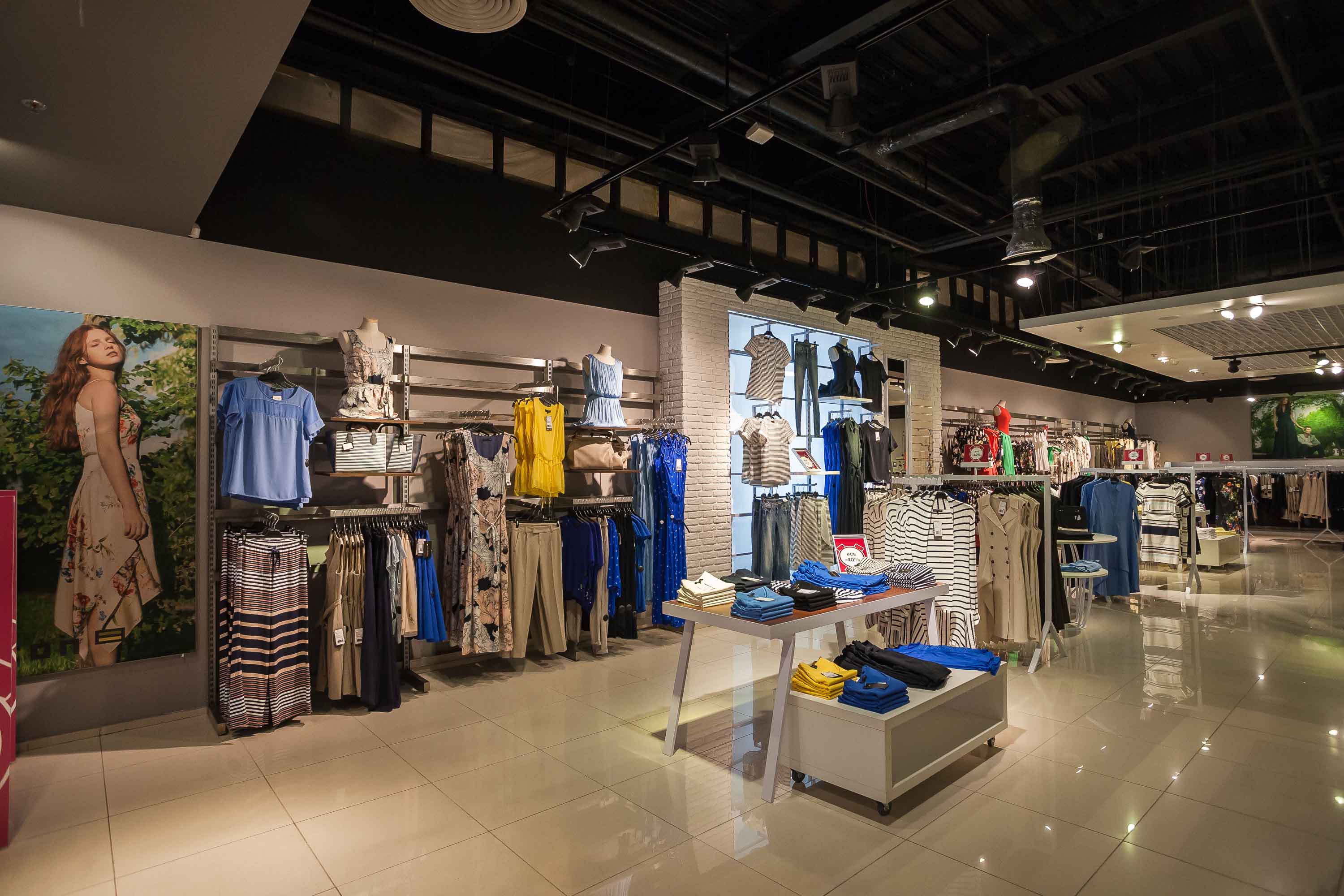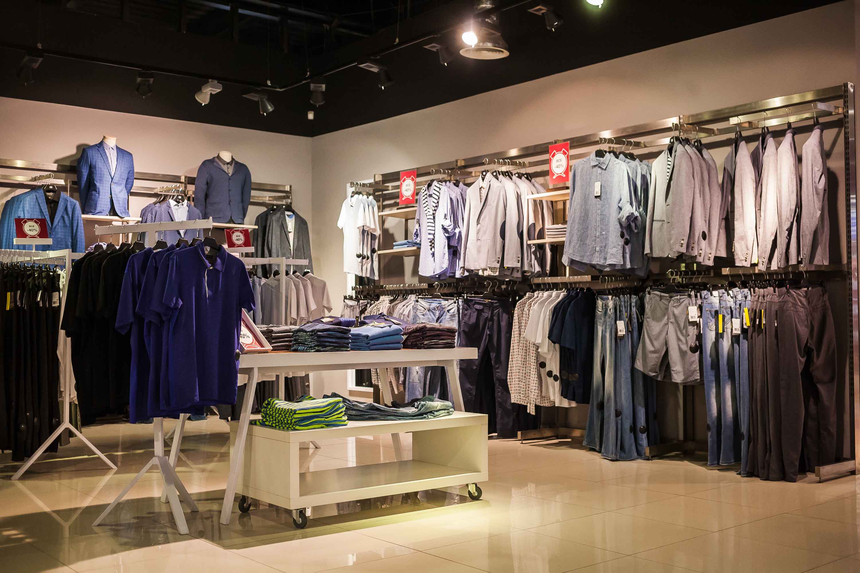 Зал разделен на женскую и мужскую части. Далее одежда выложена исходя из цветового решения коллекции.