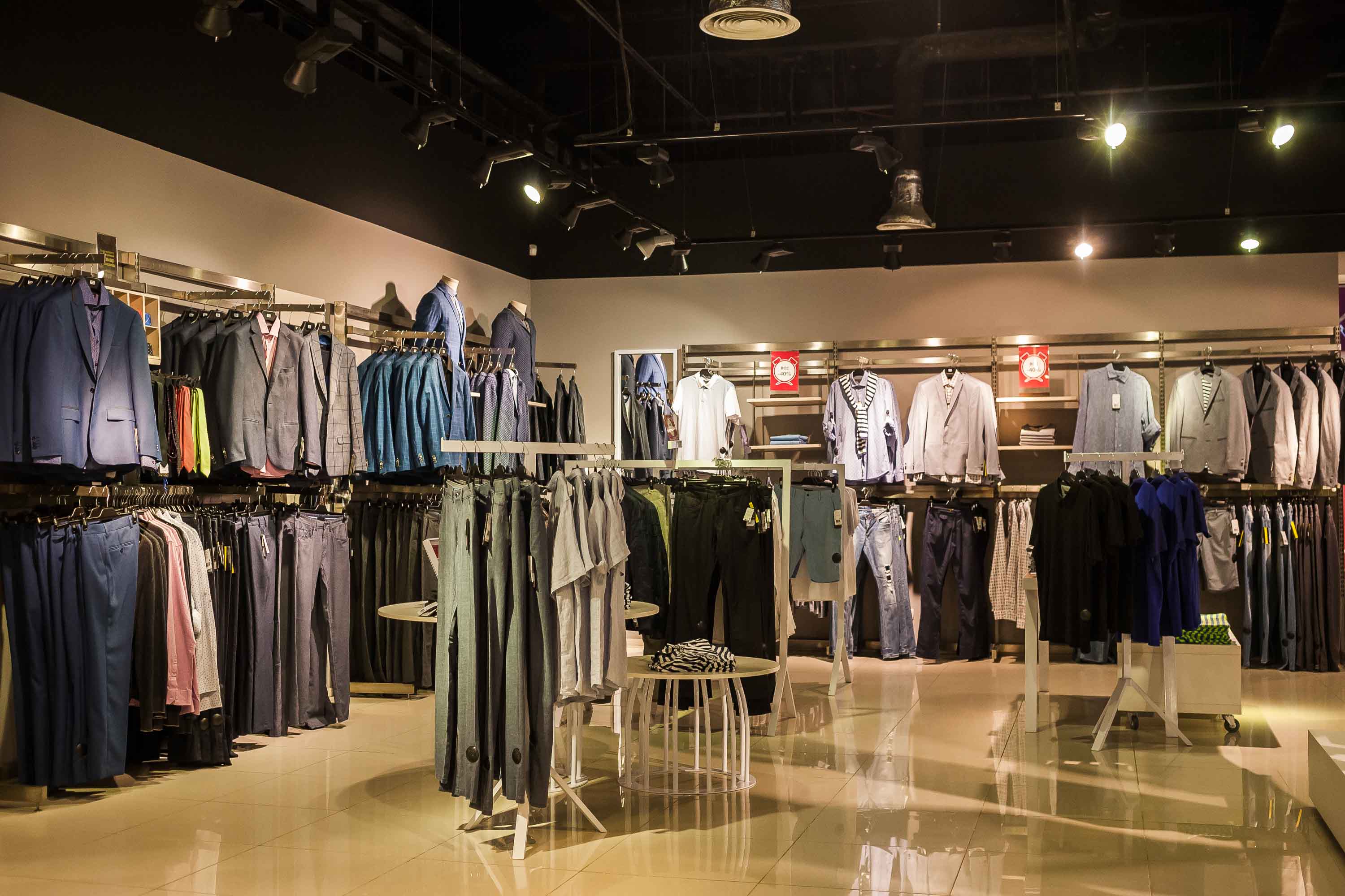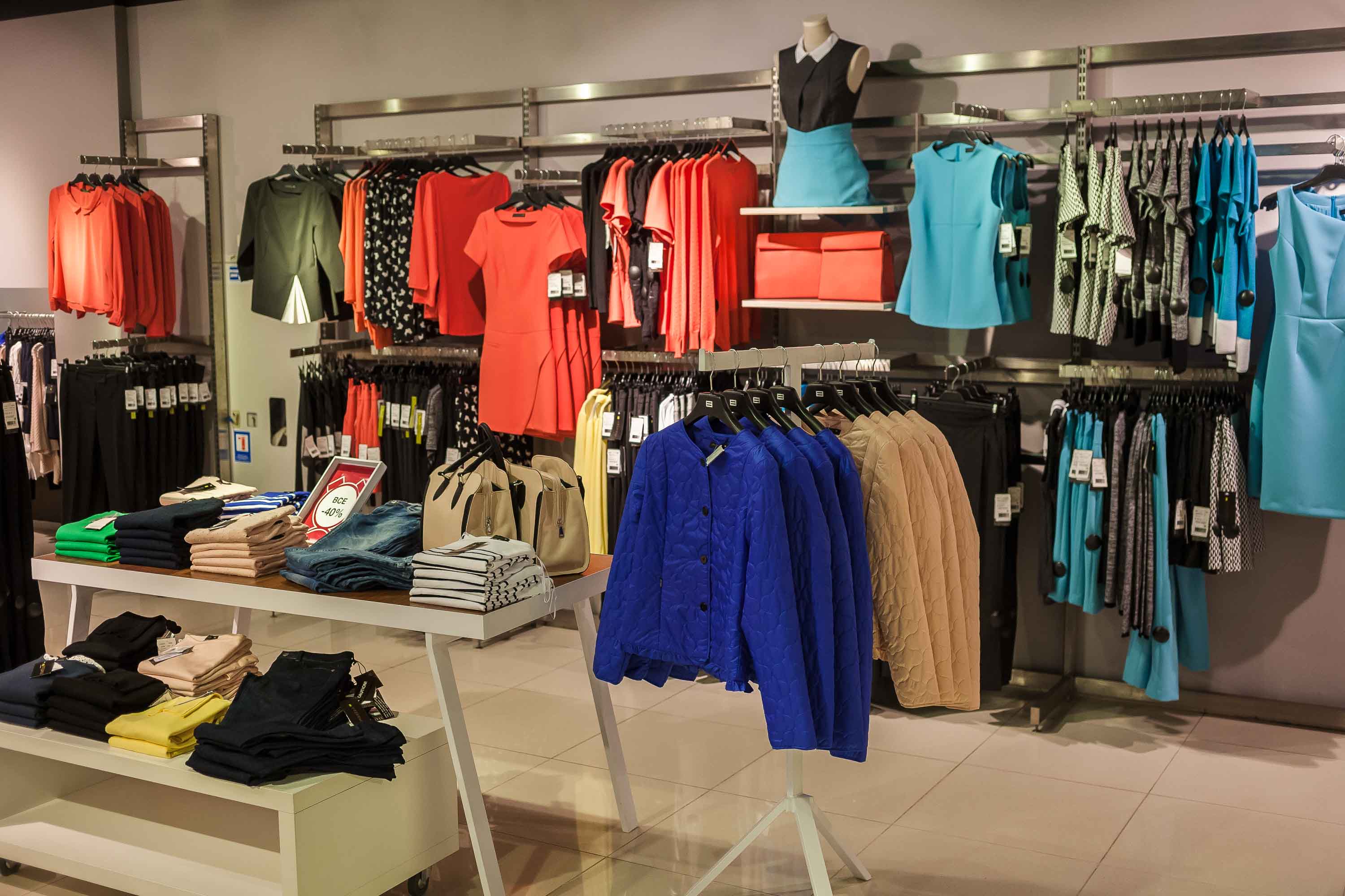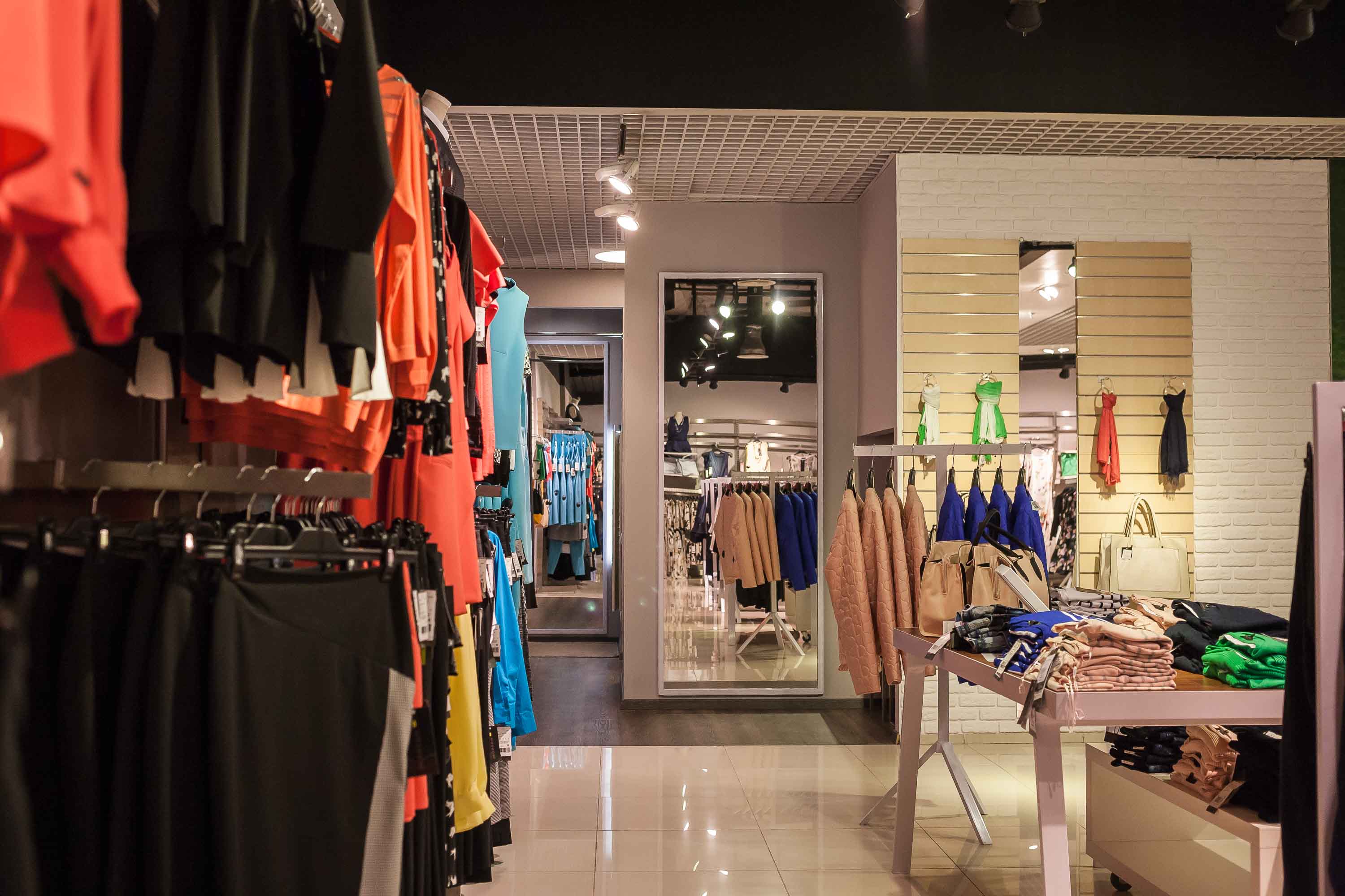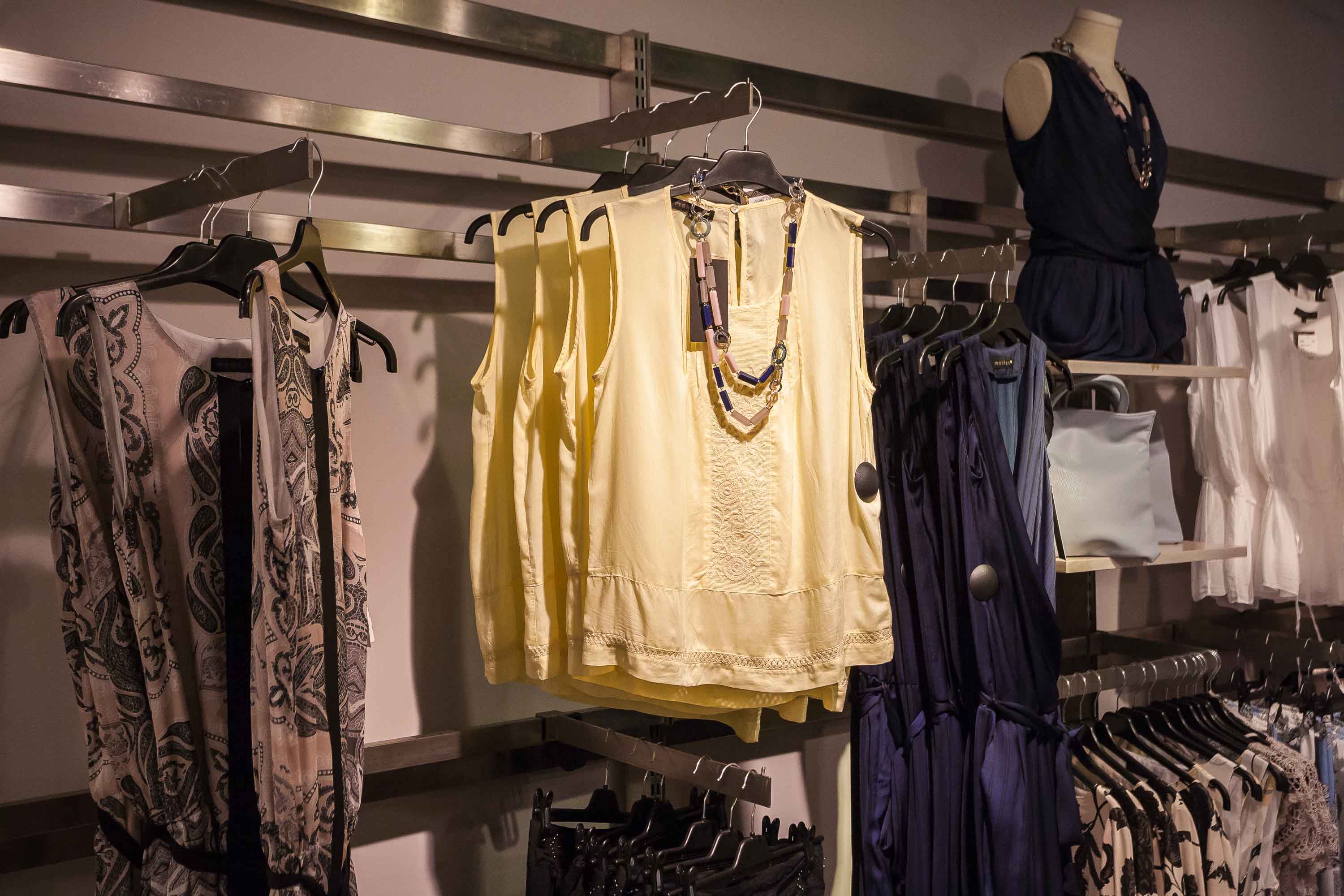 Зал разделен на женскую и мужскую части. Далее одежда выложена исходя из цветового решения коллекции.
