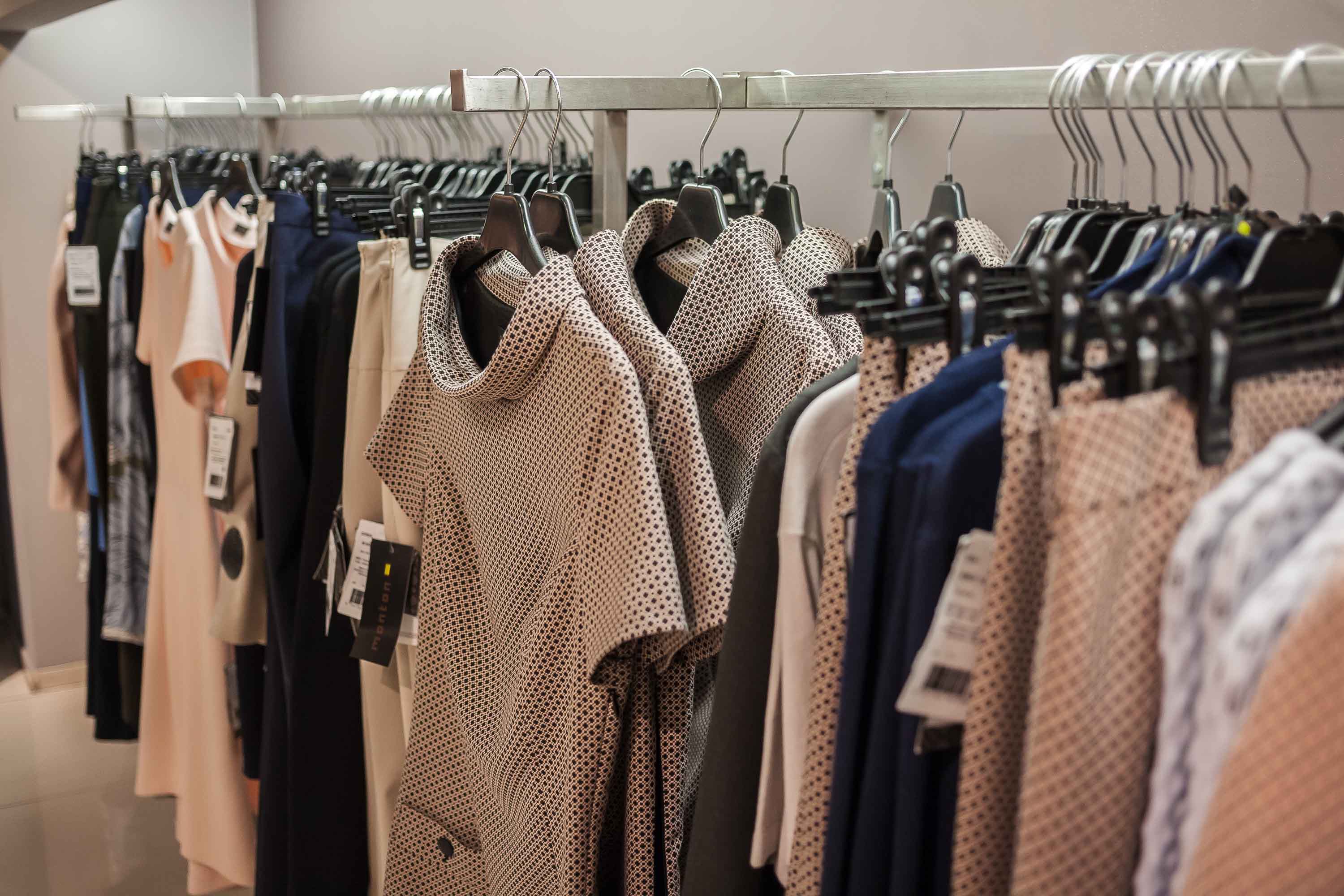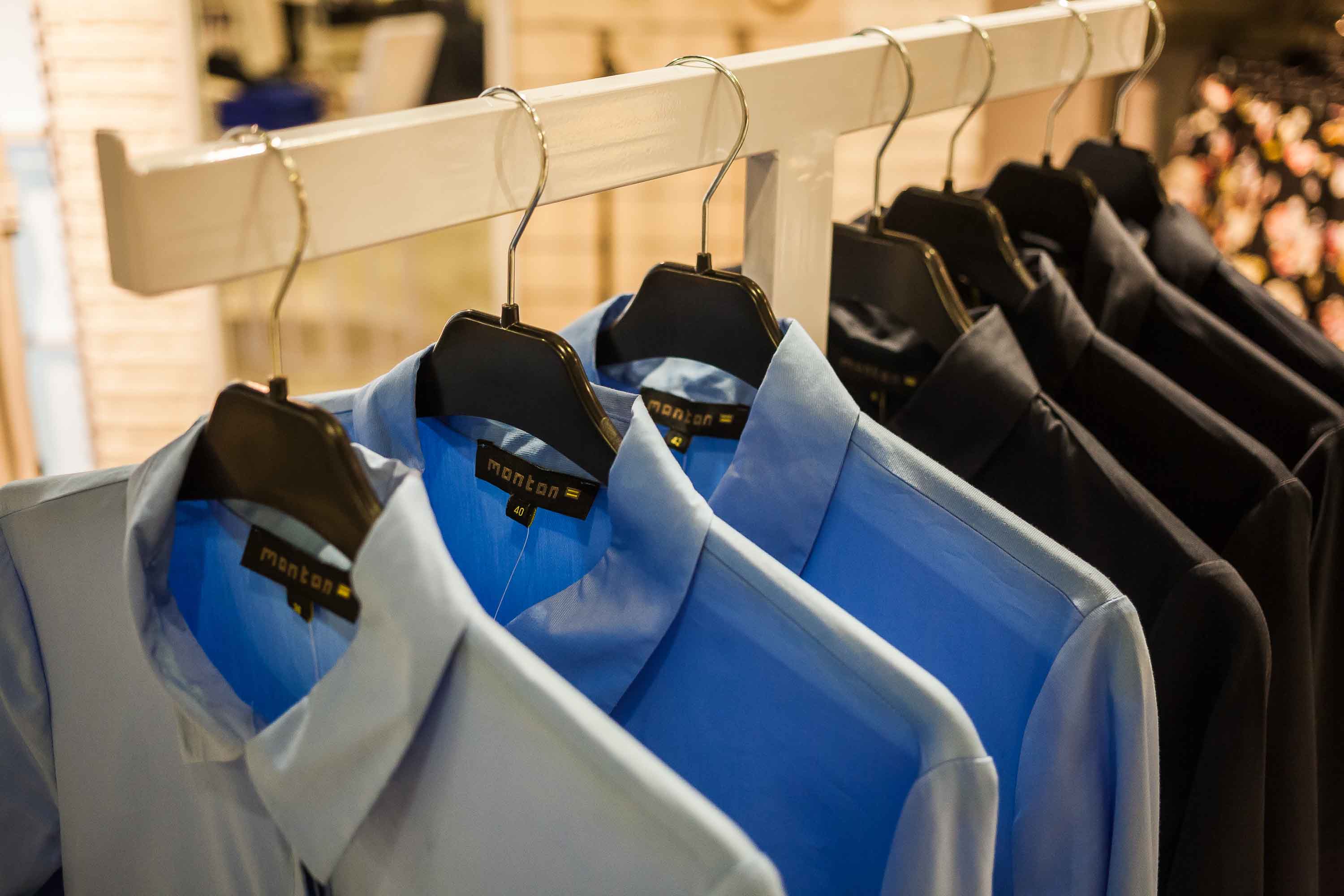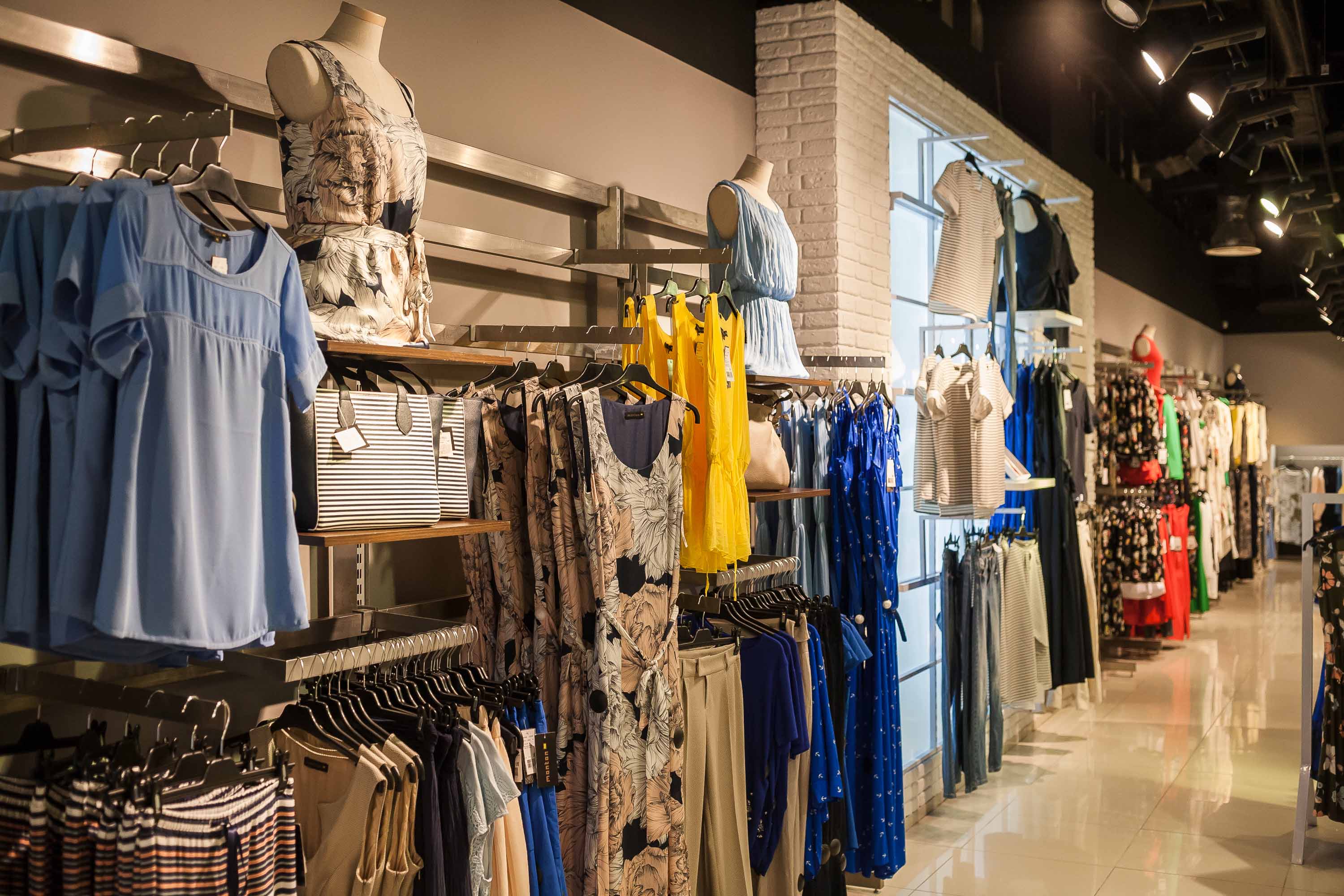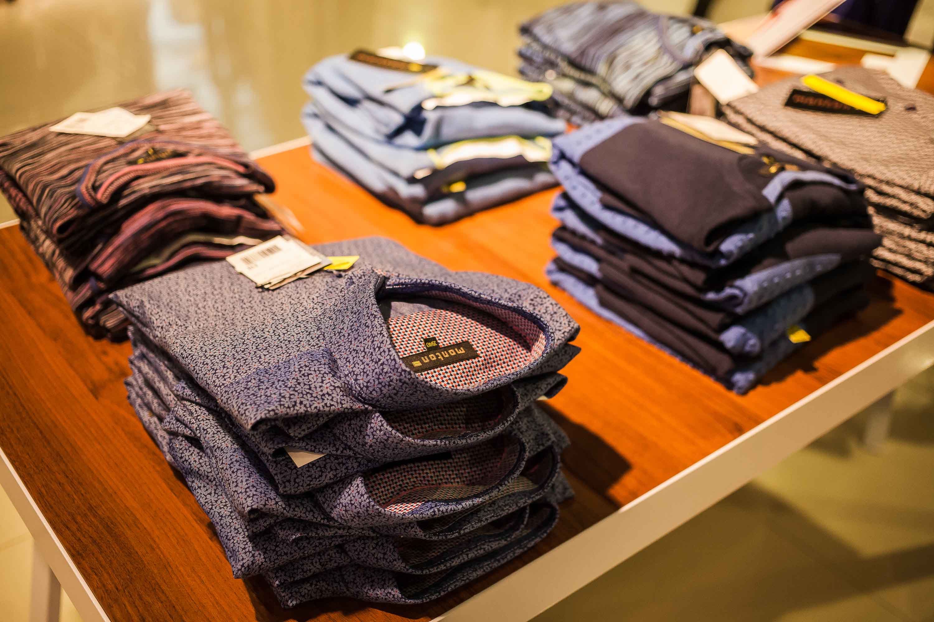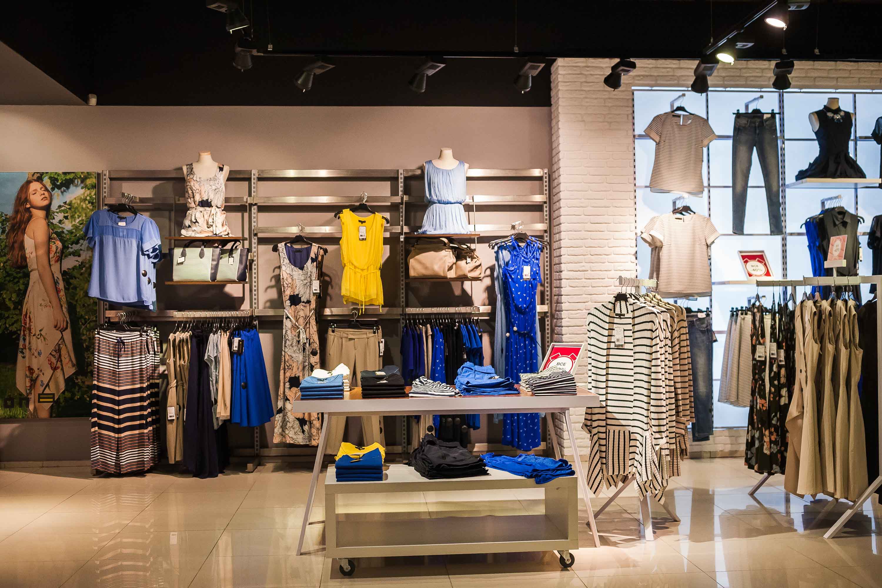 Зал разделен на женскую и мужскую части. Далее одежда выложена исходя из цветового решения коллекции.