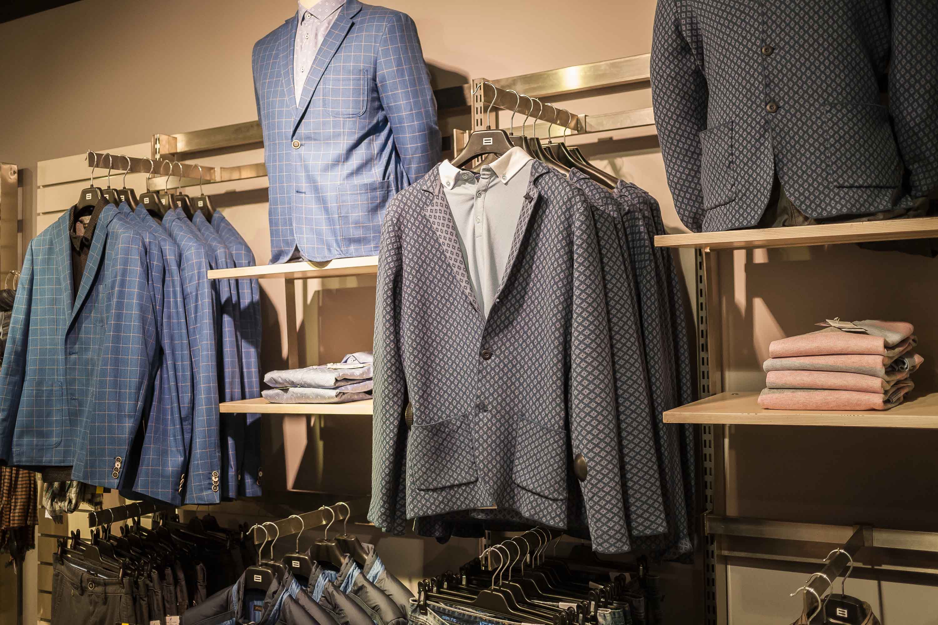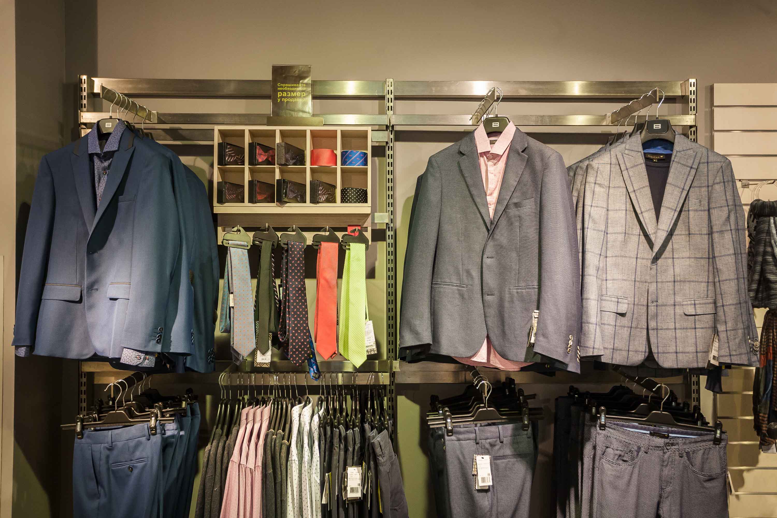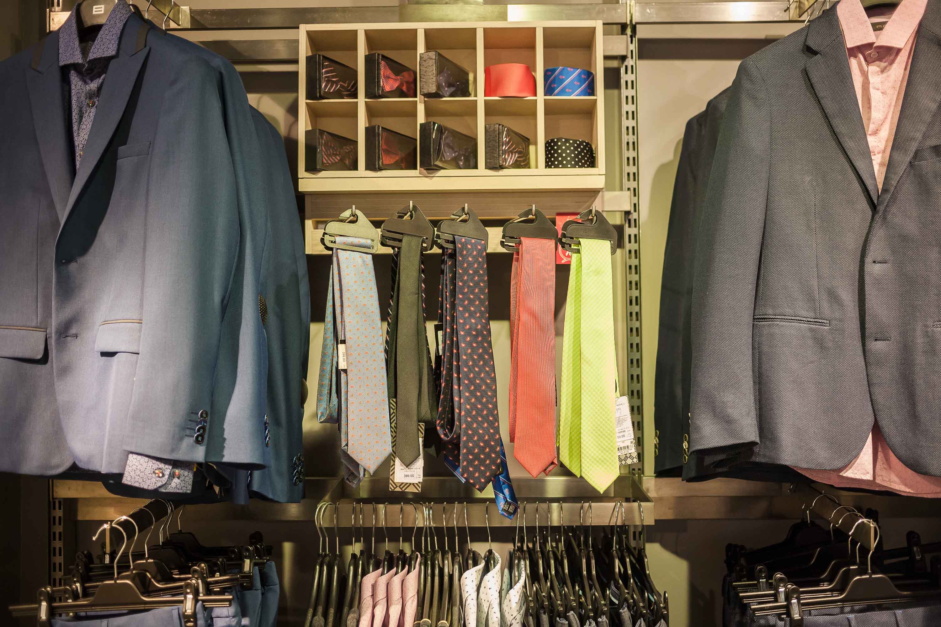 Рядом с пиджаками и рубашками органично смотрятся стеллажи с набором галстуков разных расцветок.
