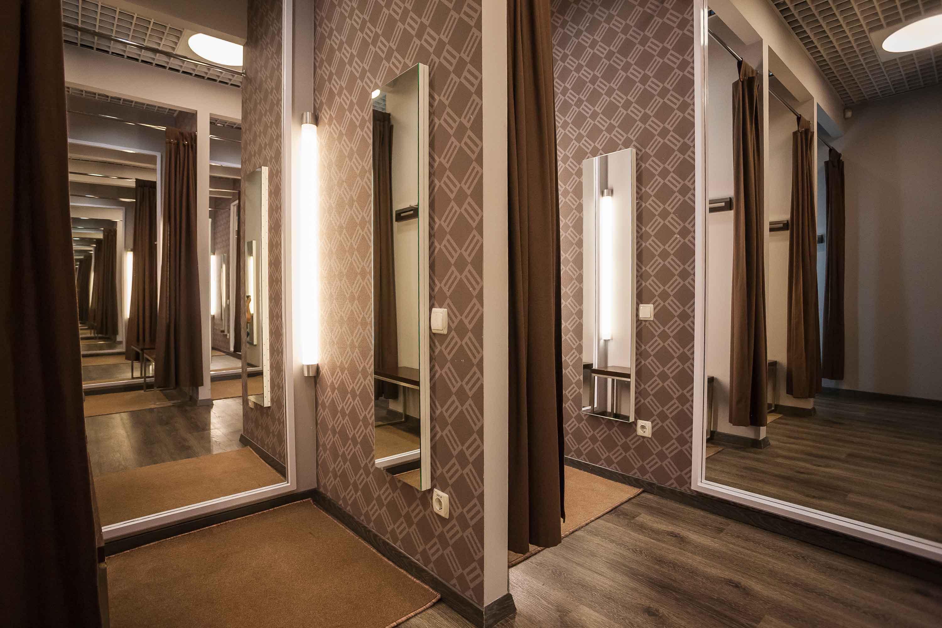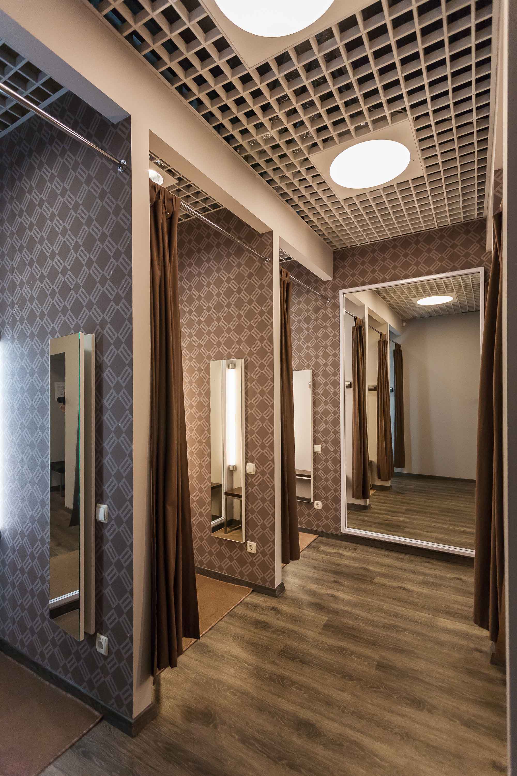 Примерочные за счет светлых тонов отделки, зеркал и яркого освещения выглядят очень просторными.