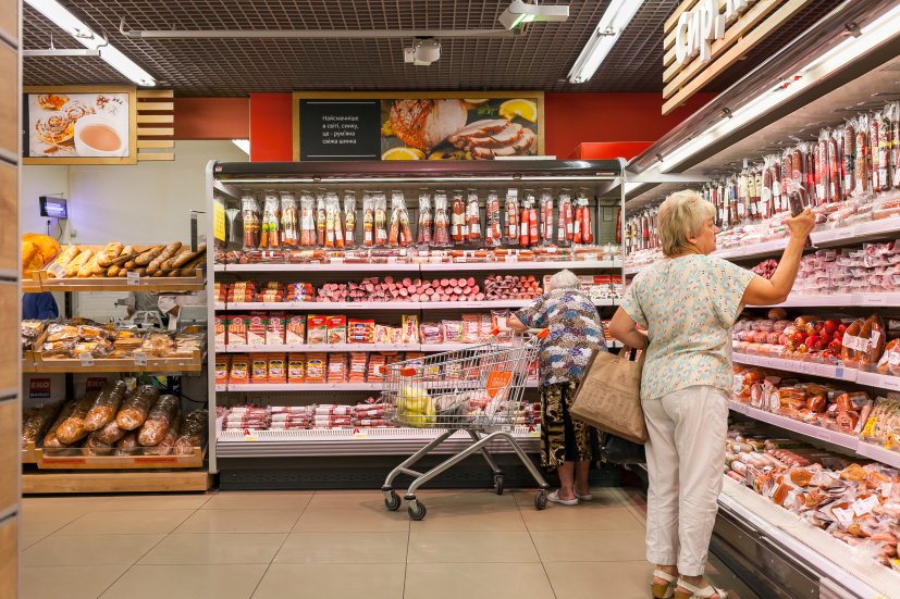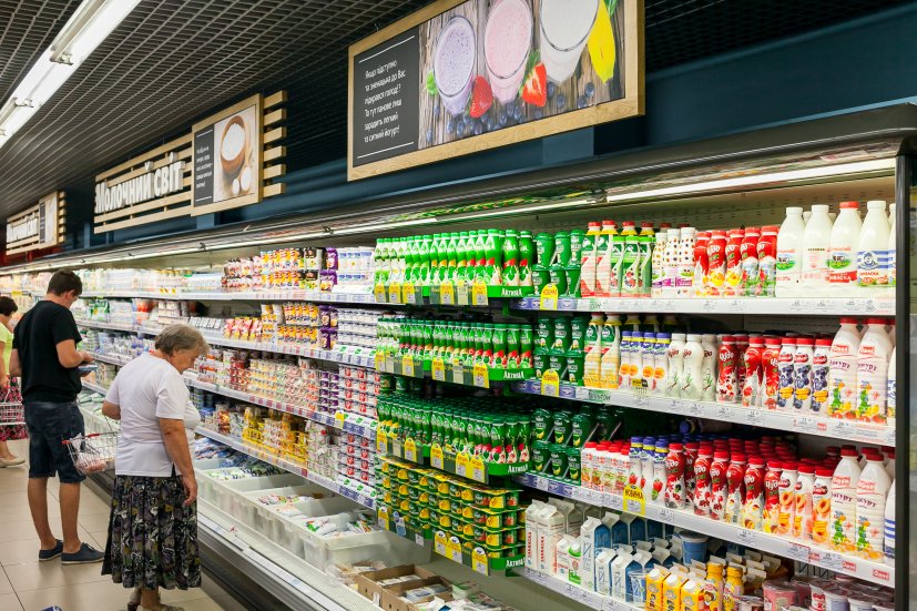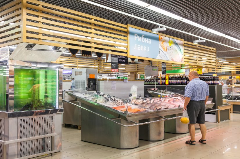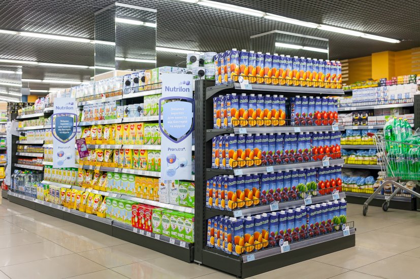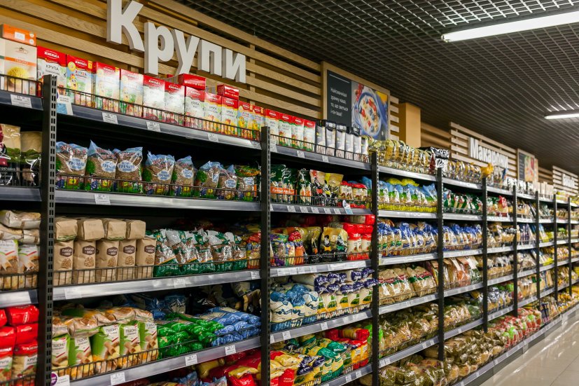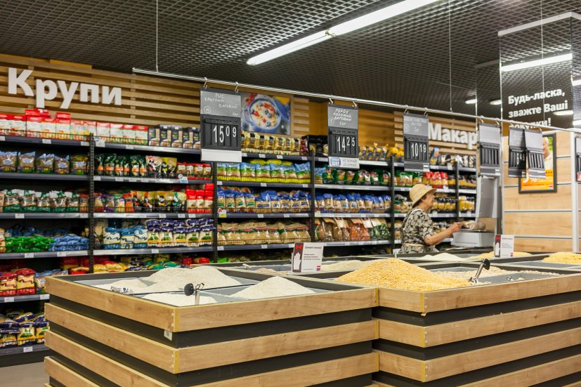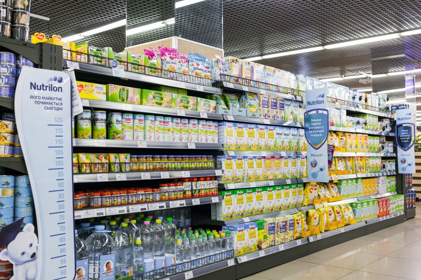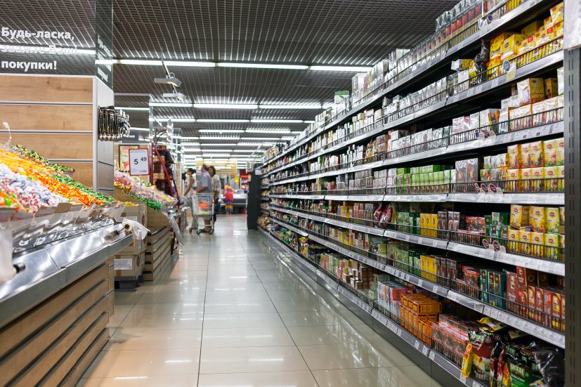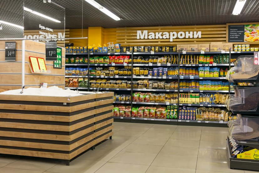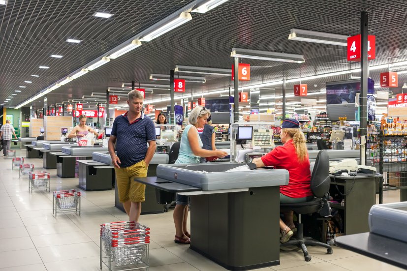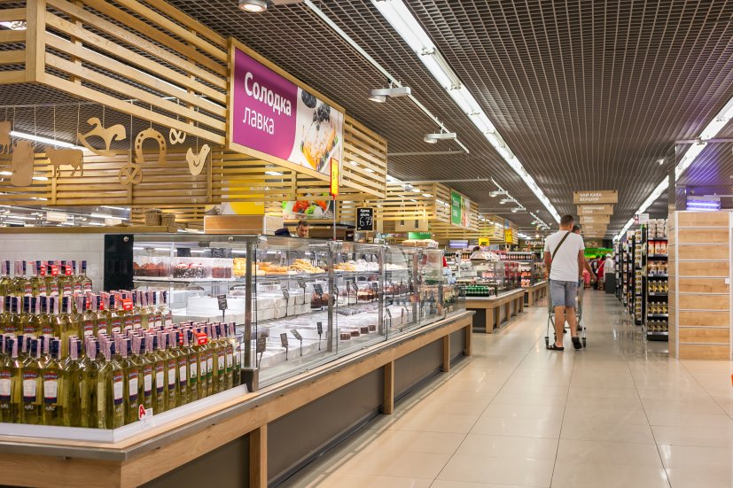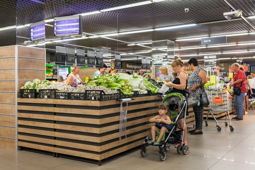 Большая площадь супермаркета позволяет оставить широкие проходы для посетителей с тележками и колясками.
