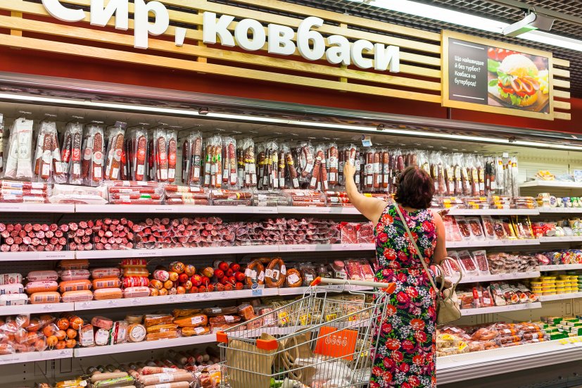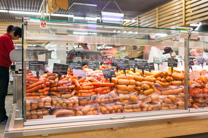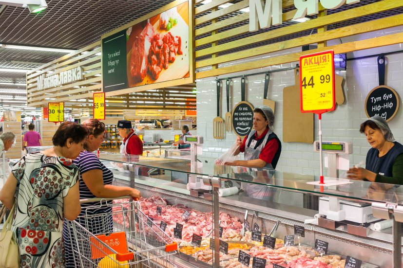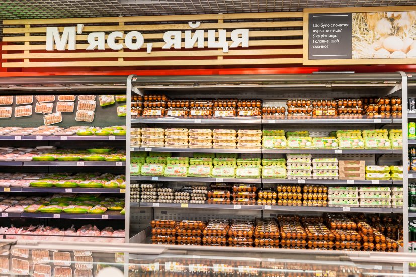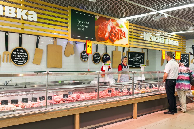 Для дифференциации «Мясной лавки» от других зон в магазине используются яркие визуальные акценты в форме разделочных досок, кухонных принадлежностей, сковородок и других элементов, которые добавляют ощущение выбора мяса на фермерском рынке.