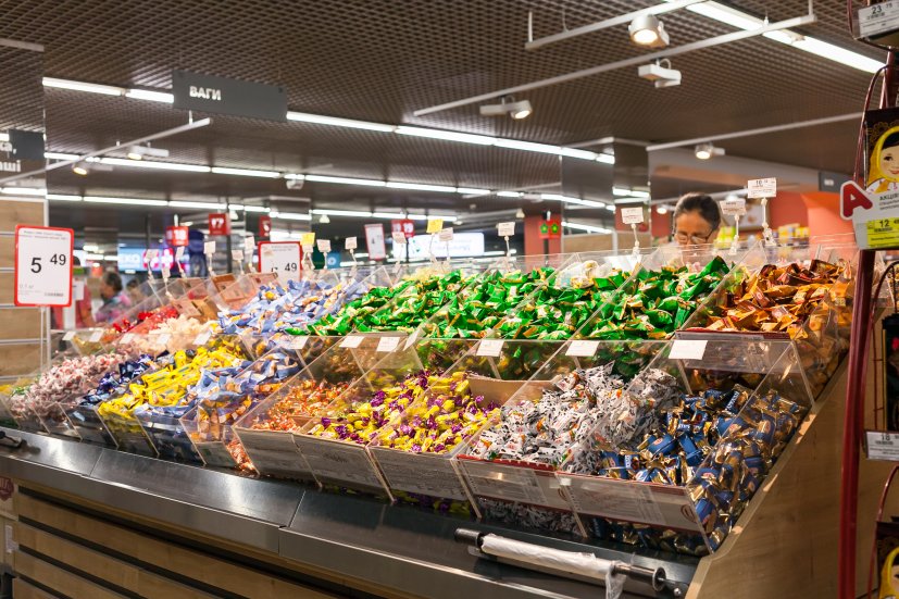 Эргономичное расположение отсеков с конфетами (даже самые дальние ящики доступны покупателю) позволяет без привлечения консультантов определить, сколько и какого вида конфет нужно взять на взвешивание. Выполненные под наклоном пластиковые короба помогают максимально показать, что находится внутри.