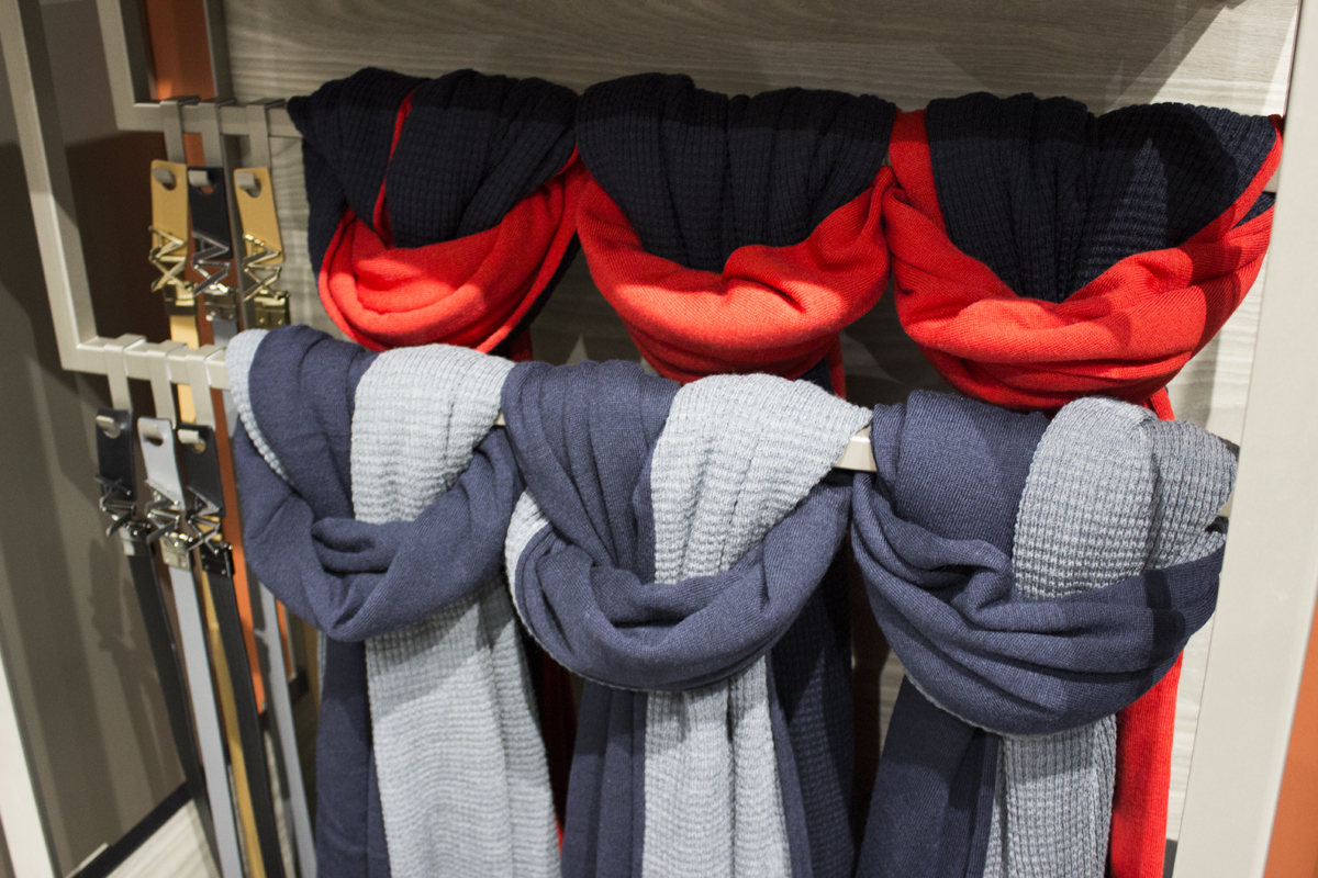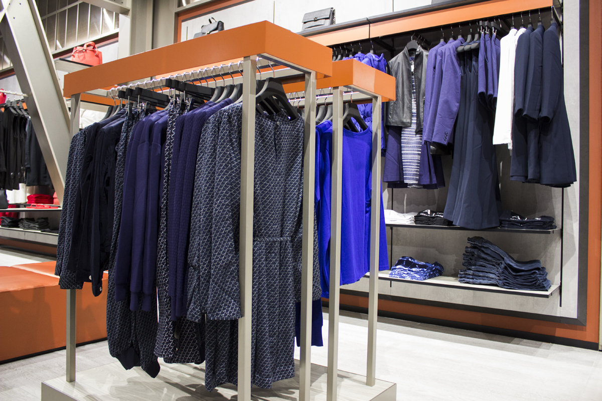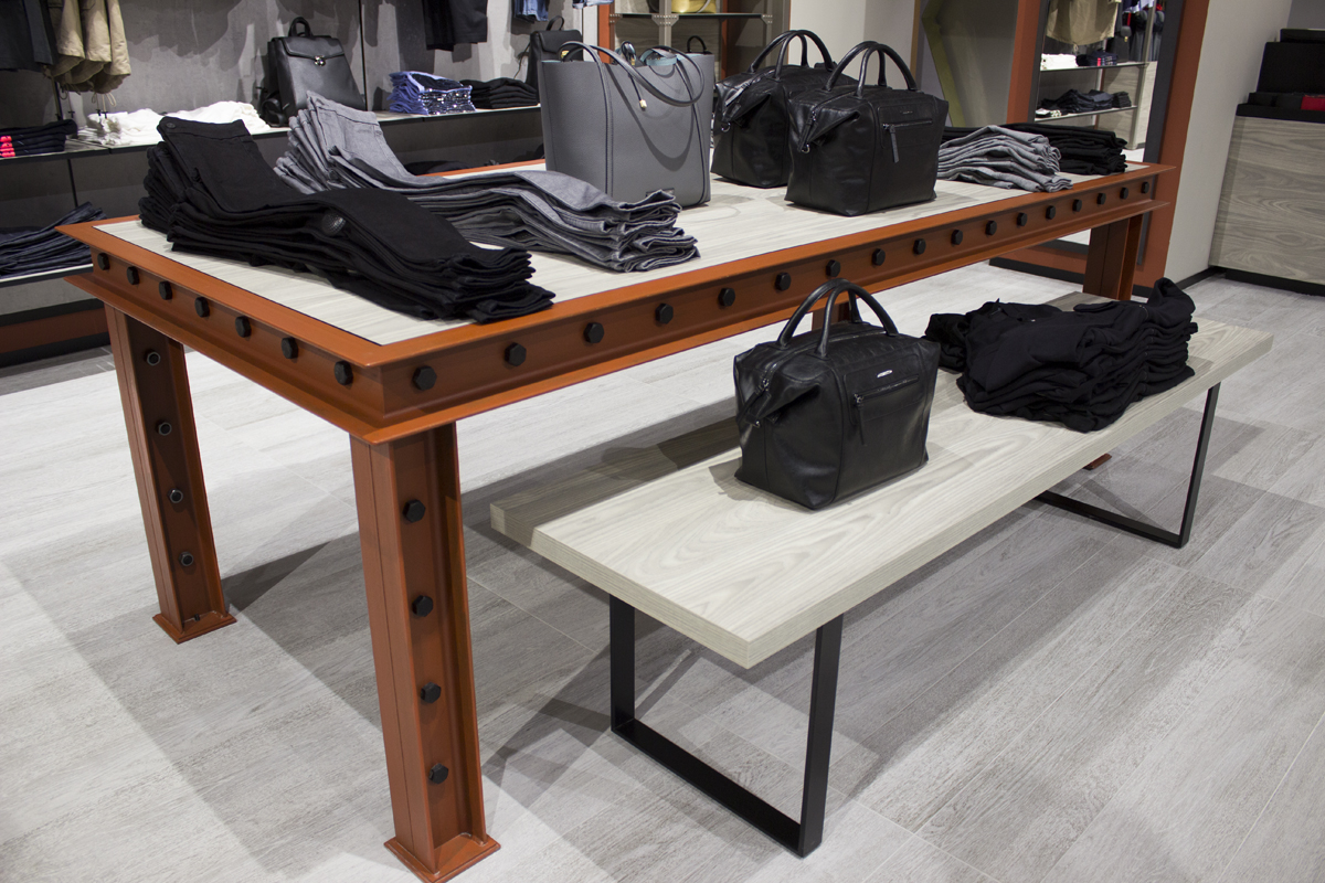 Магазин выдержан в концептуальном стиле модерн: открытое пространство торгового зала, светлый интерьер, металлический декор с яркими оранжевыми вставками.