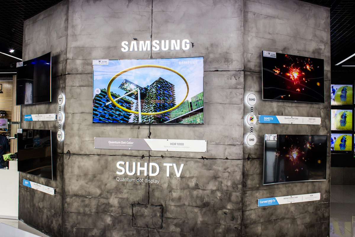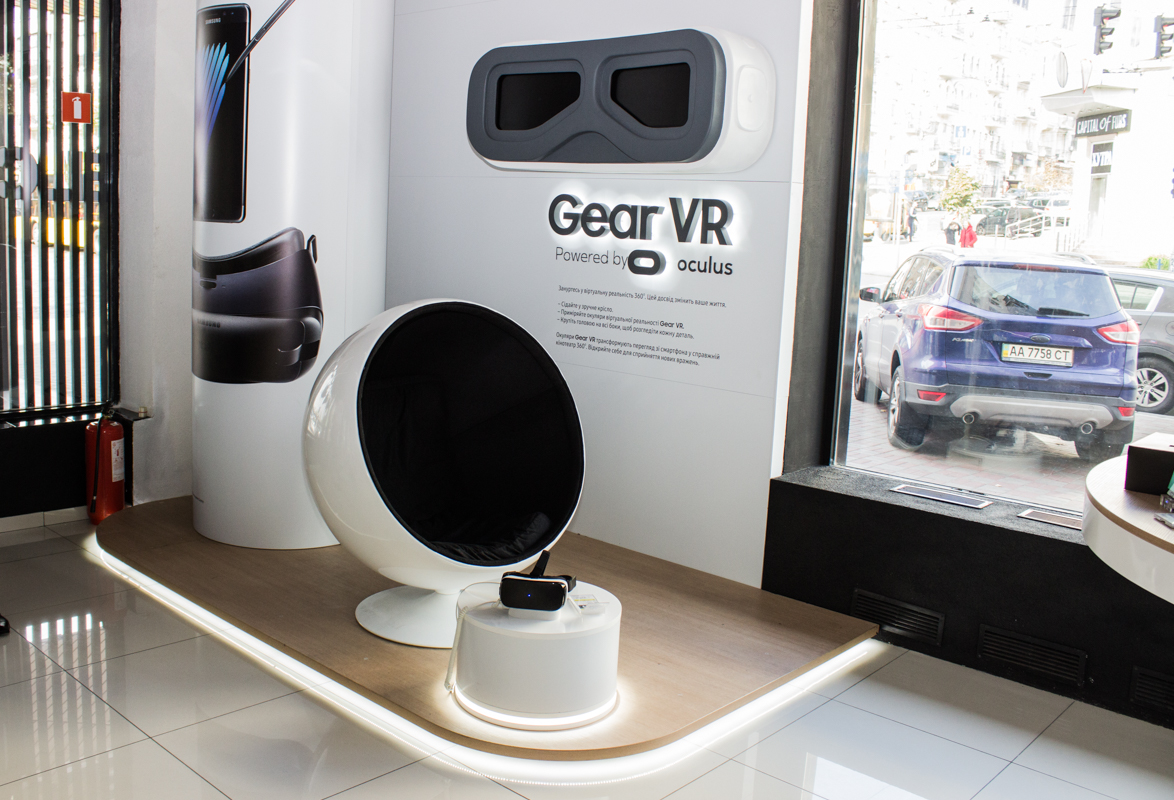 Пространство зала разбито на сектора, их разделяют колонна Apple и колонна Samsung, а также зона для тестирования очков виртуальной реальности от этого бренда.